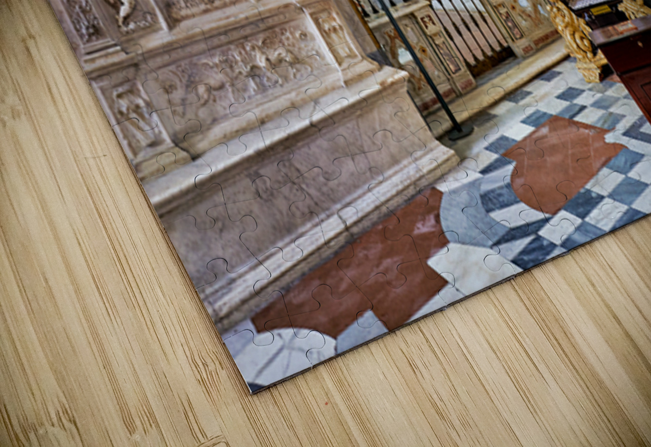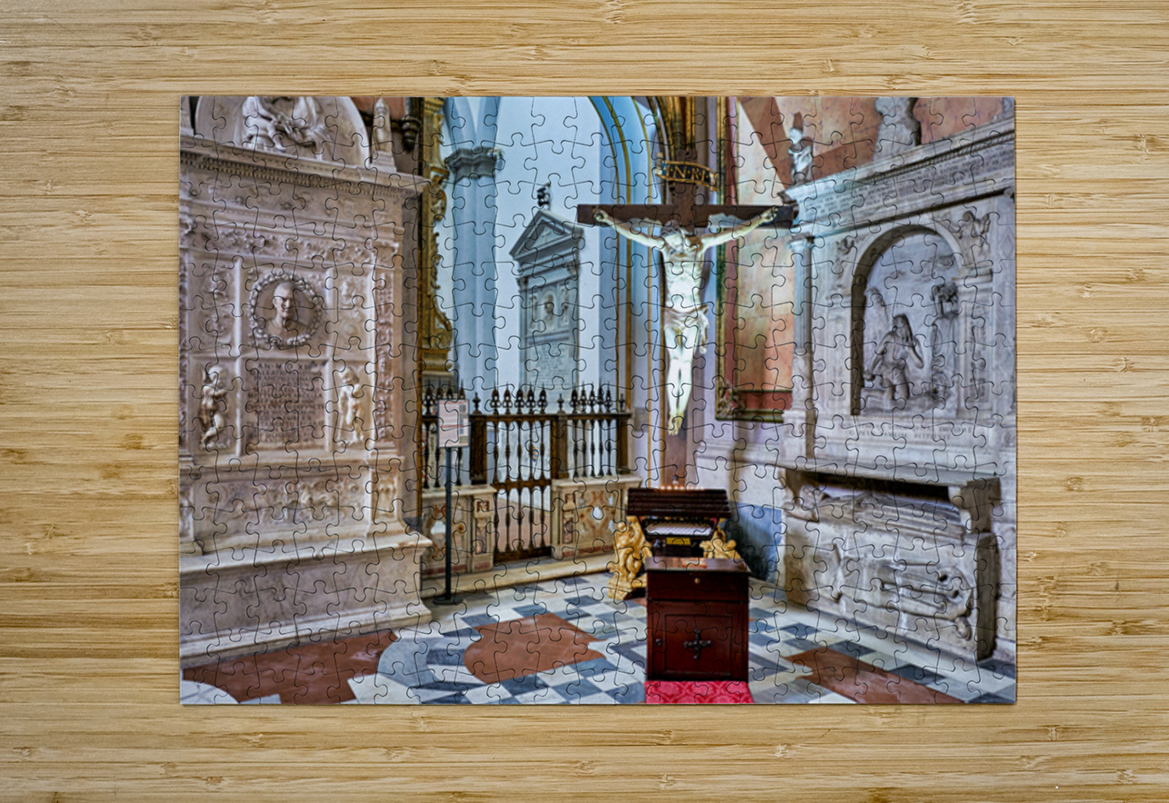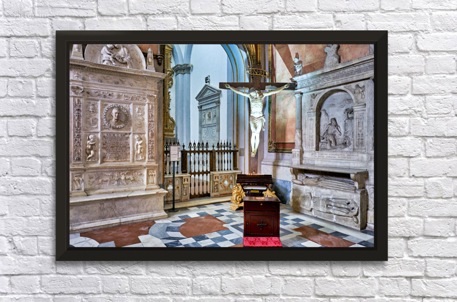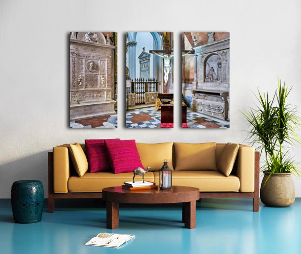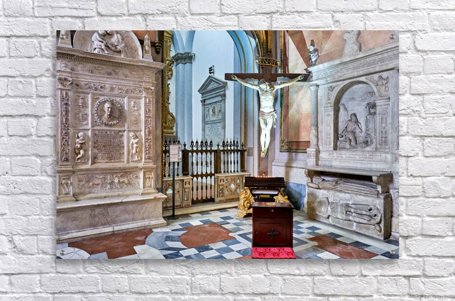 The altar area shows stone carvings and a crucifix in San Domenico Maggiore church a Gothic church in Naples Italy.
