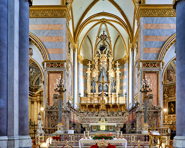 Visitors look at the interior of San Domenico Maggiore church in Naples. The church features gothic architecture and detailed designs.