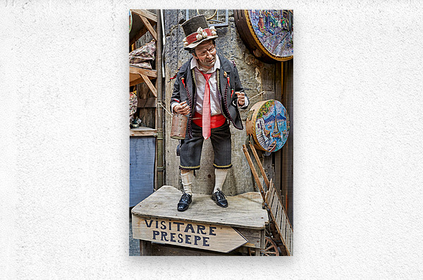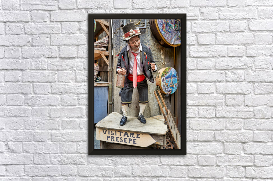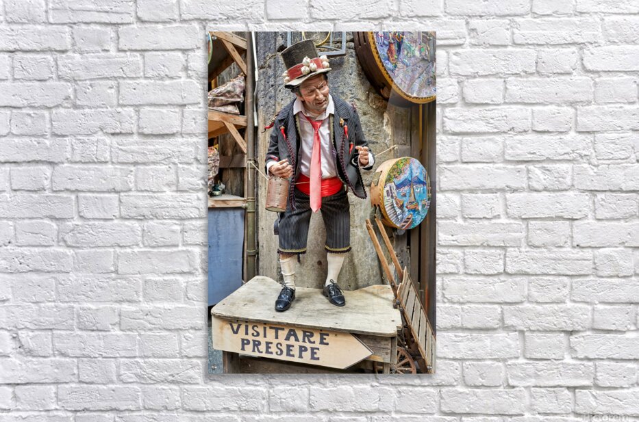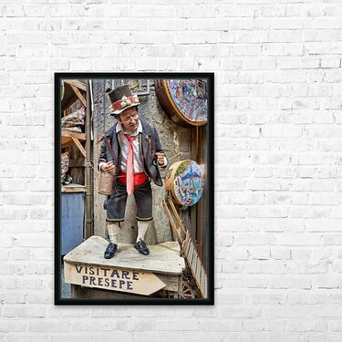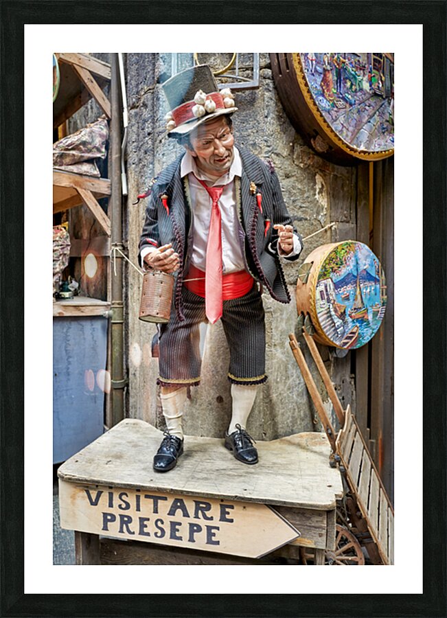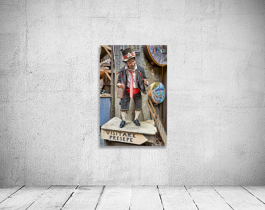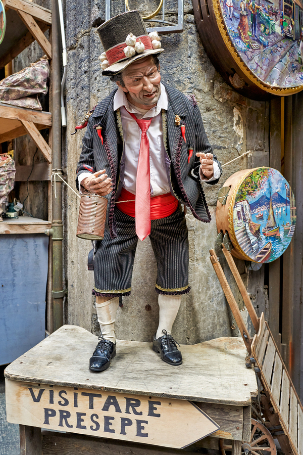 A statue of a man stands in an artisan shop on Via San Gregorio Armeno in Naples. The statue is part of a Christmas nativity scene.