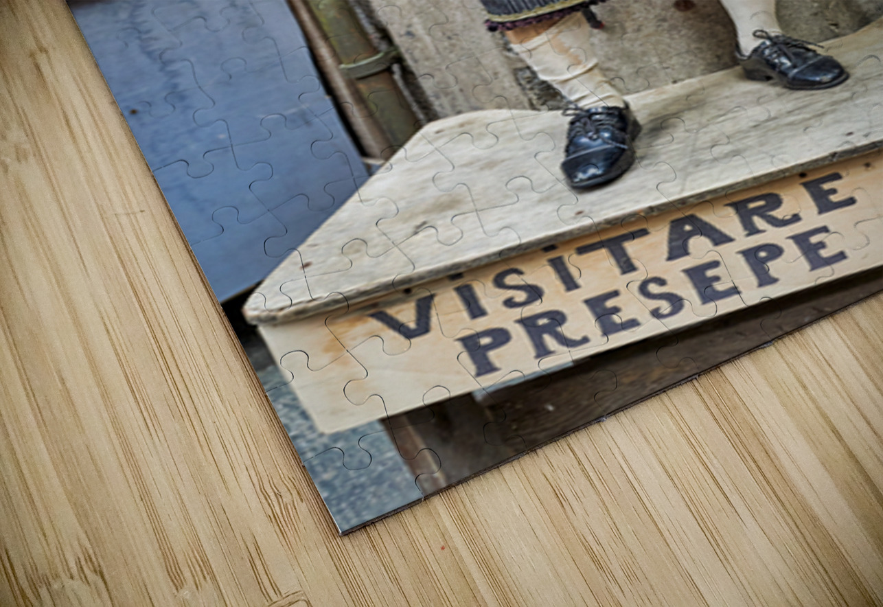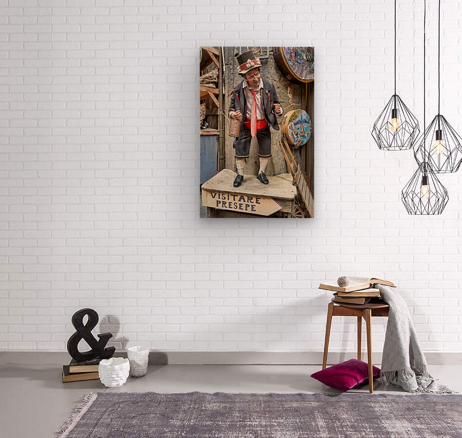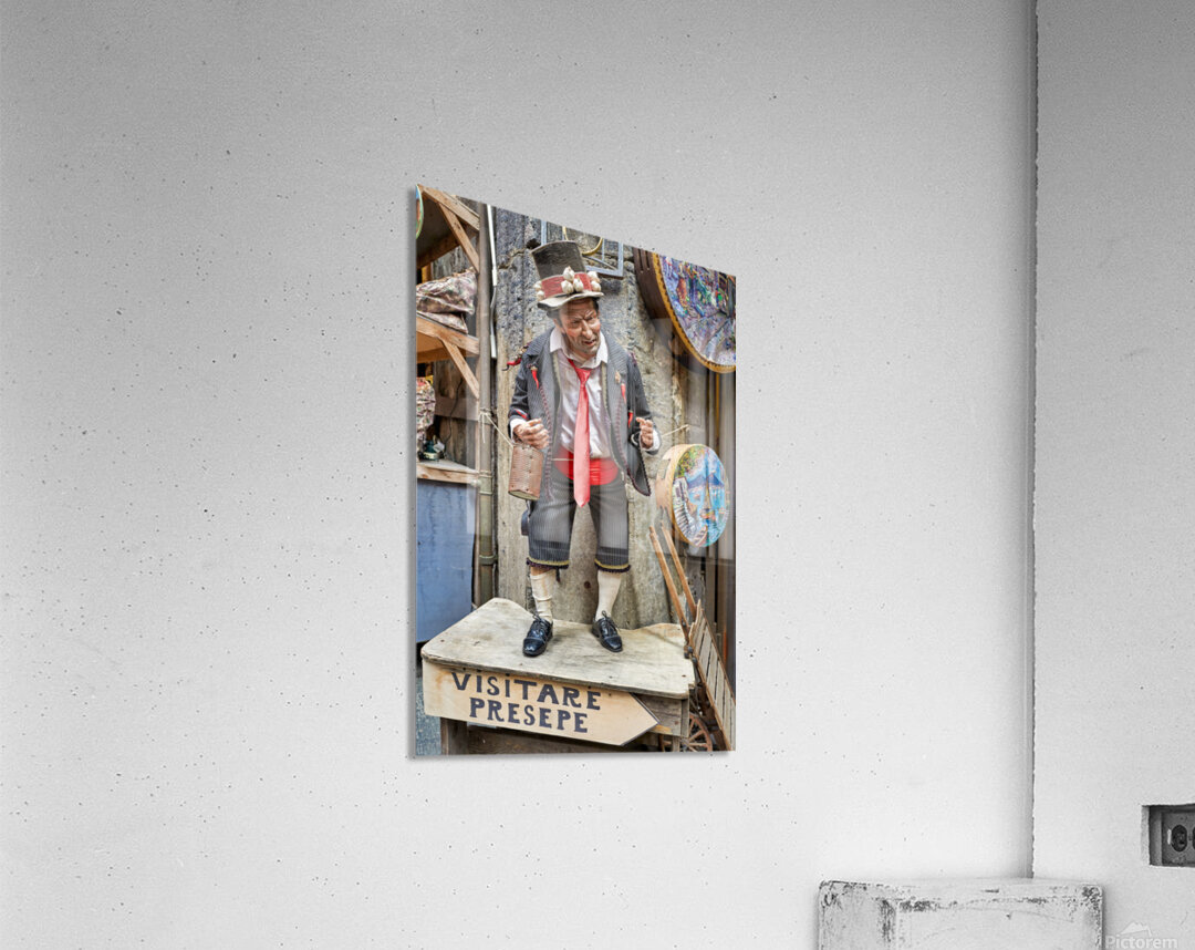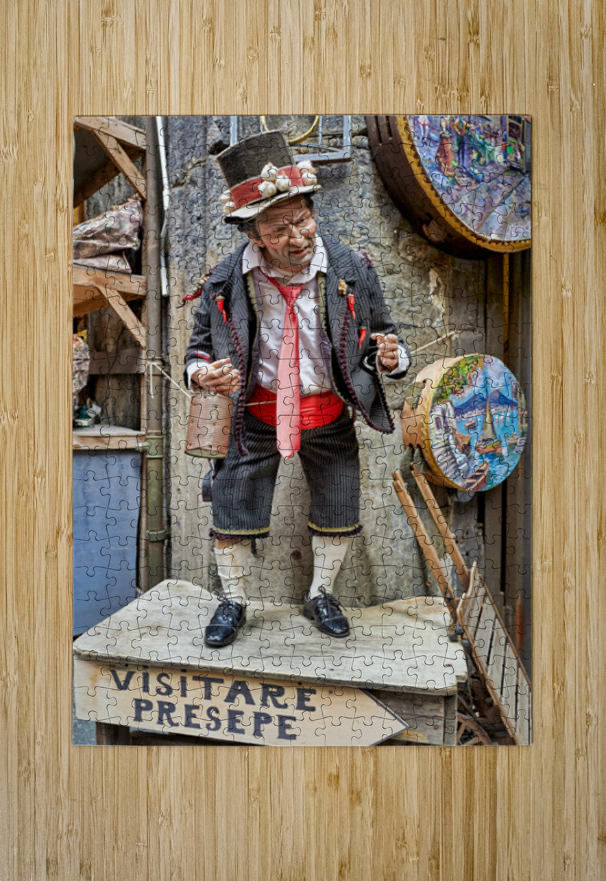A statue of a man stands in an artisan shop on Via San Gregorio Armeno in Naples. The statue is part of a Christmas nativity scene.