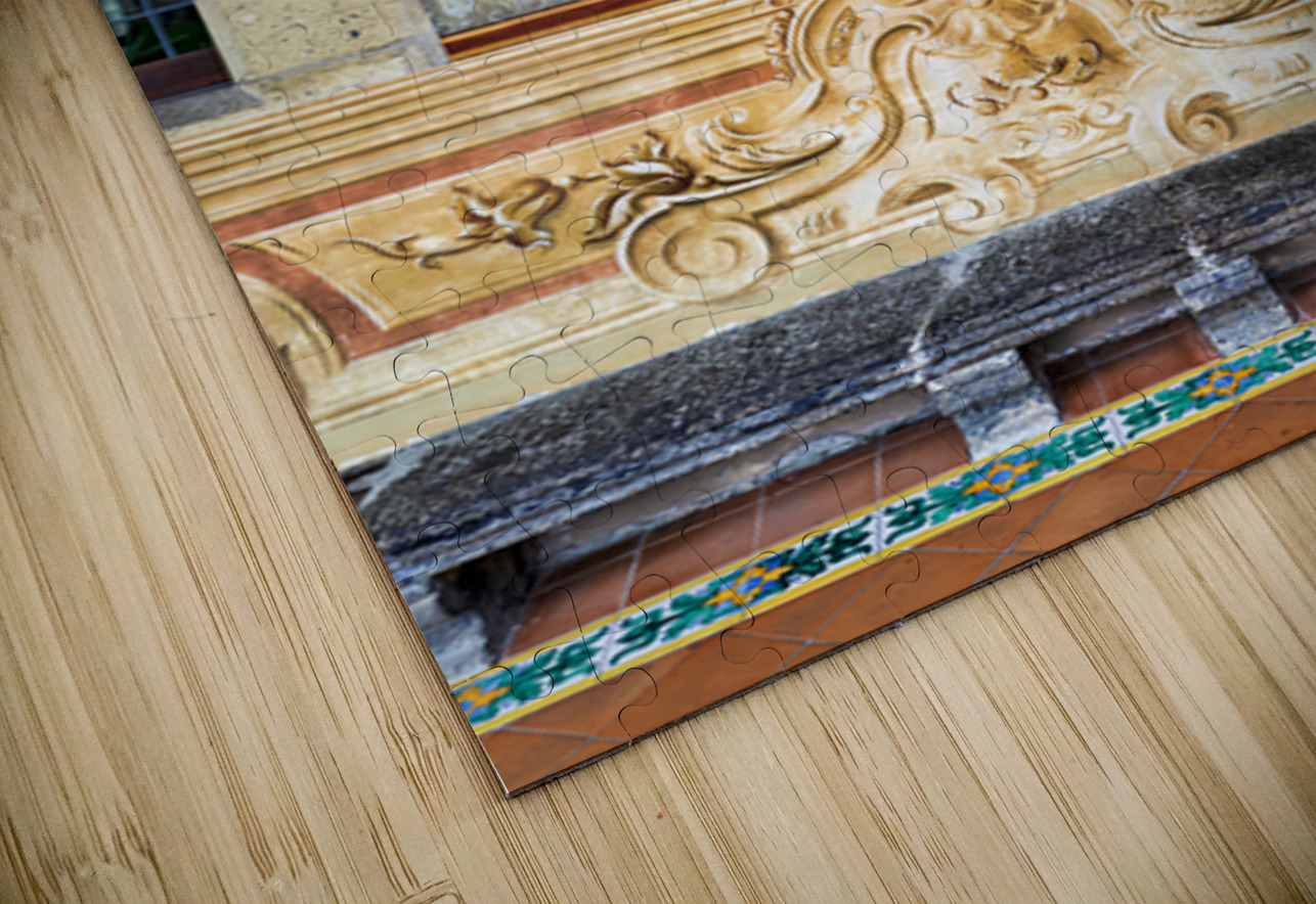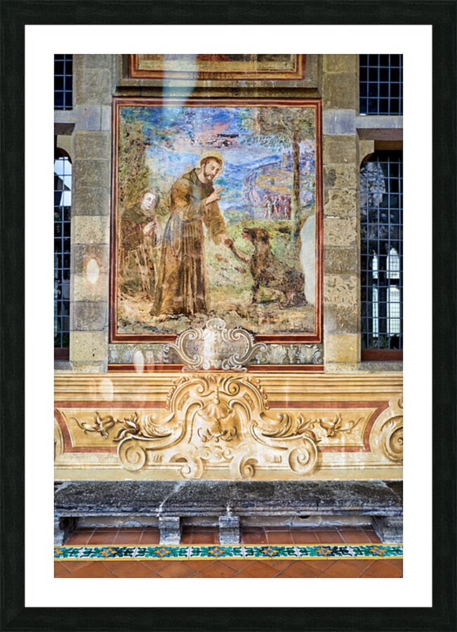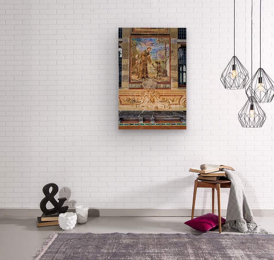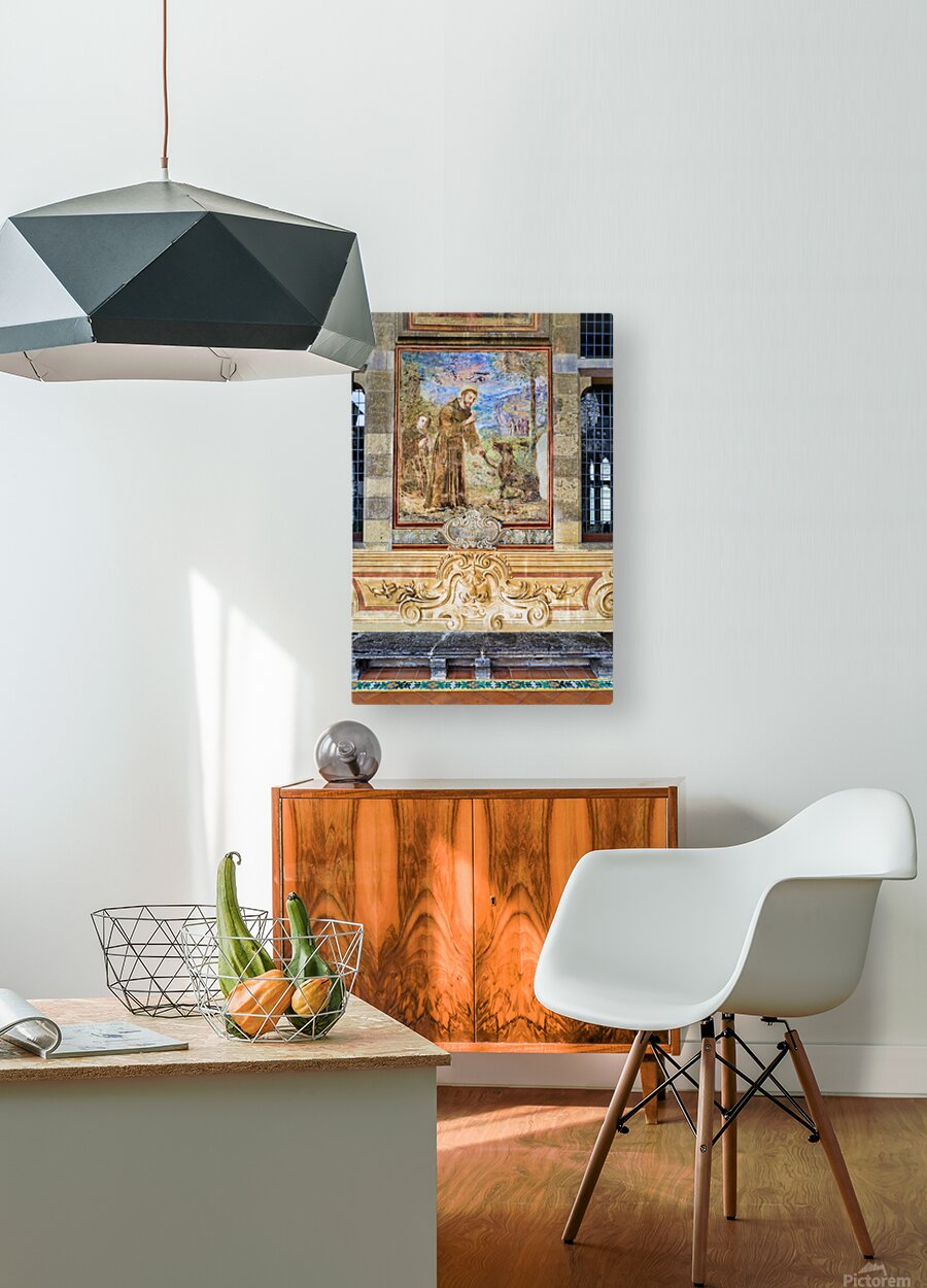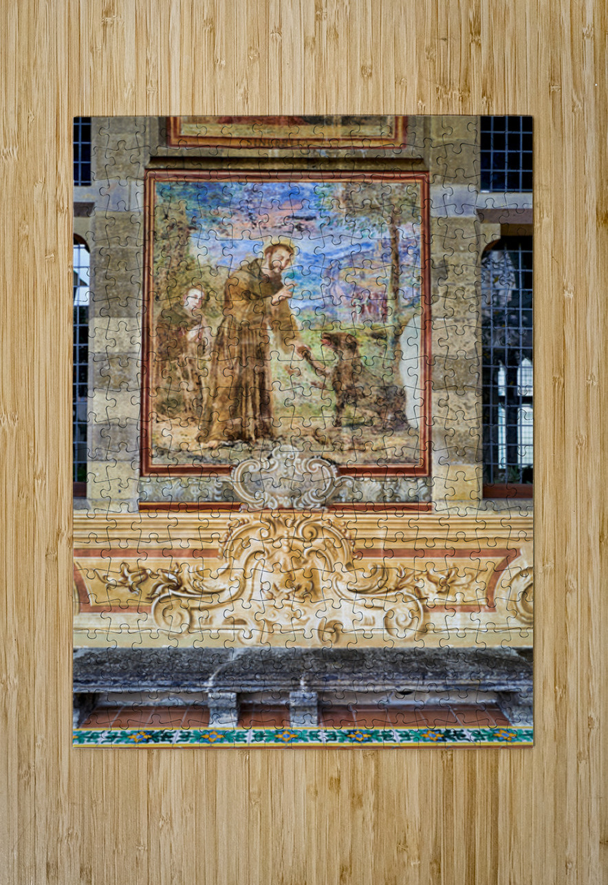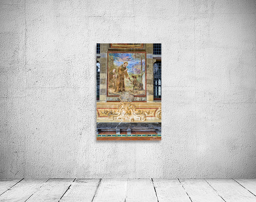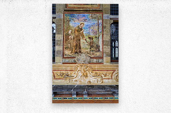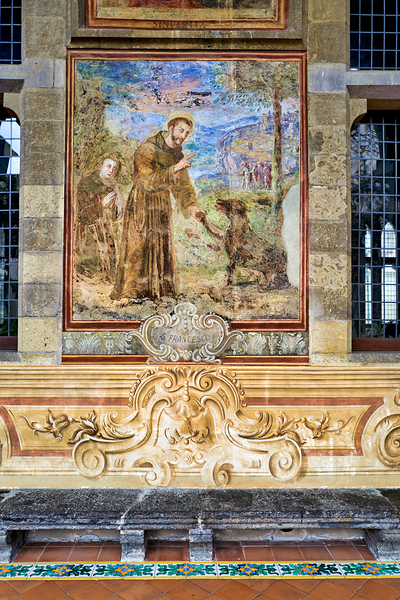 Visitors explore the cloister in Santa Chiara Basilica observing the artwork that tells stories of faith history and culture in Naples Italy.