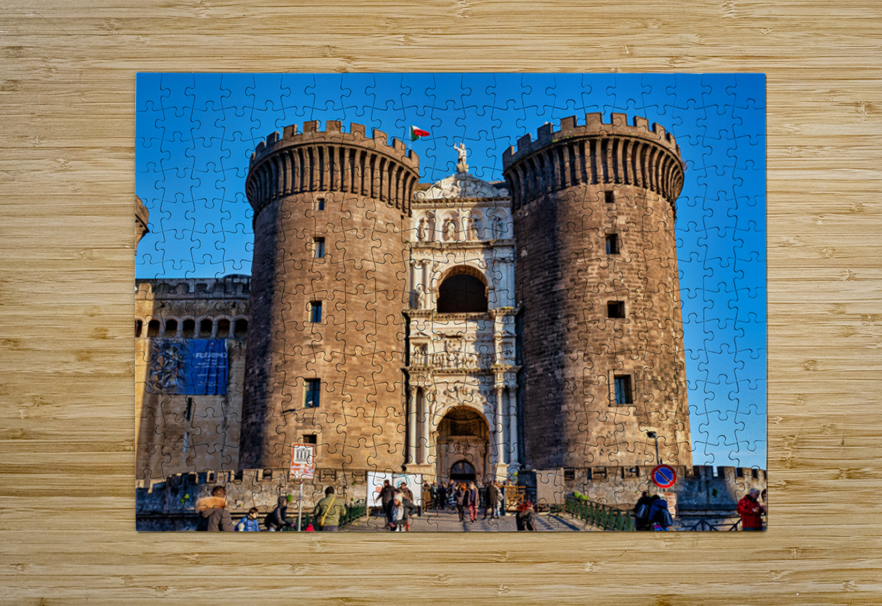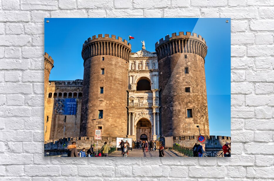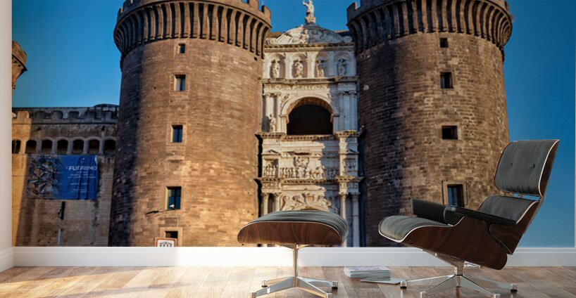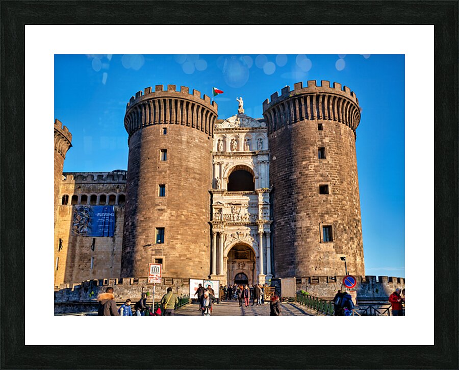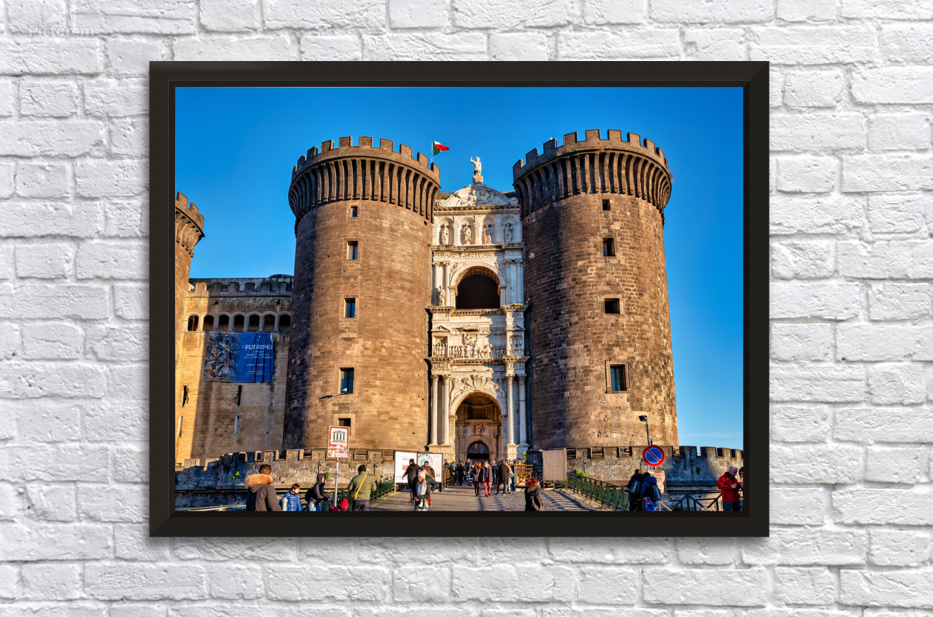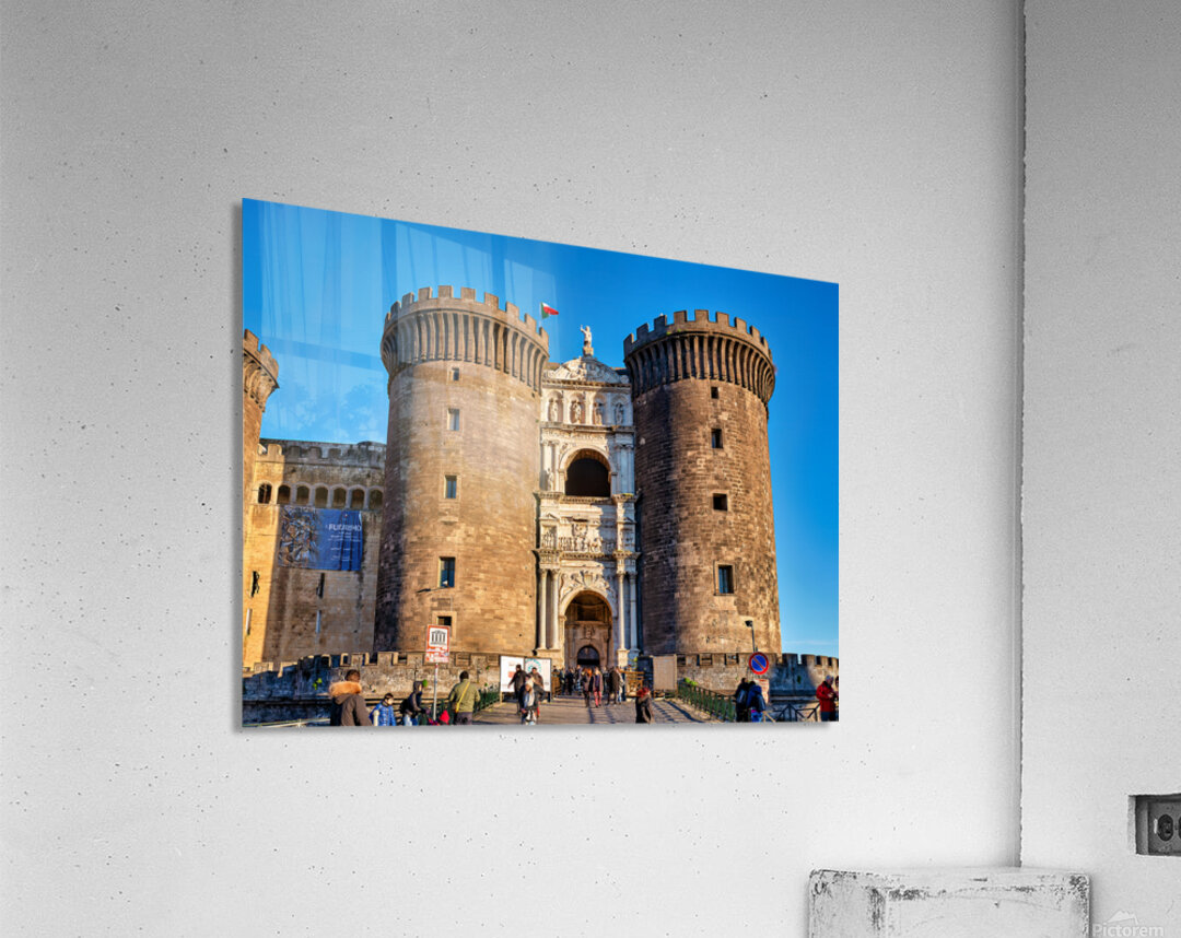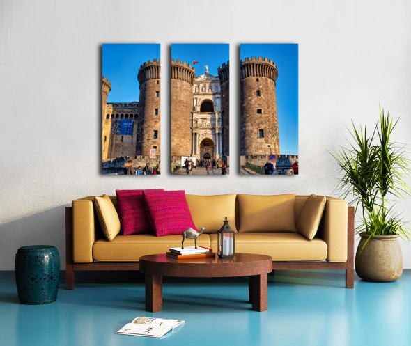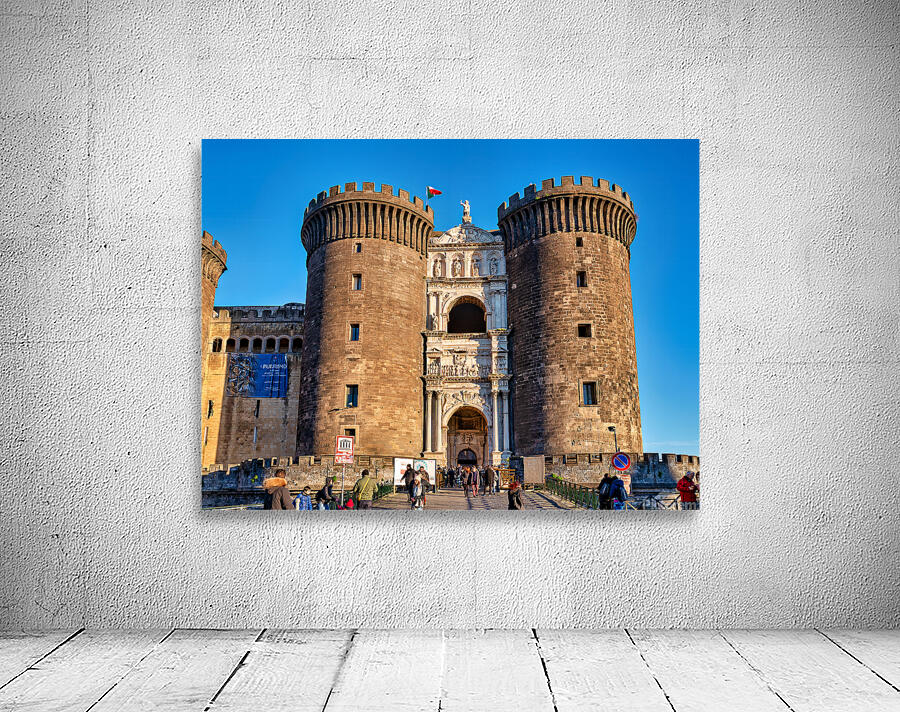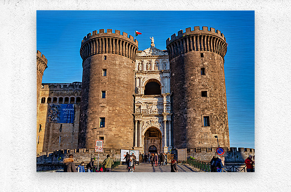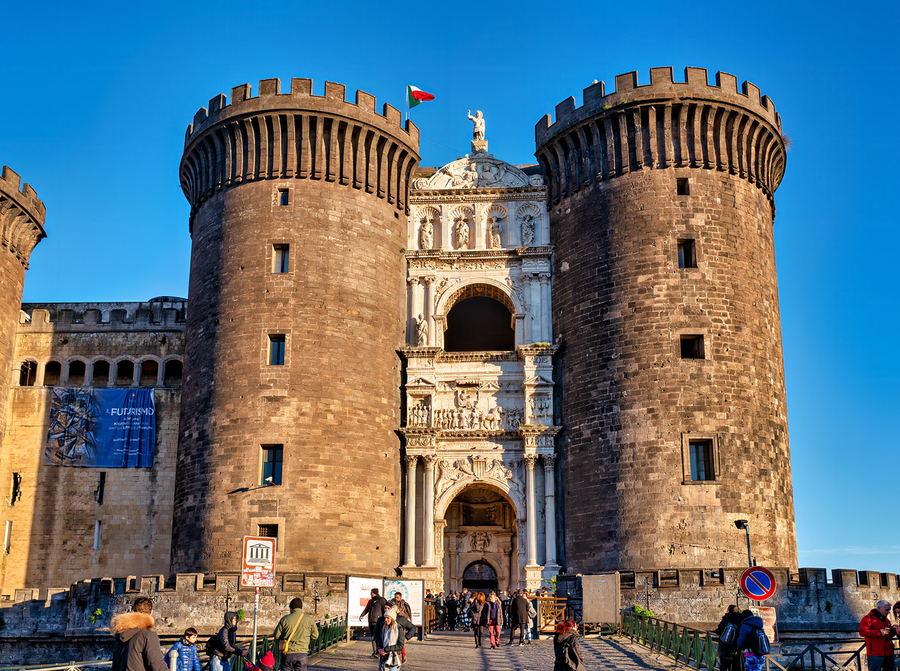 People walk towards Castel Nuovo in Naples a historic medieval castle under a clear sky. The castle features large towers and ornate architecture.