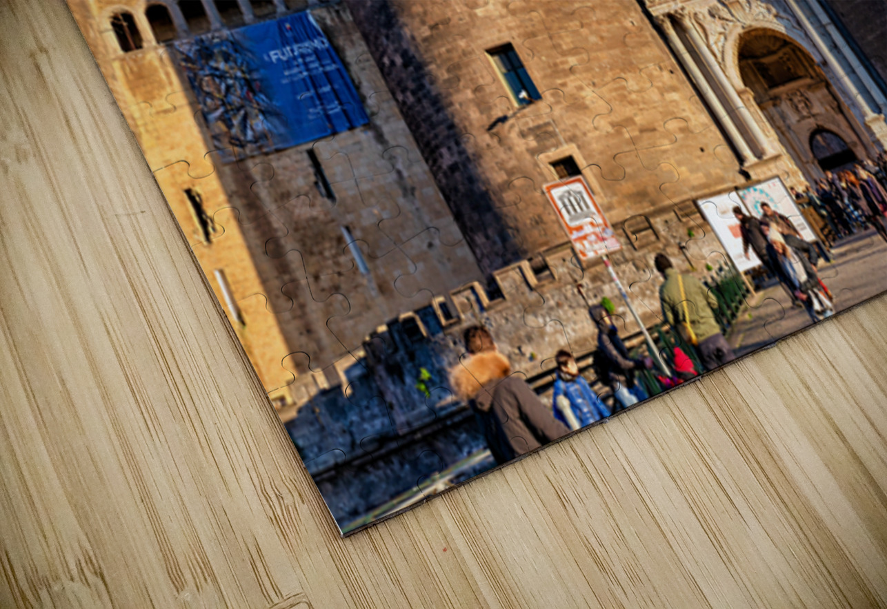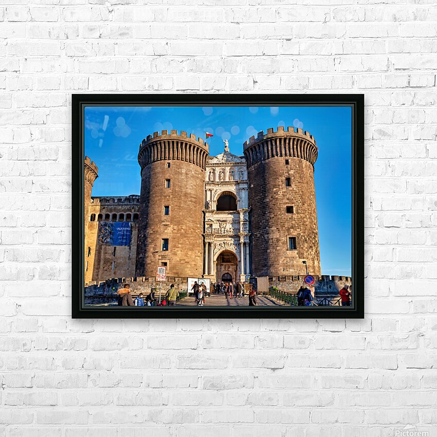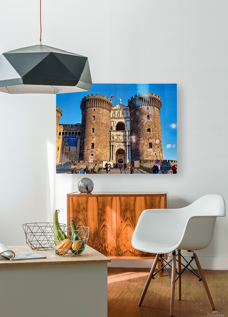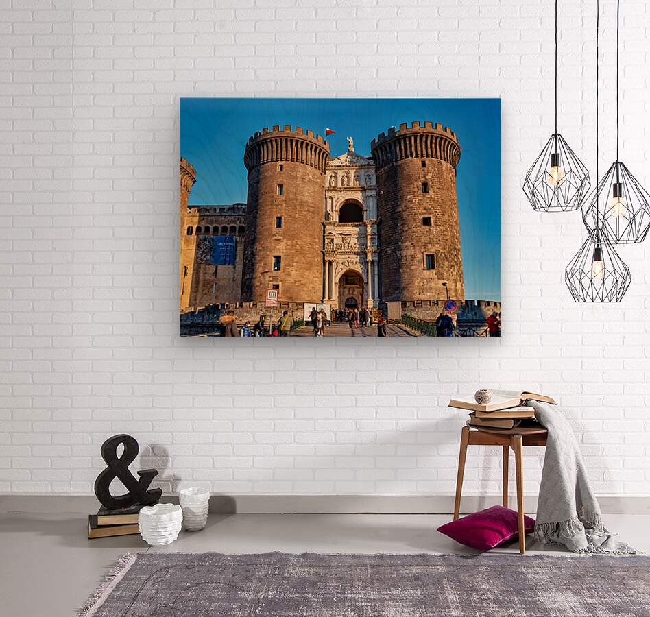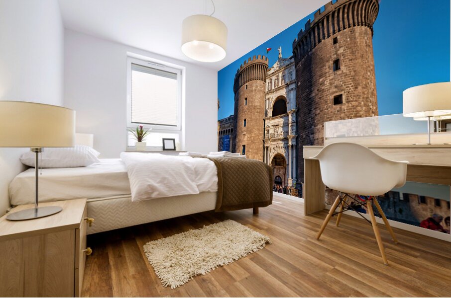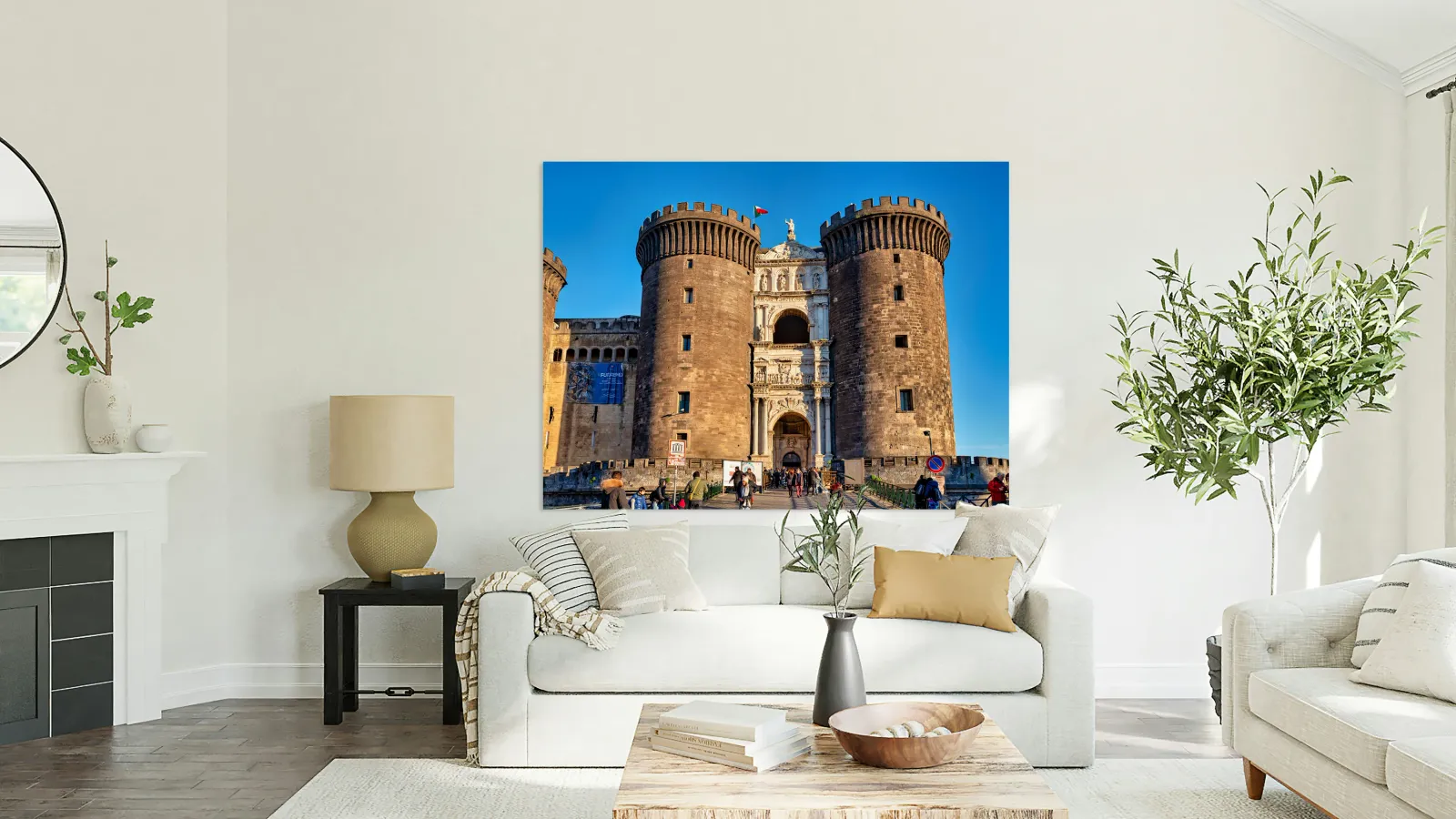 People walk towards Castel Nuovo in Naples a historic medieval castle under a clear sky. The castle features large towers and ornate architecture.