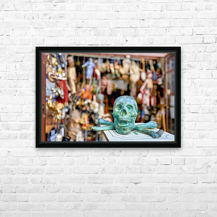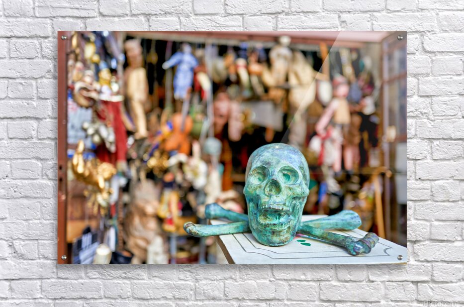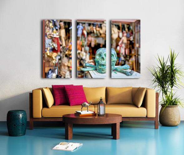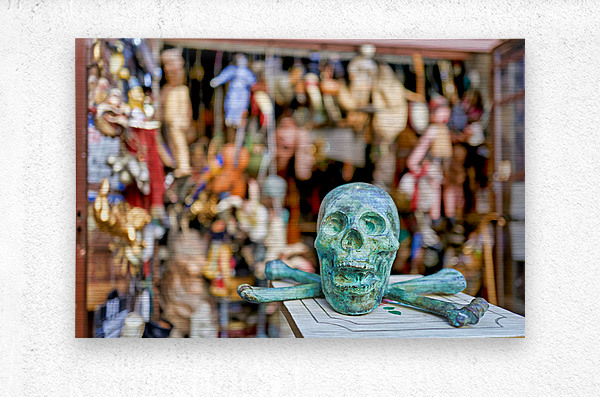 A junk dealer sells a variety of items in Via Tribunali Naples Campania. The scene shows a green skull with crossbones in focus.
