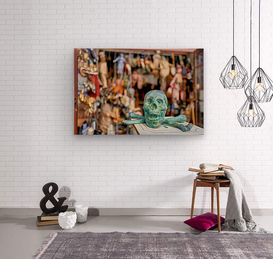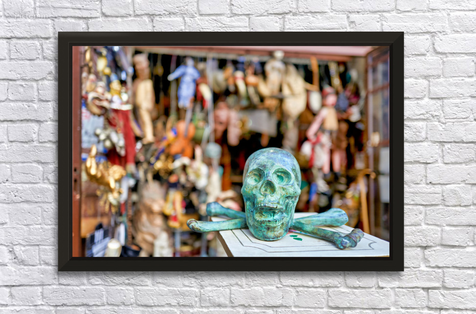 A junk dealer sells a variety of items in Via Tribunali Naples Campania. The scene shows a green skull with crossbones in focus.