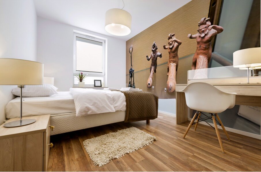 ABOUT THIS ARTWORK: DISPLAYS OF ANCIENT ARTIFACTS ARE SHOWN IN GLASS CASES