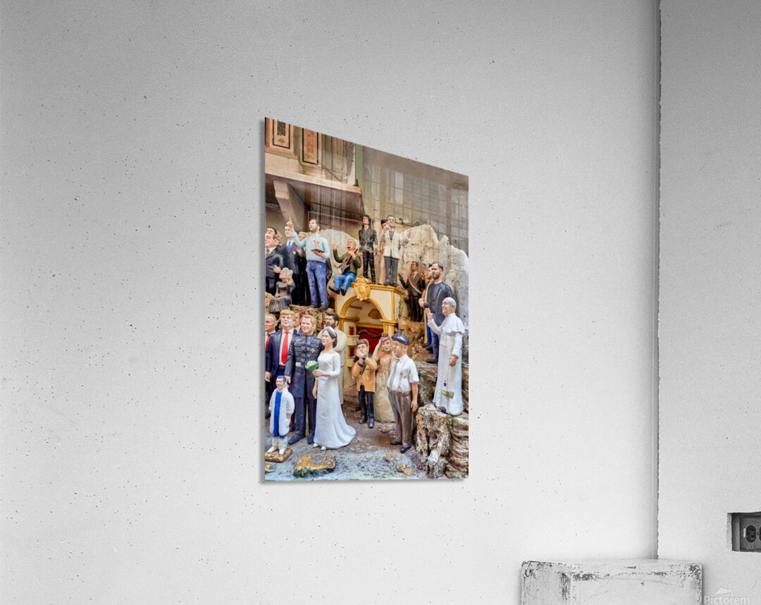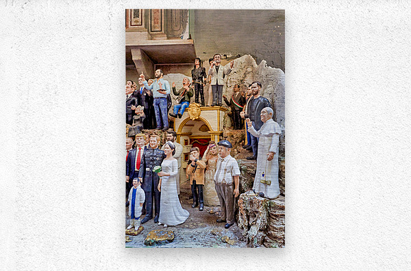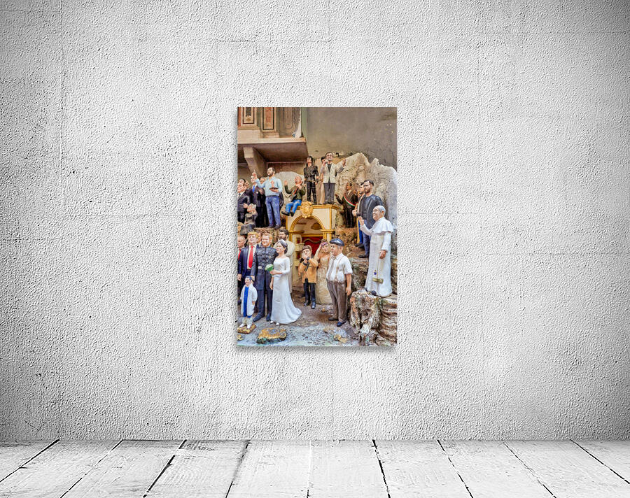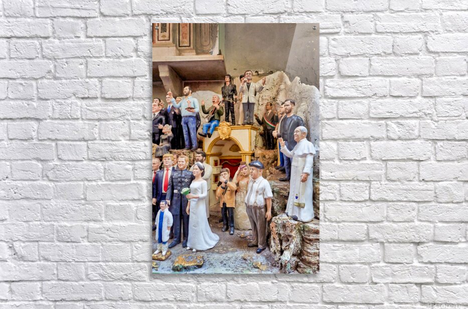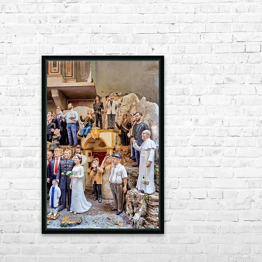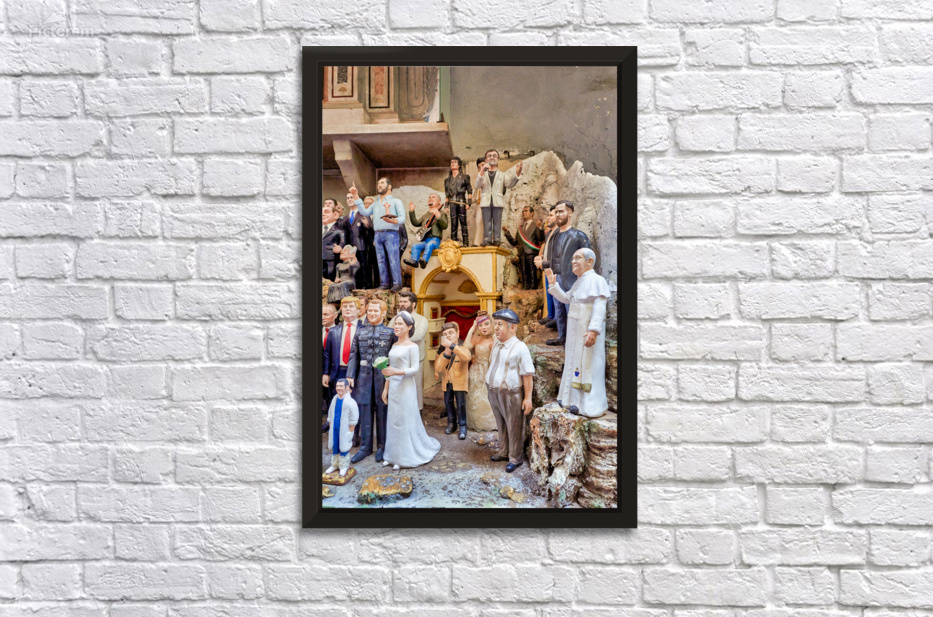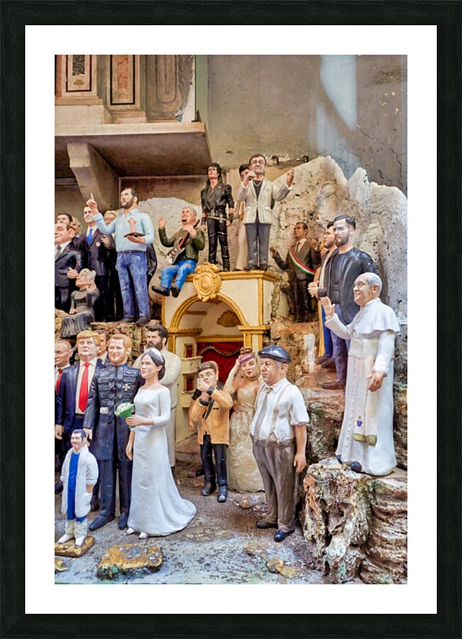 "Statues of Christmas nativity scene in Naples Campania workshops" in a framed print.