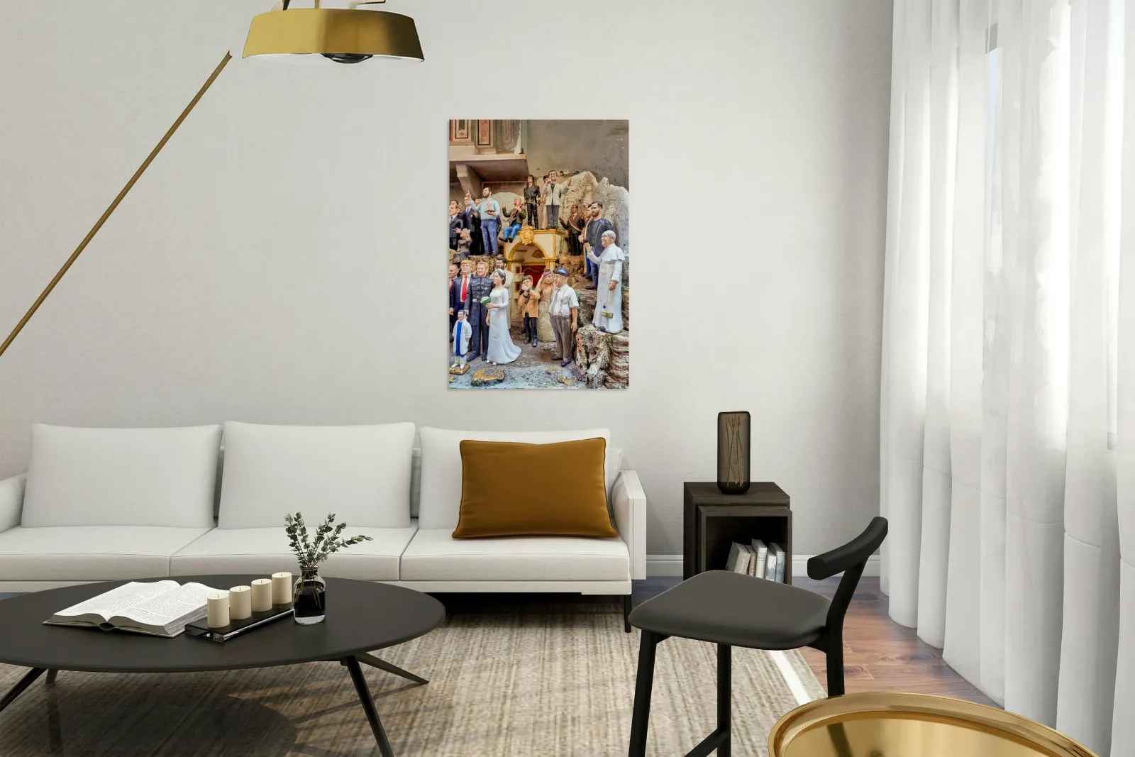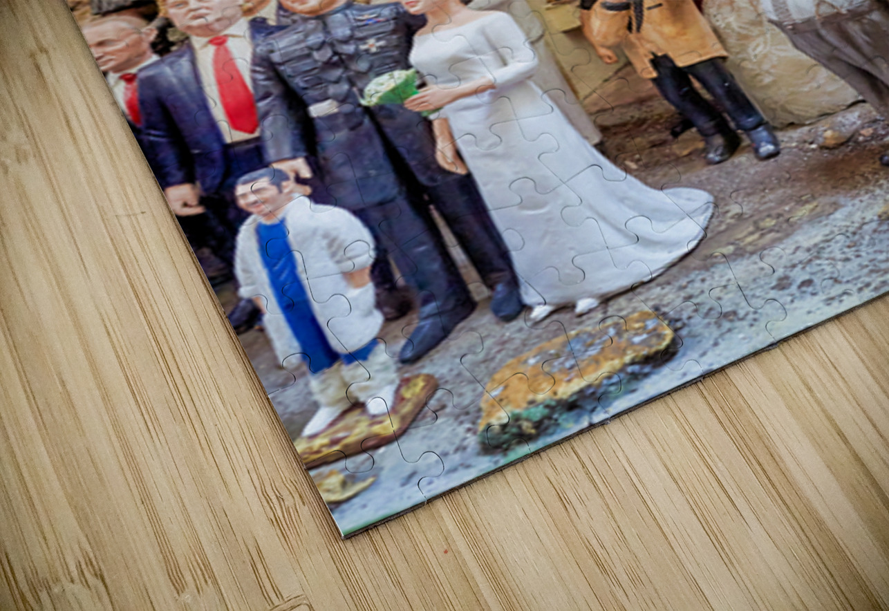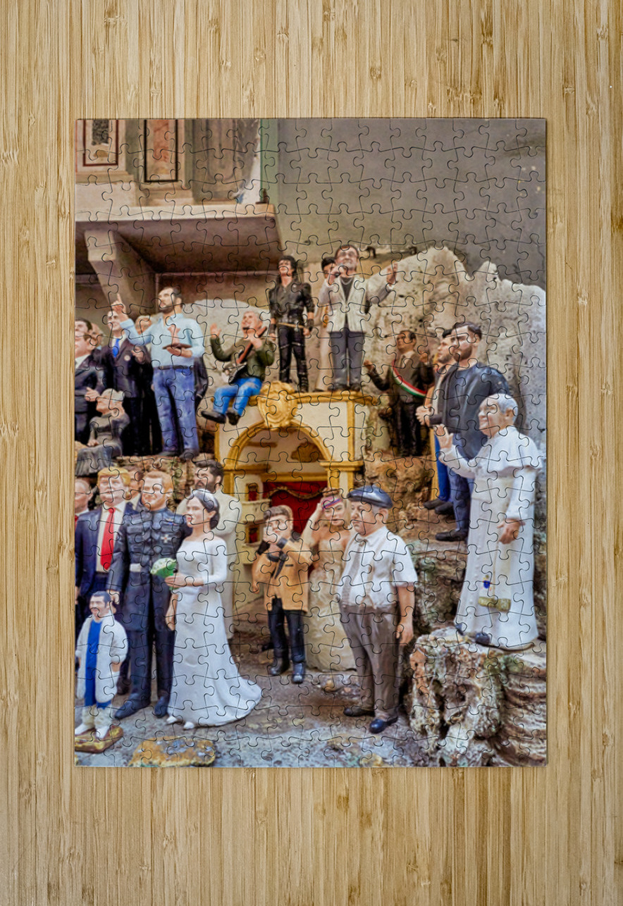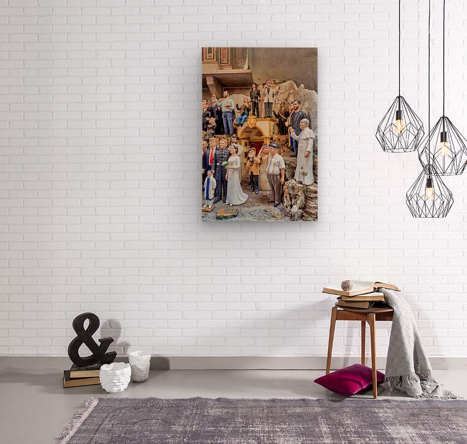 "Statues of Christmas nativity scene in Naples Campania workshops" in a framed print.