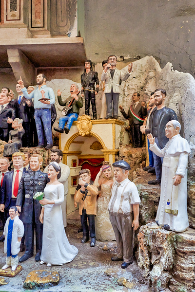 Artisans craft statues for the Christmas nativity scene in Naples. Visitors explore Via San Gregorio Armeno to see unique figurines.
