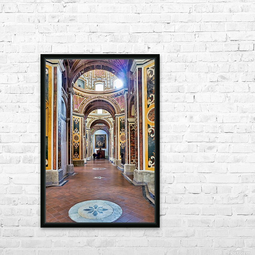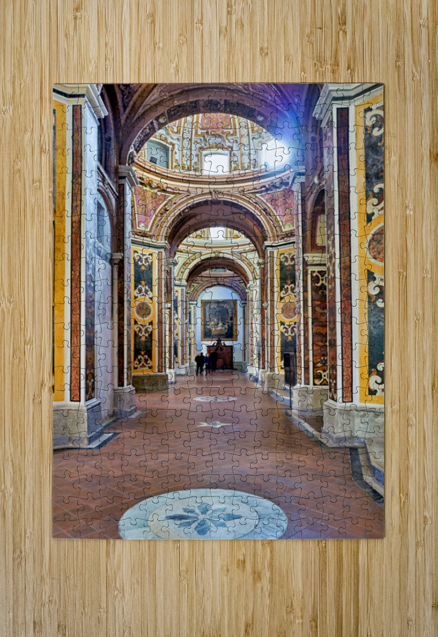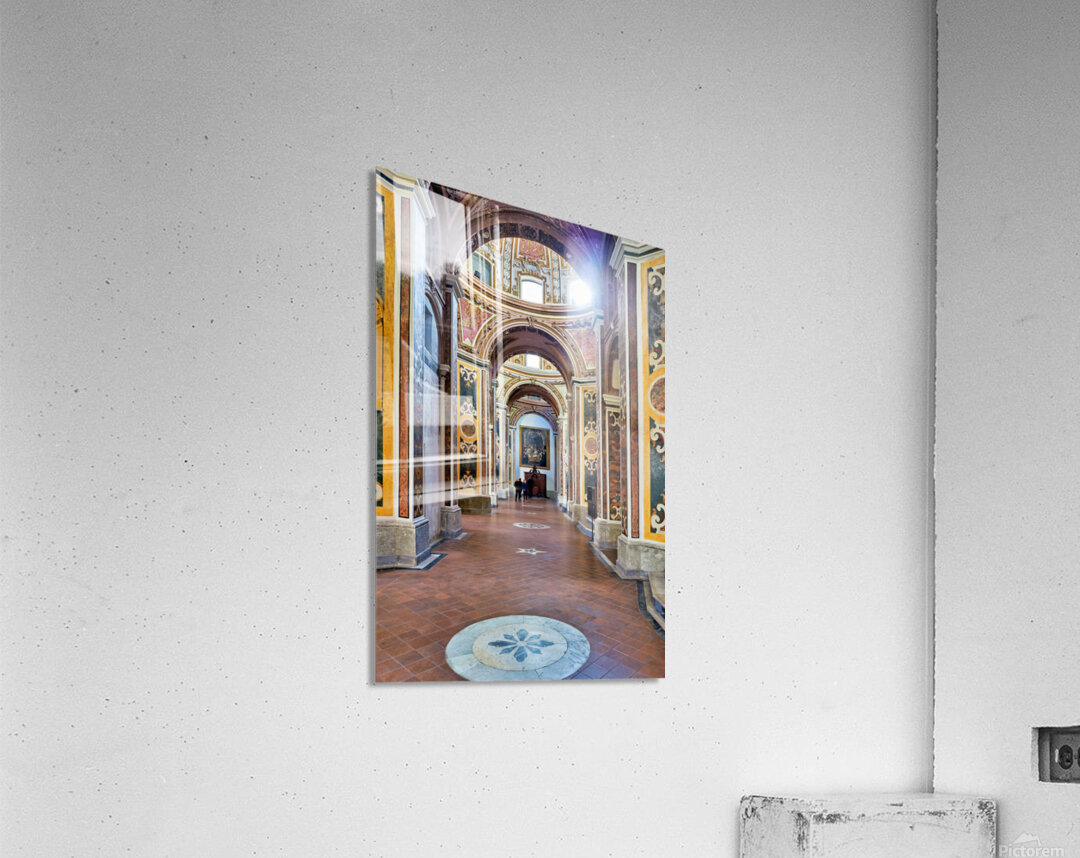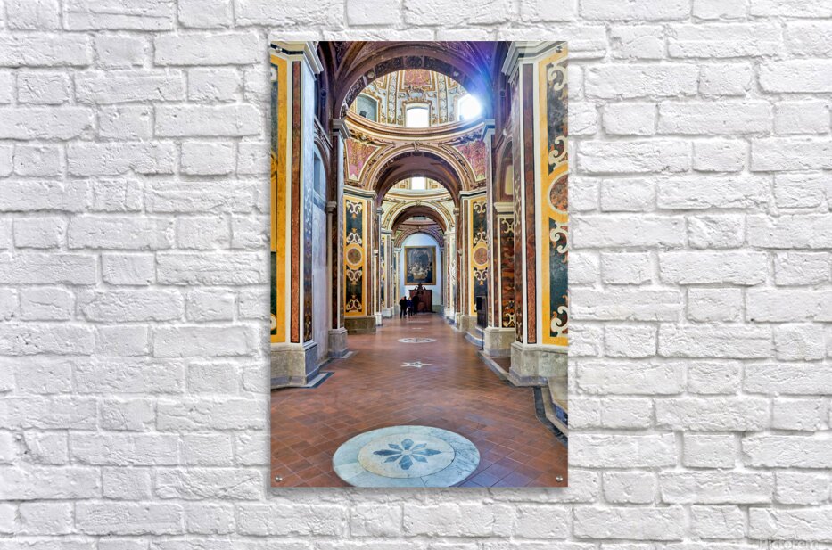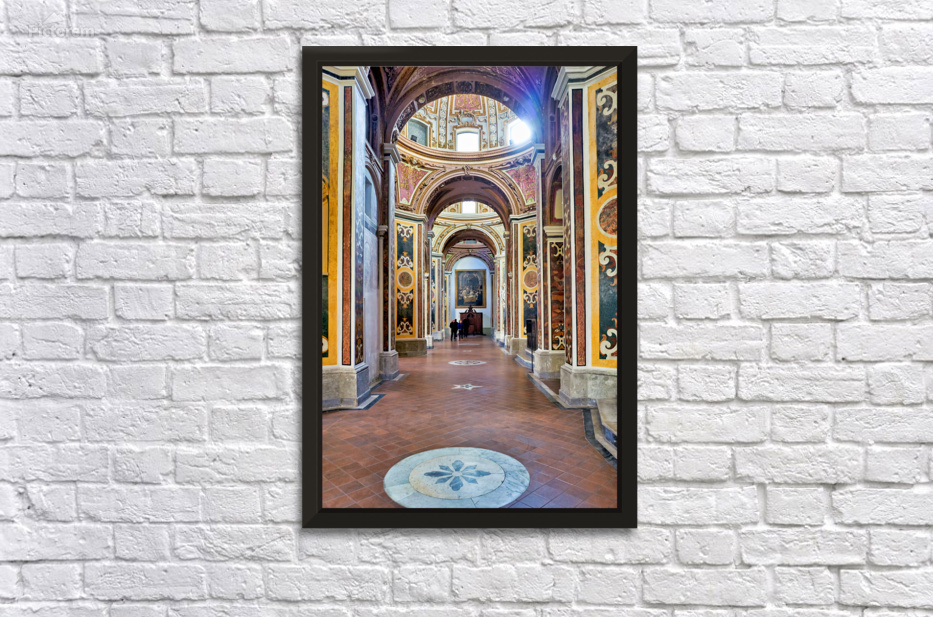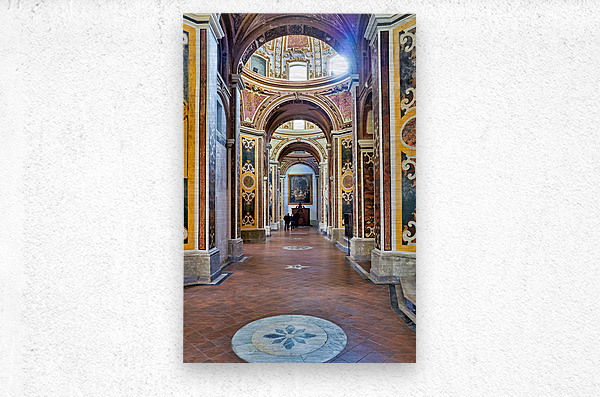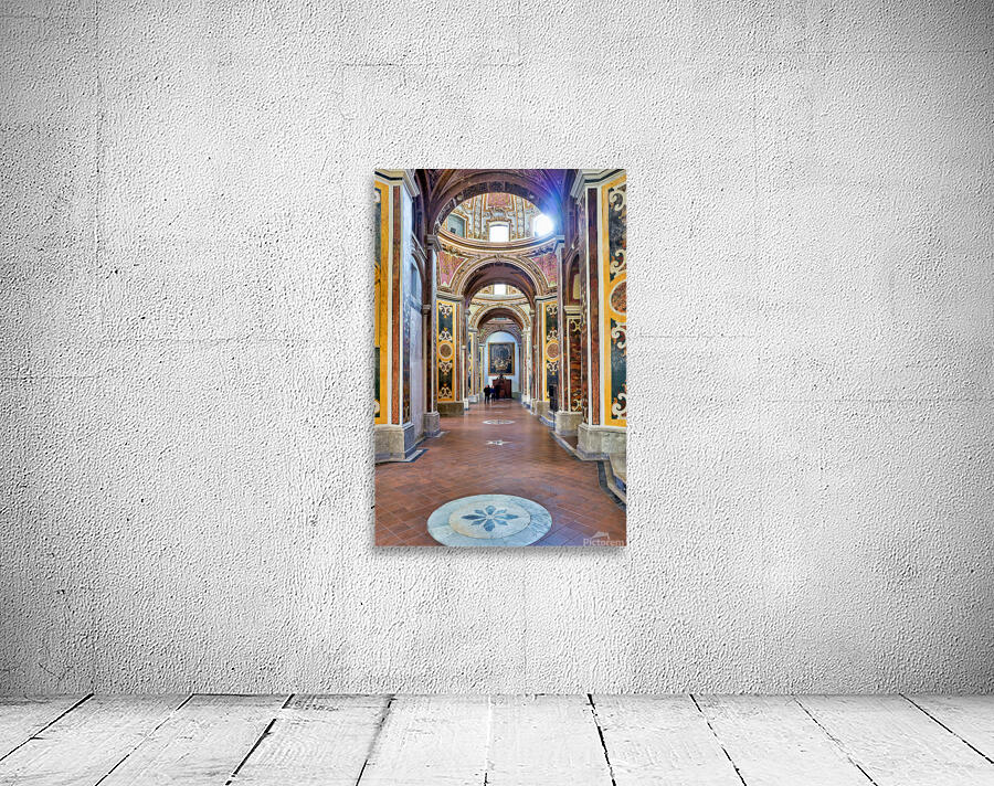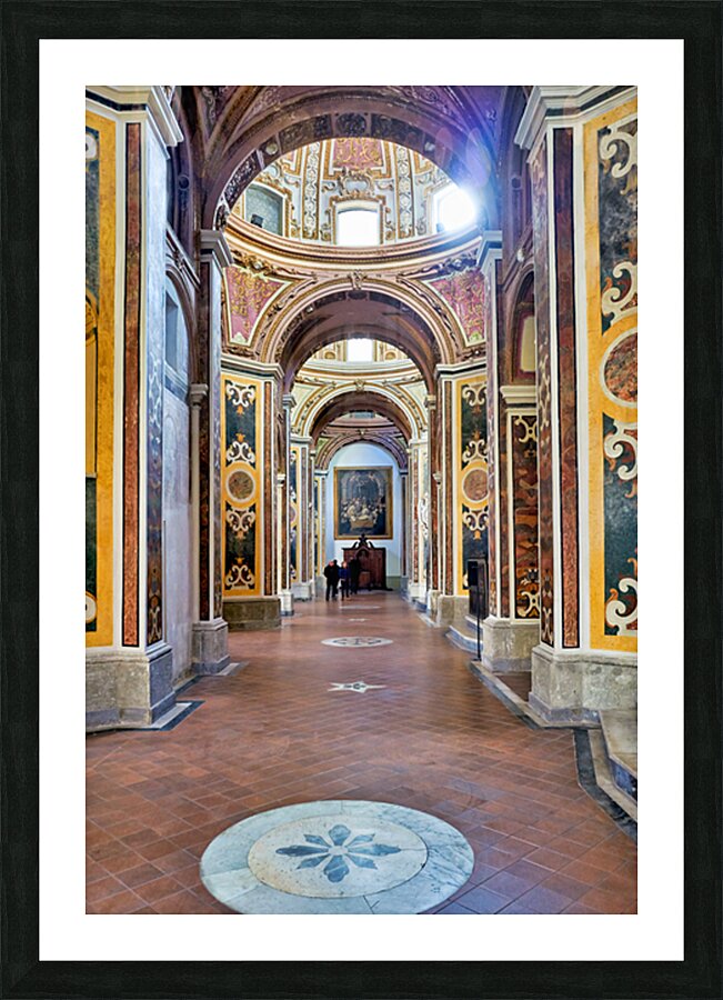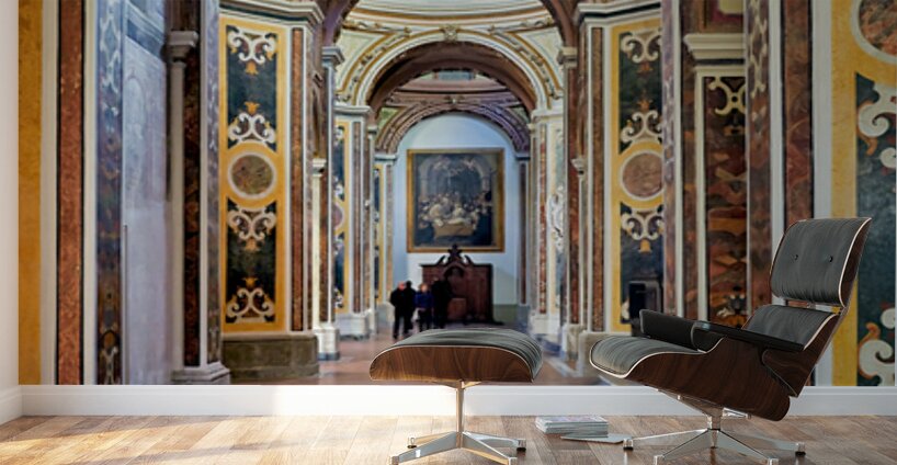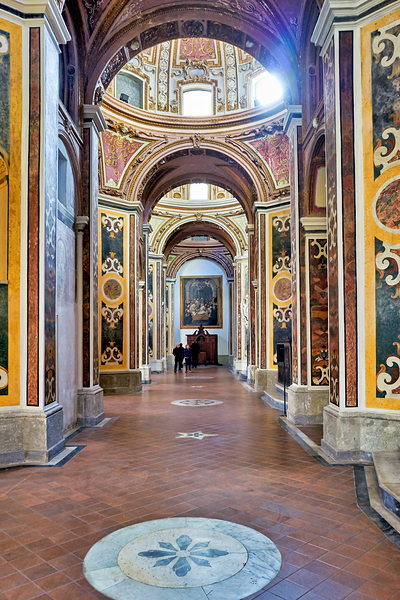 Visitors walk through San Paolo Maggiore basilica in Naples Italy. The interior shows decorated walls and arches with painted details.