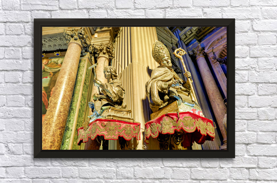 "Exploring Naples Cathedral and its notable religious statues" in a framed print.