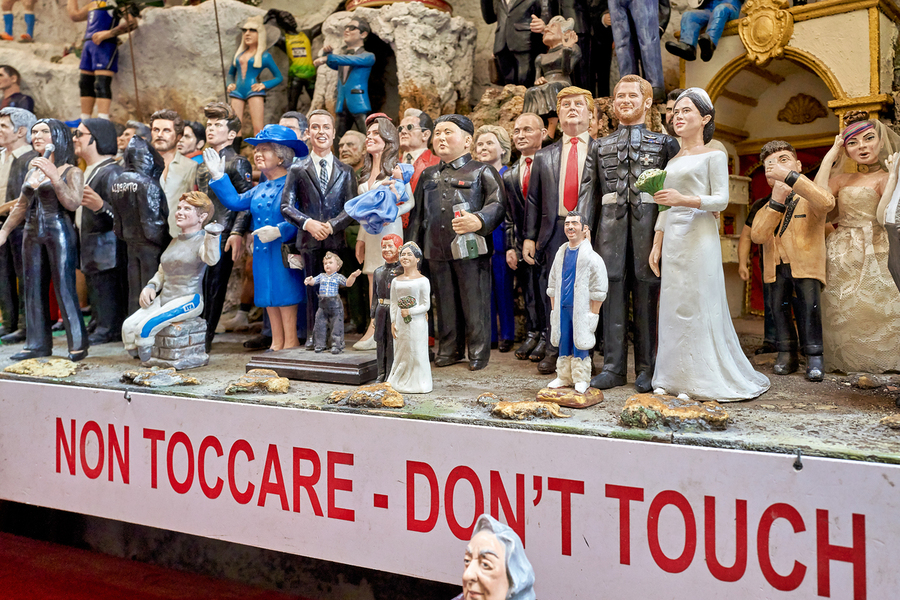 Statues and figurines of the Christmas Nativity scene are displayed in an artisan workshop in Naples. Visitors observe the detailed craftwork.