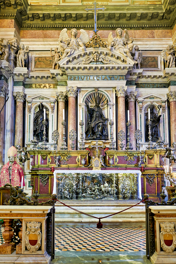 Inside Naples Cathedral visitors see the altar and detailed decorations. The area is busy with people exploring and admiring the architecture.