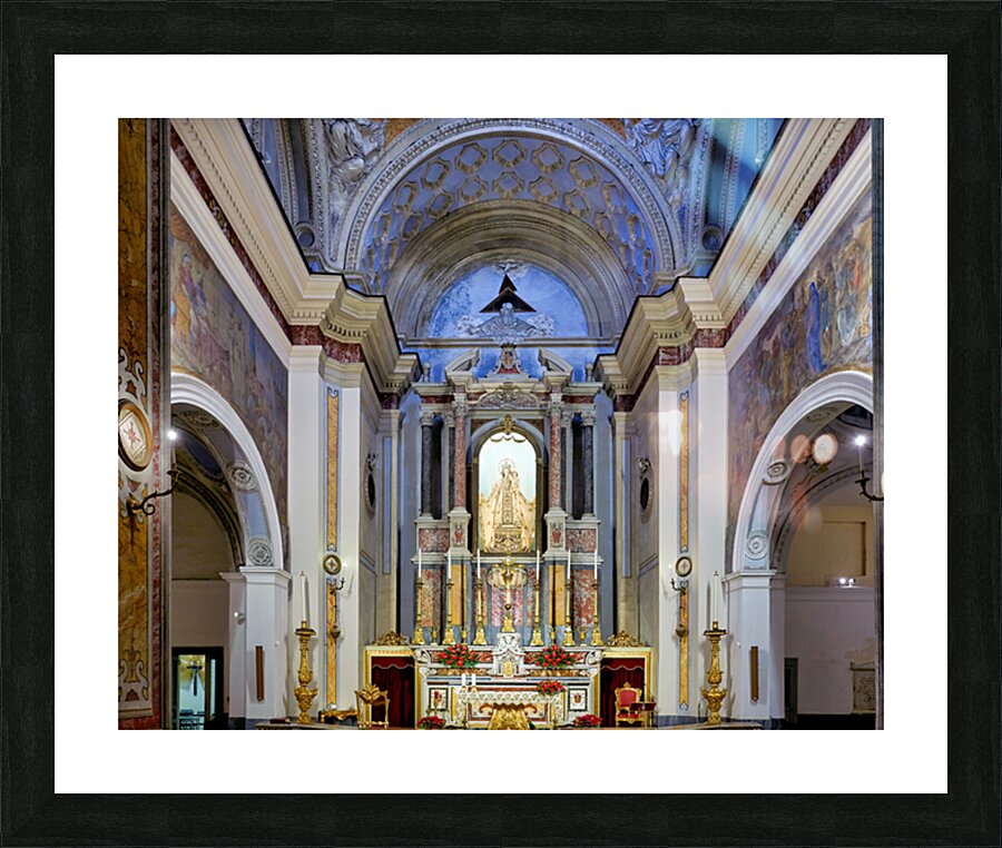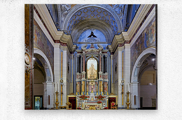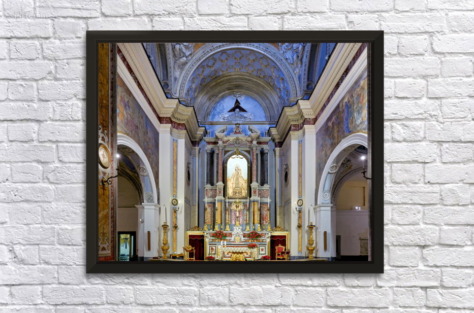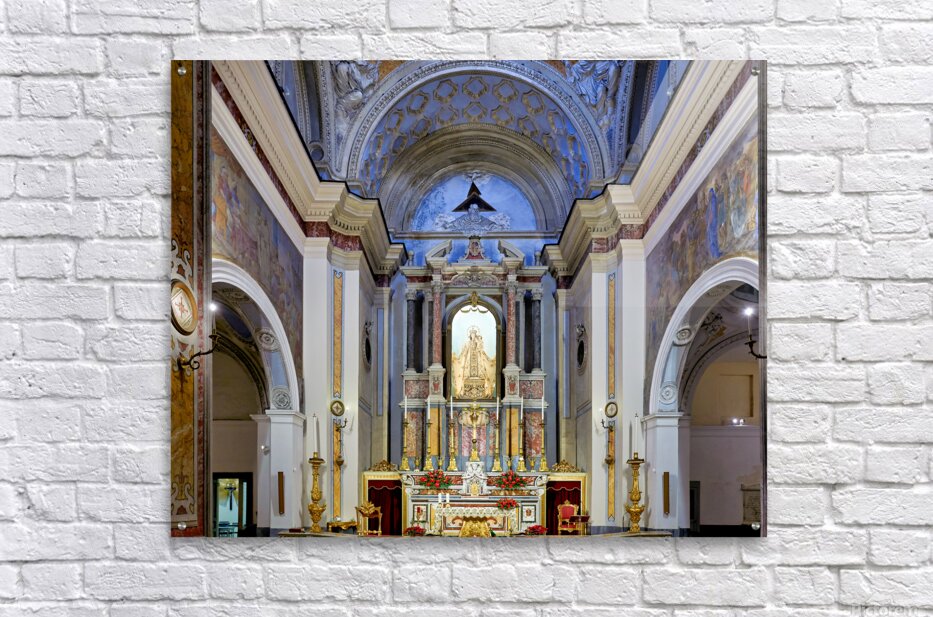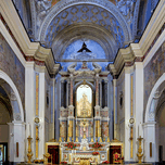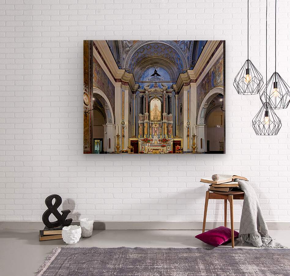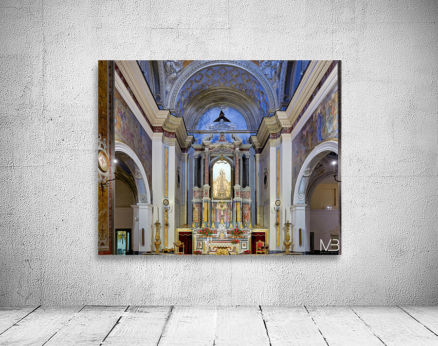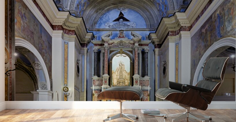 The interior of Parrocchia Santa Maria della Mercede shows the altar area with religious decorations. The setting captures the architectural design.