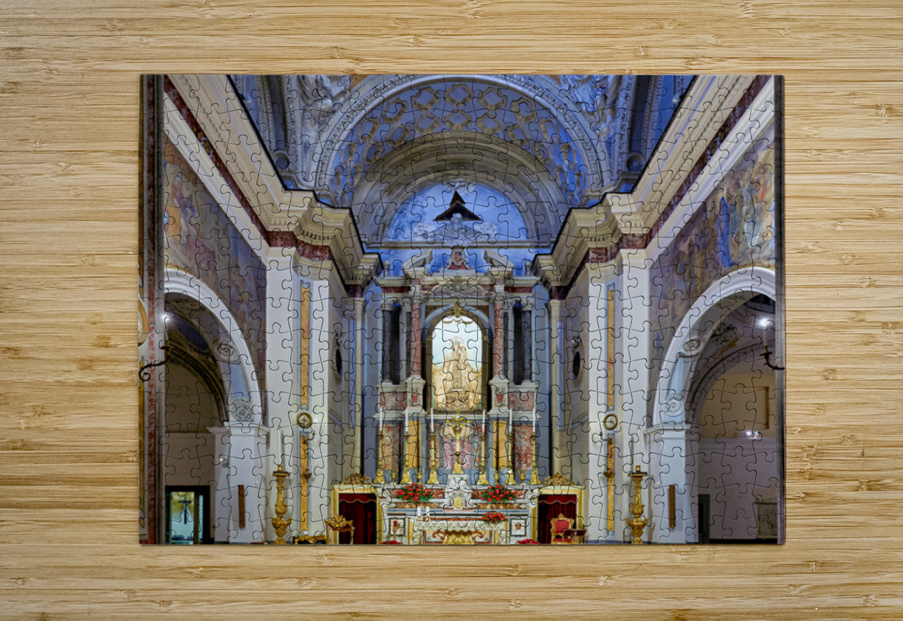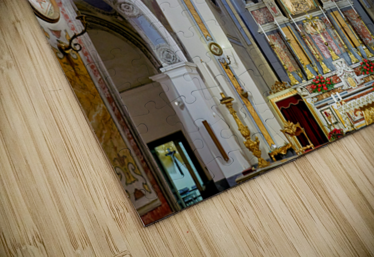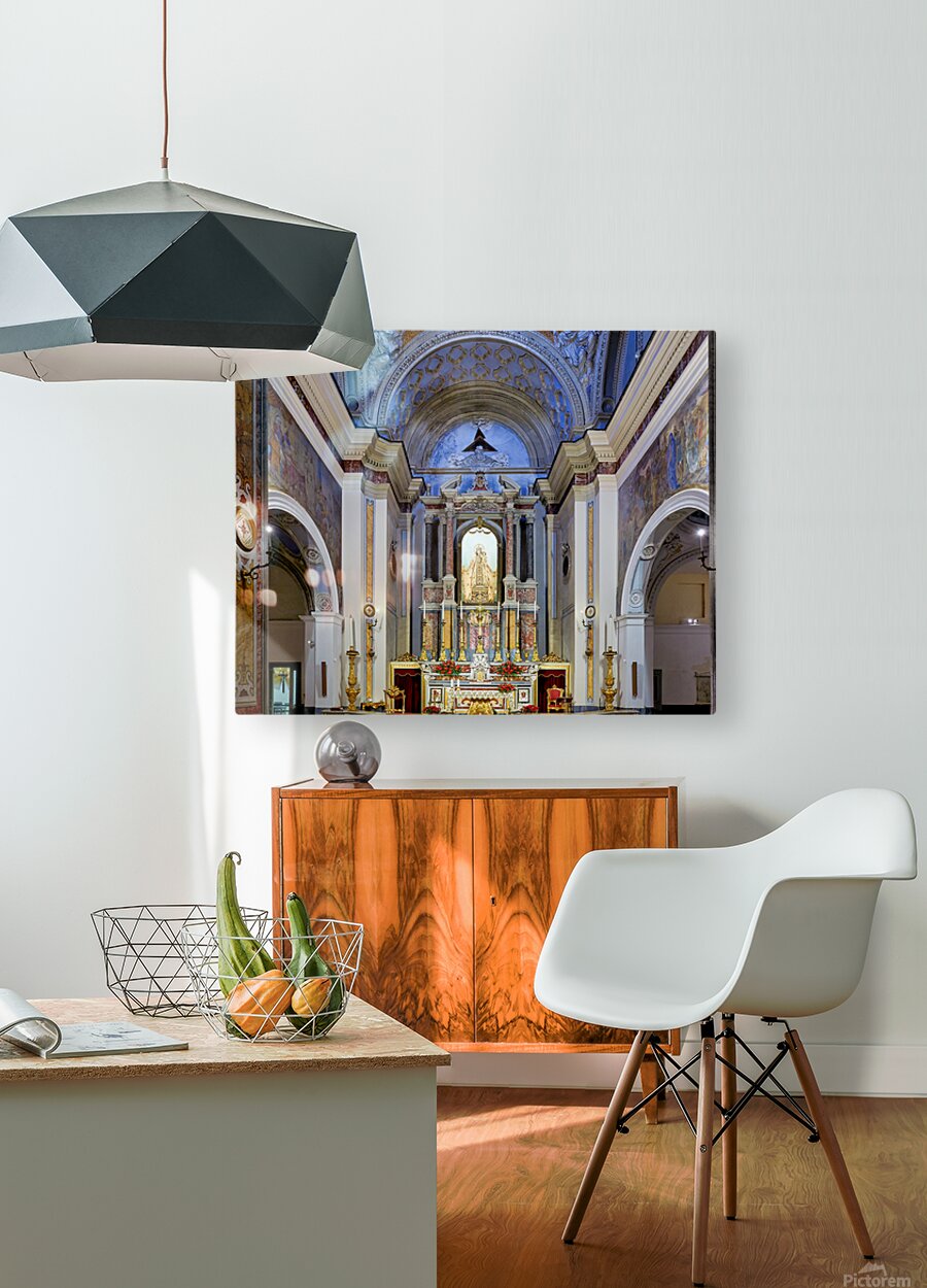 The interior of Parrocchia Santa Maria della Mercede shows the altar area with religious decorations. The setting captures the architectural design.