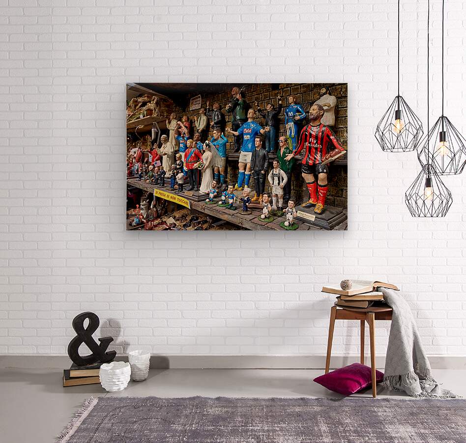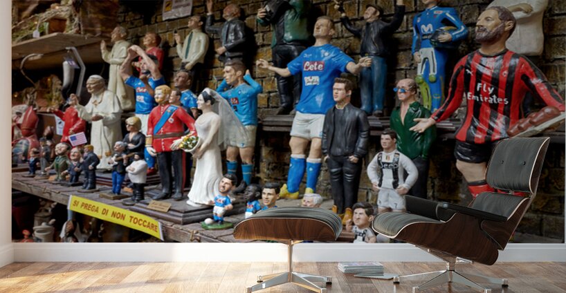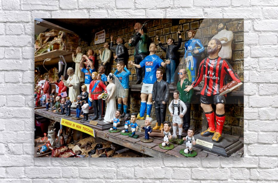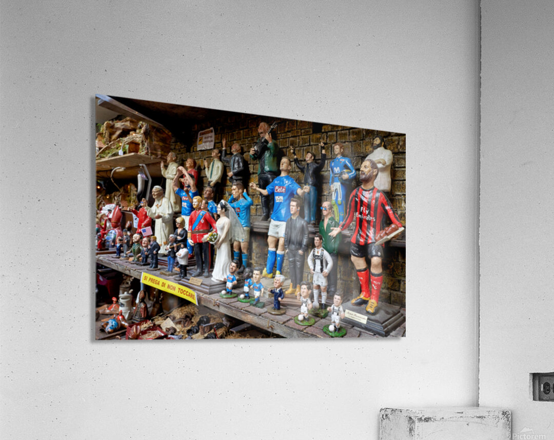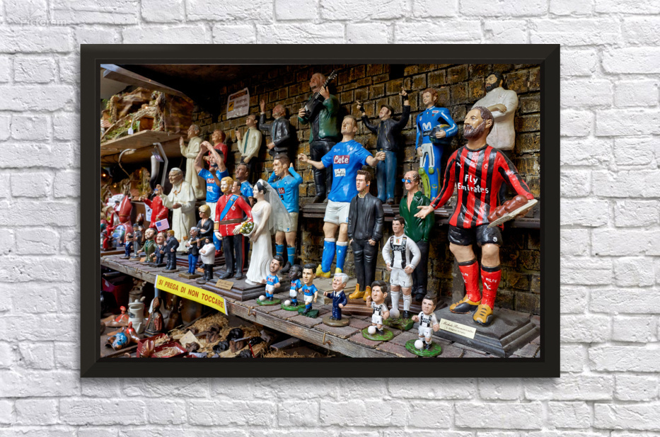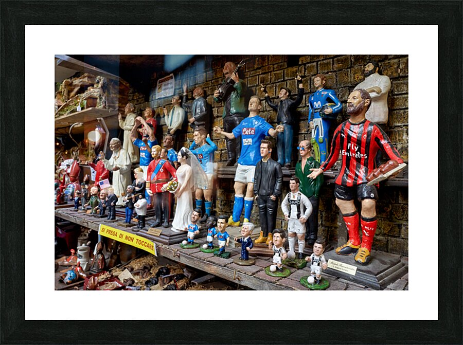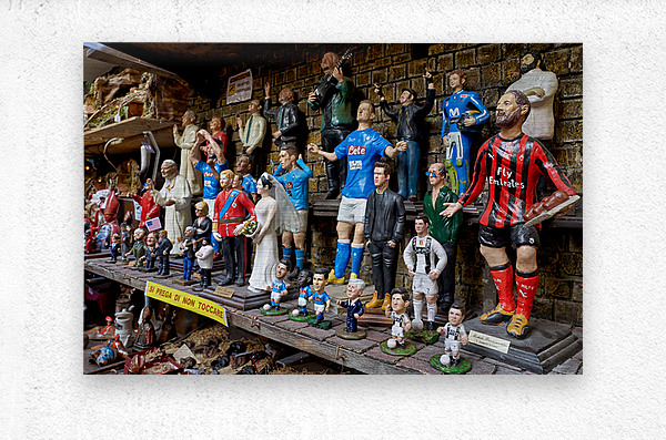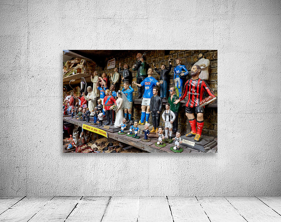 Workshops in Via San Gregorio Armeno display many nativity scene figurines. Statues include sports figures and local characters for visitors.