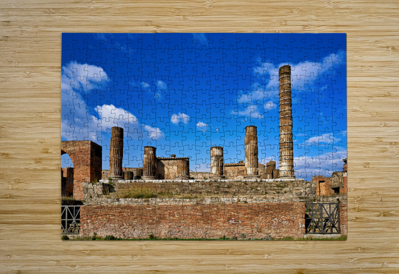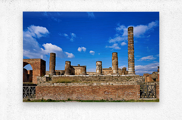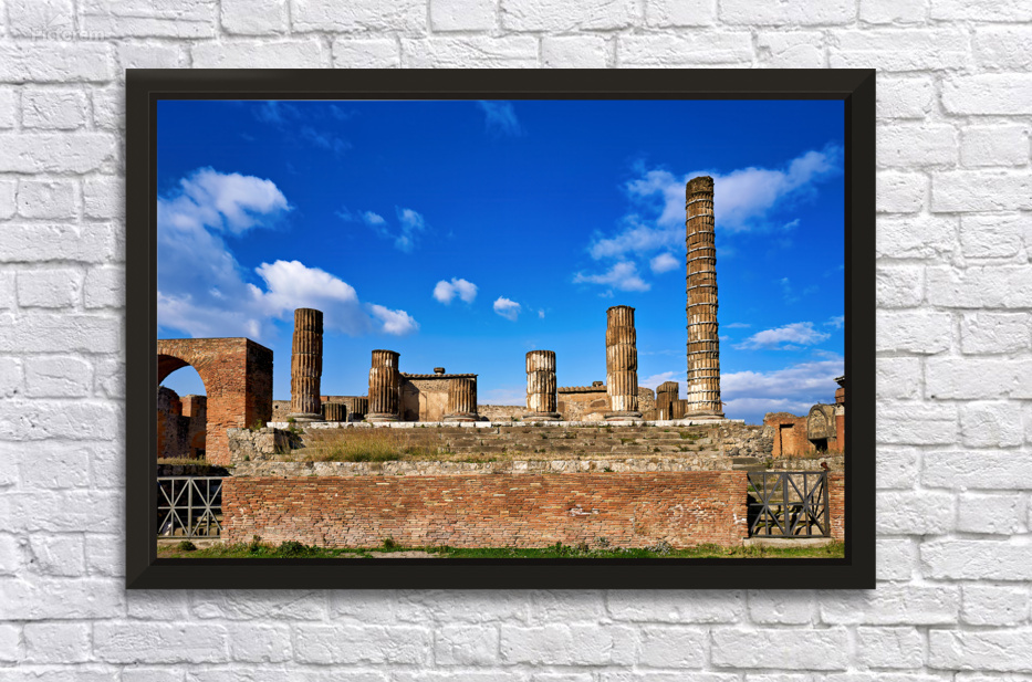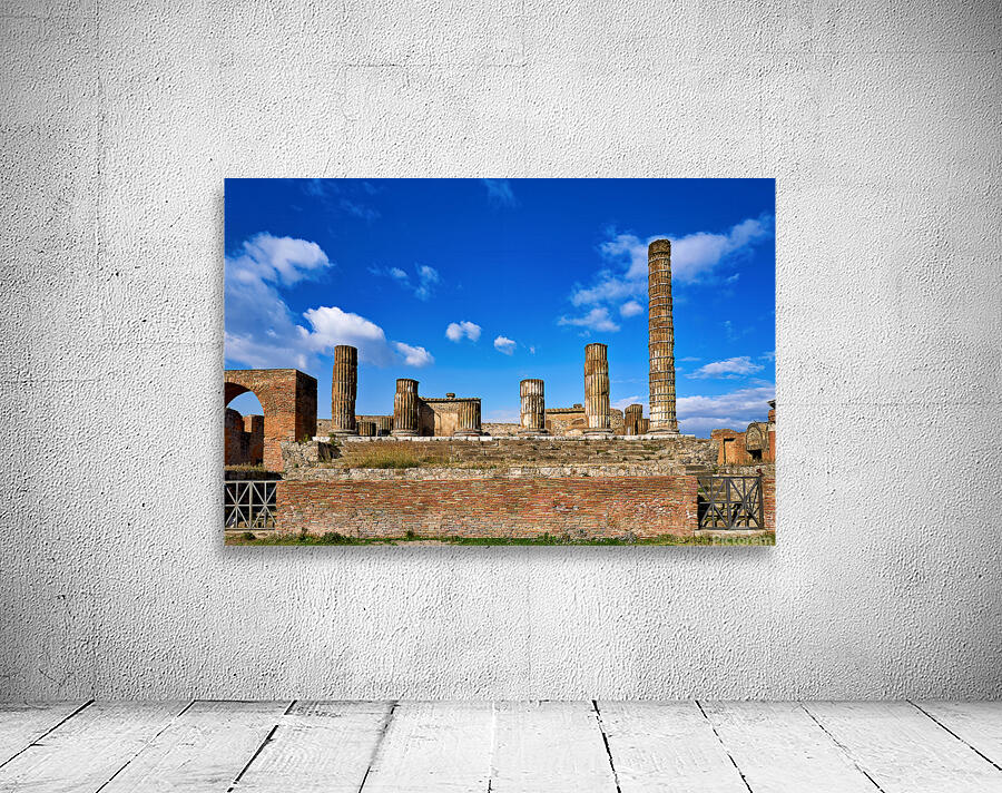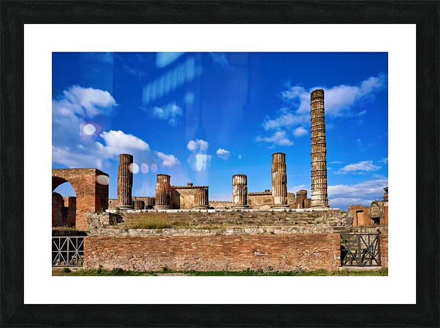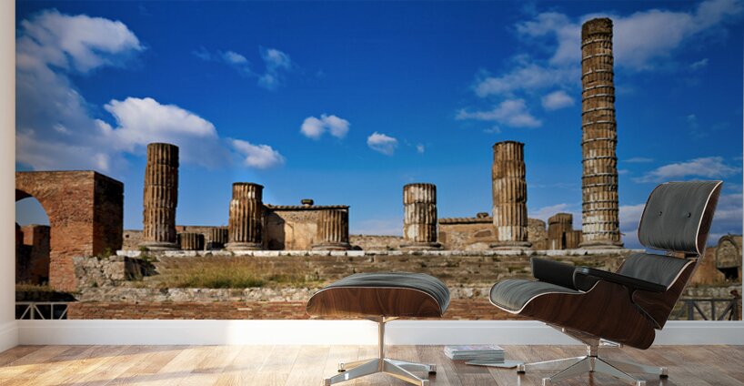 Tourists visit the ancient ruins of Pompeii observing the towering columns and historical structures under a bright blue sky.