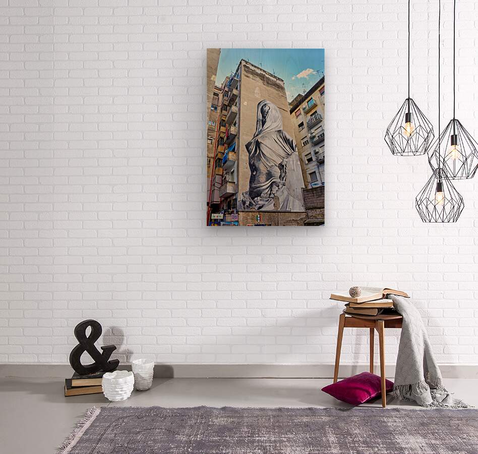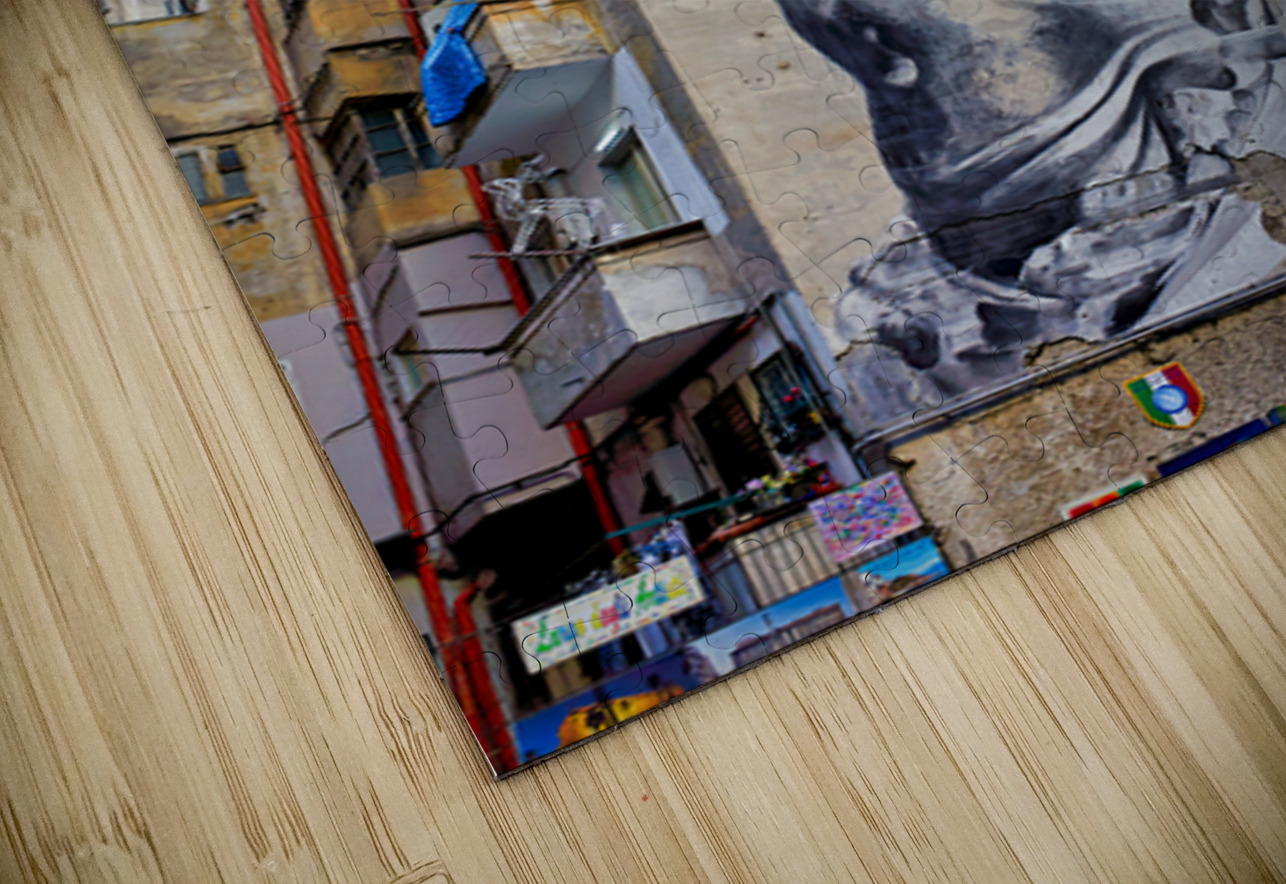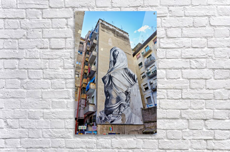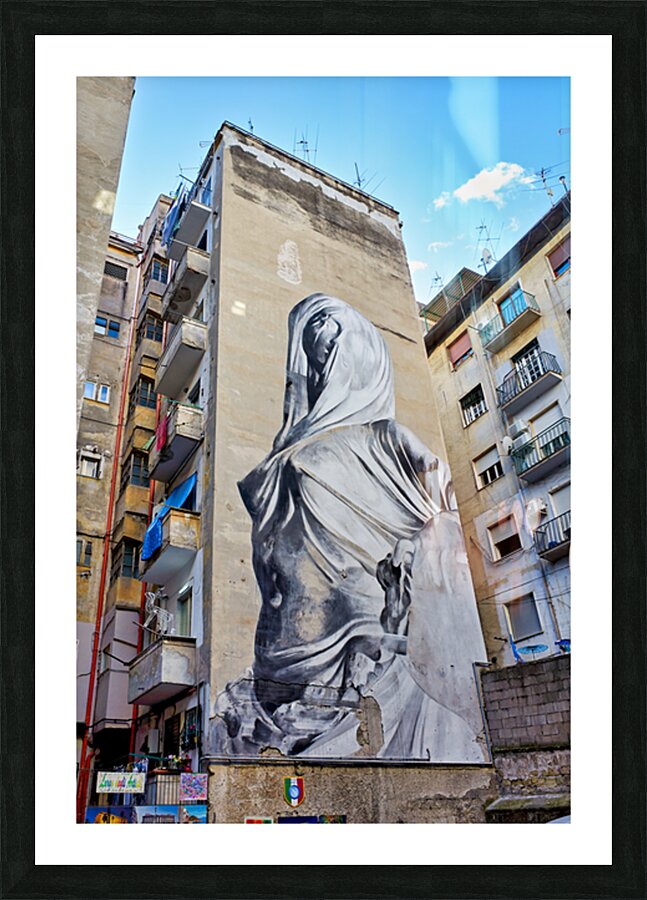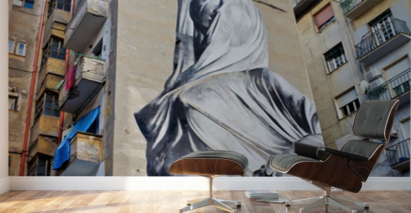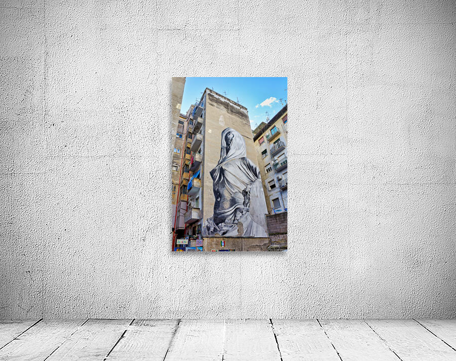 A large mural of Pudicizia is painted on a building in the Spanish Quarters of Naples. The area features tall buildings and blue sky.