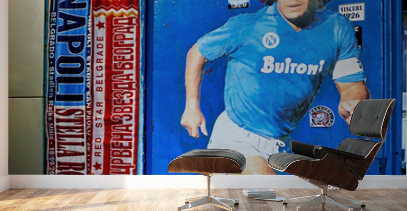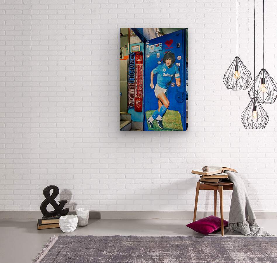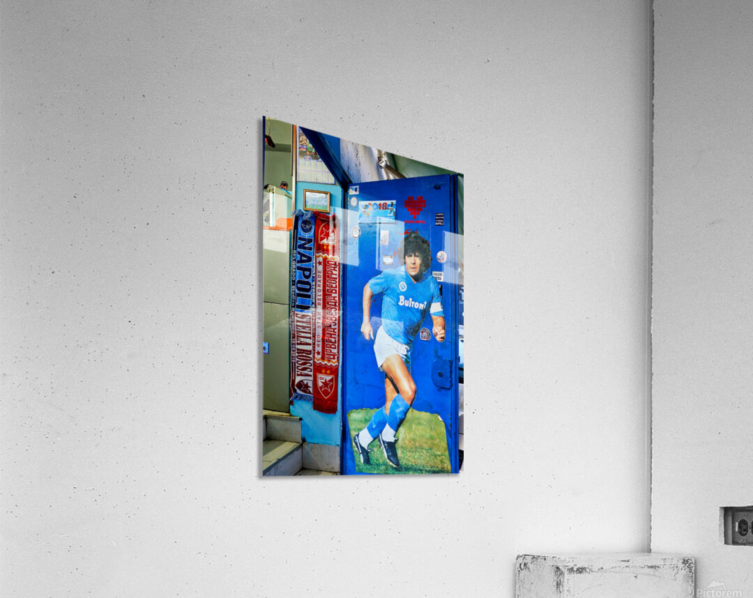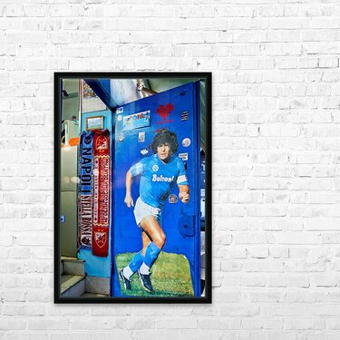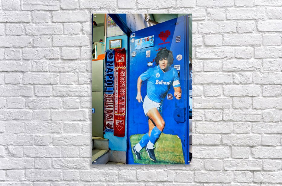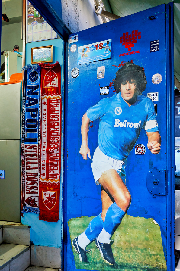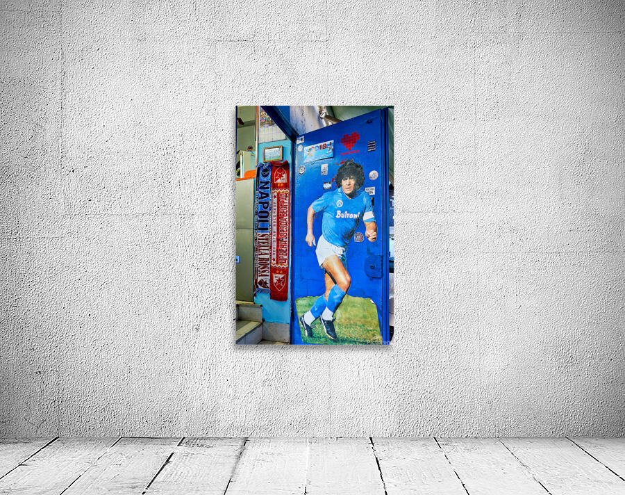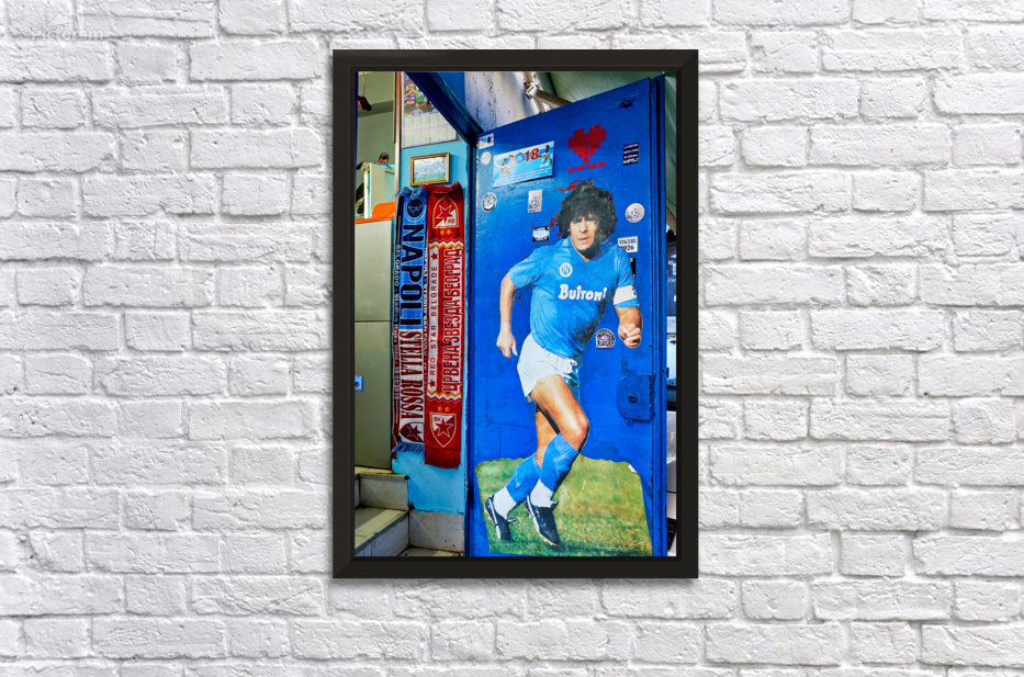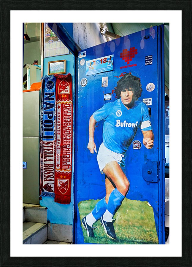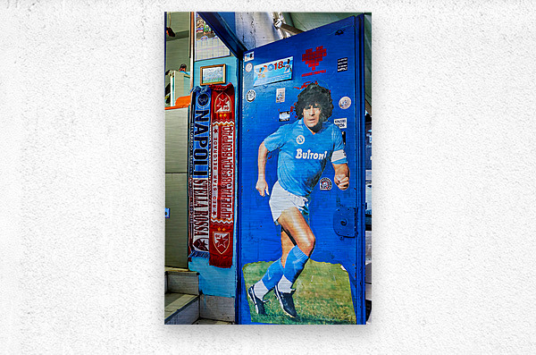 A door features a large image of Diego Maradona at Quartieri Spagnoli. The area shows strong support for the famous soccer player.