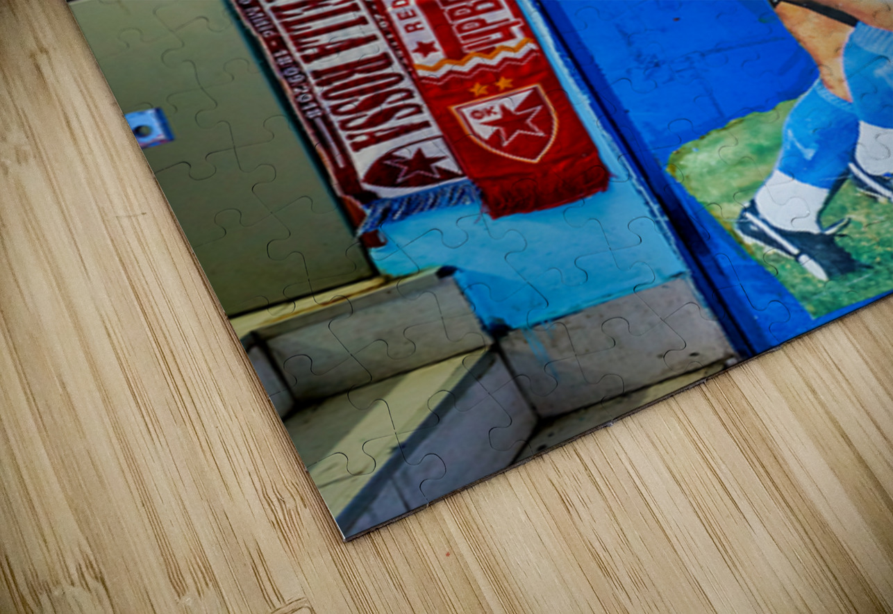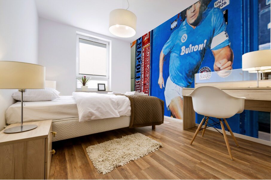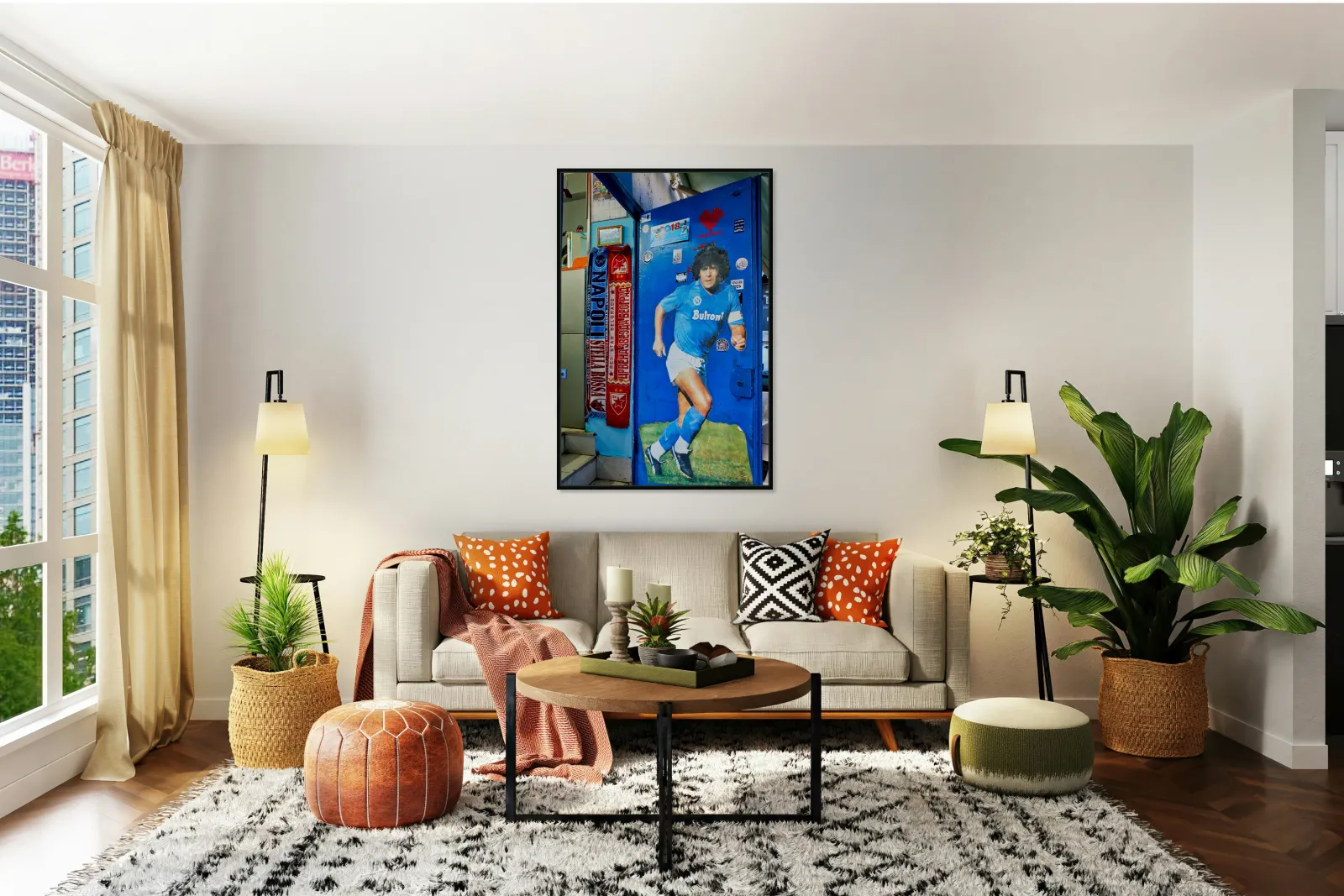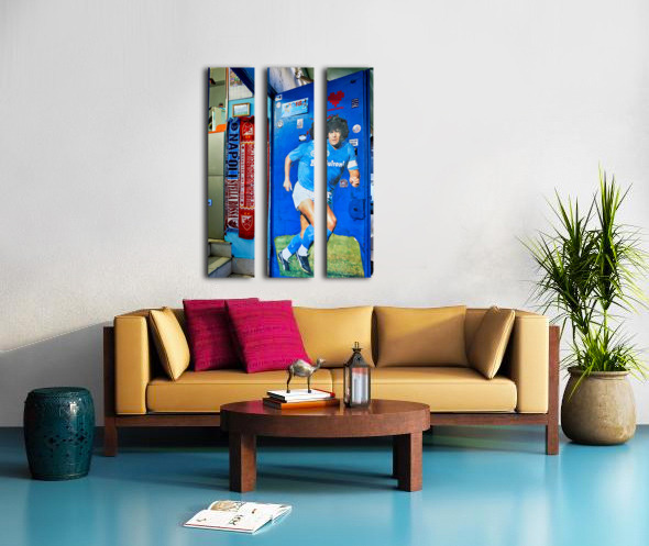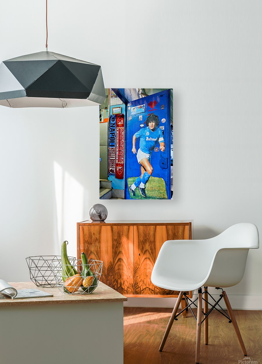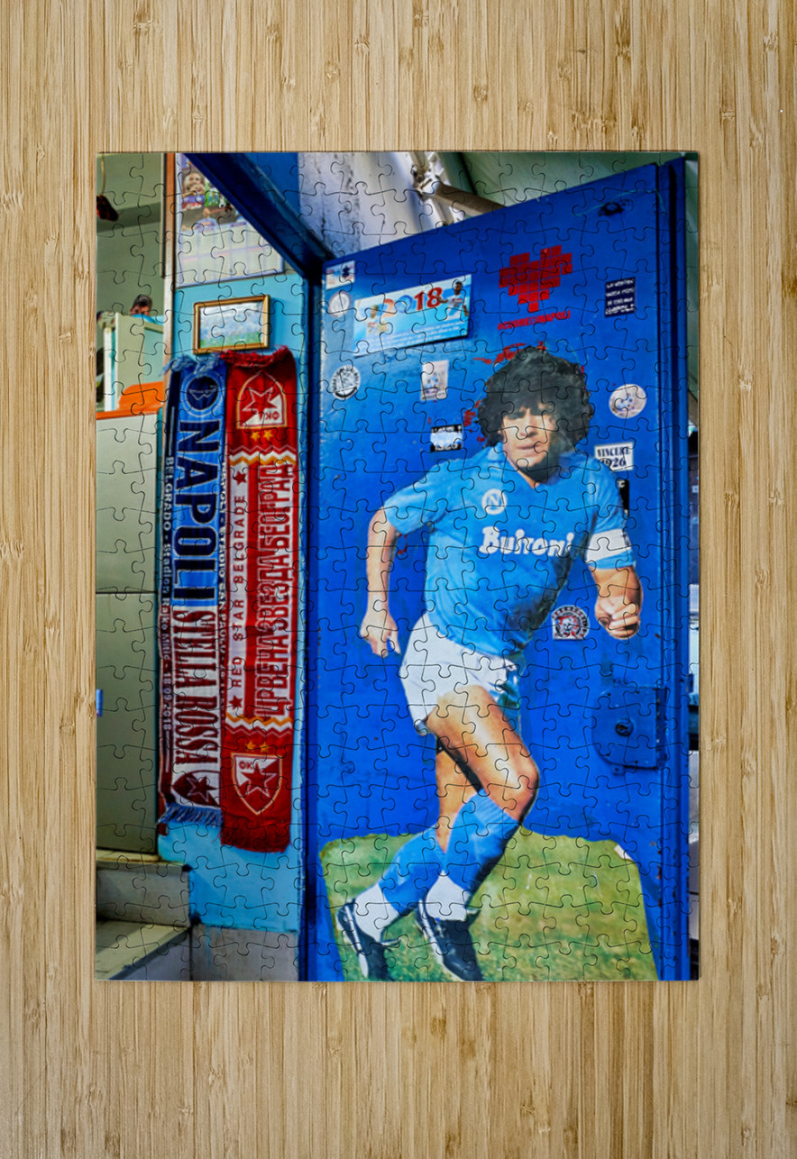 A door features a large image of Diego Maradona at Quartieri Spagnoli. The area shows strong support for the famous soccer player.