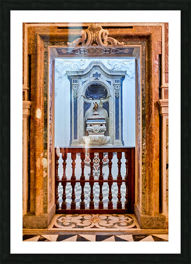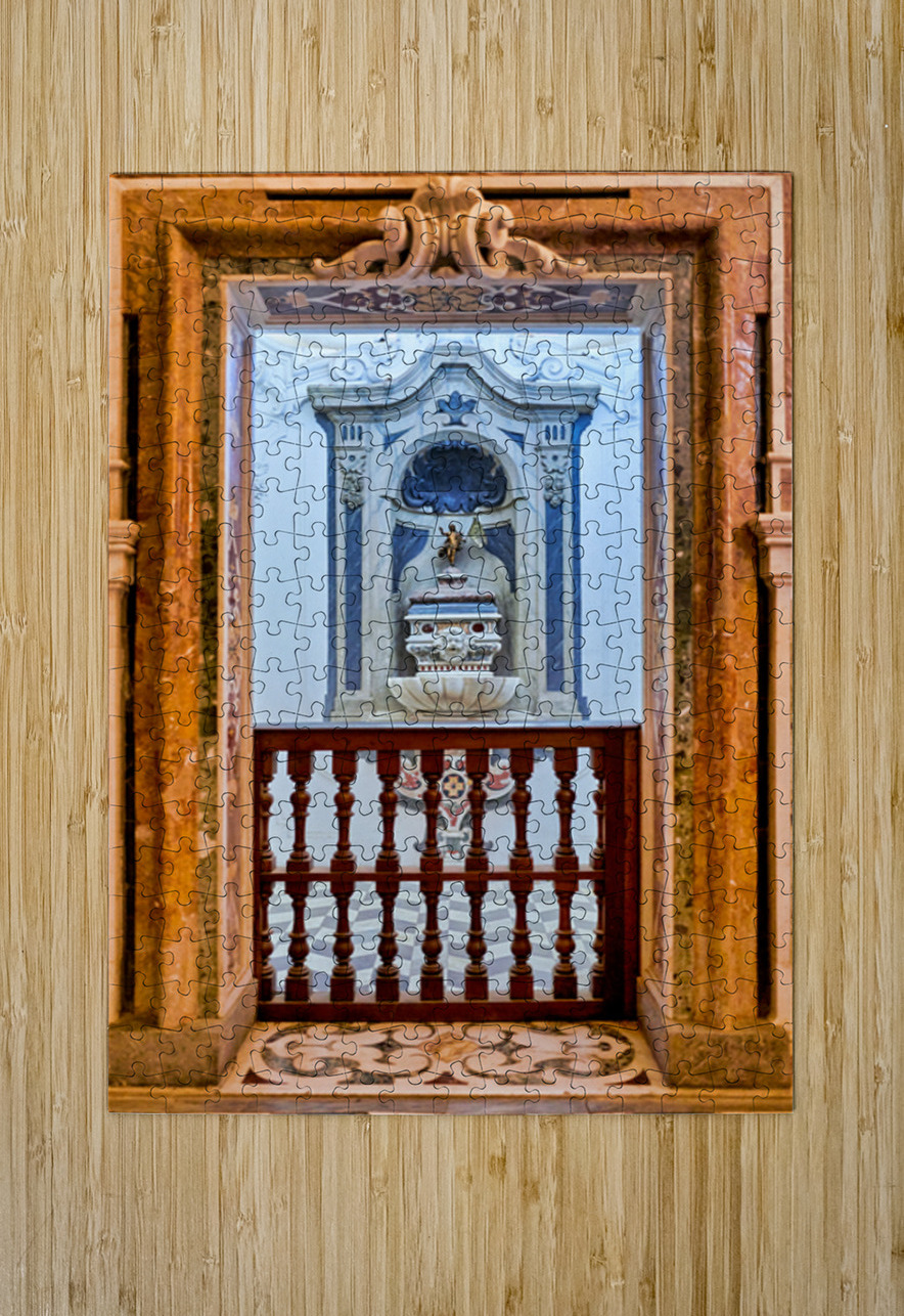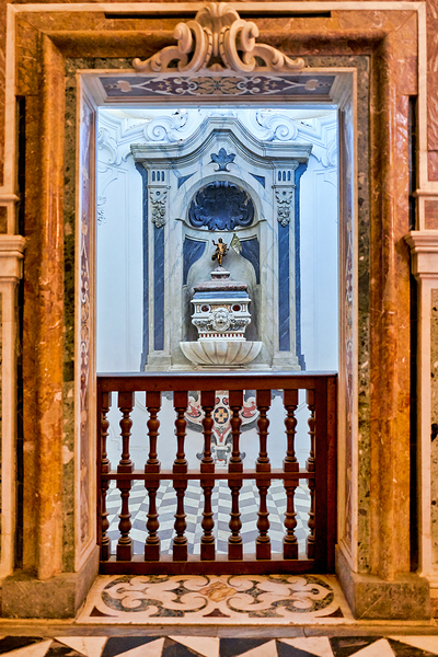 A balcony overlooks an altar in the Certosa di San Martino in Naples. The interior shows detailed architecture and craftsmanship.
