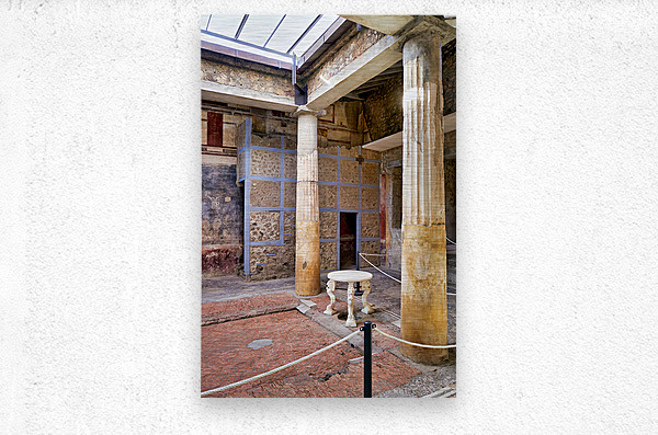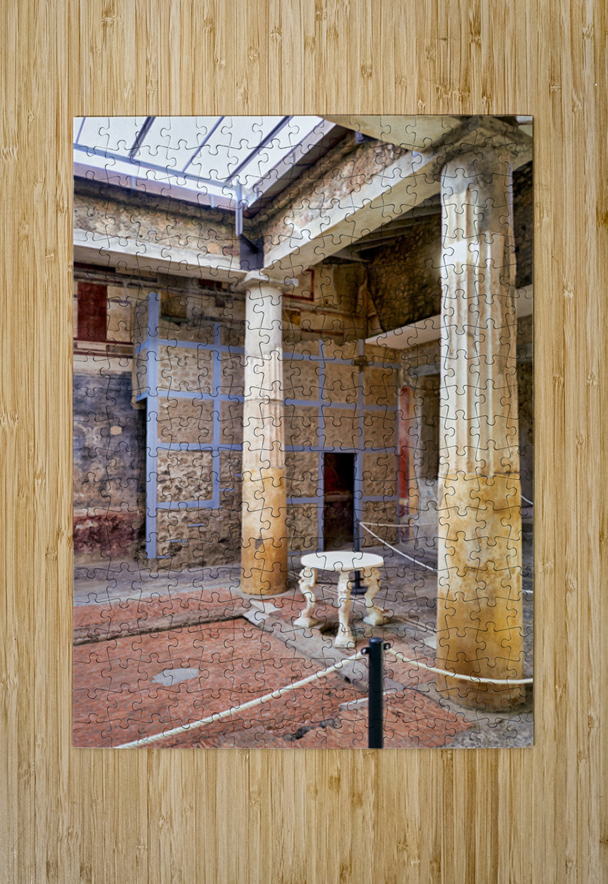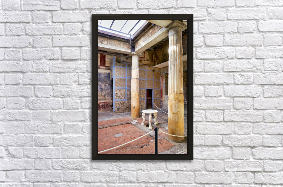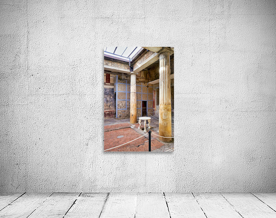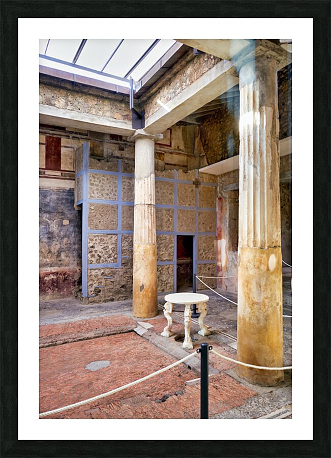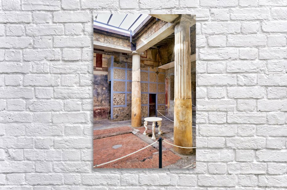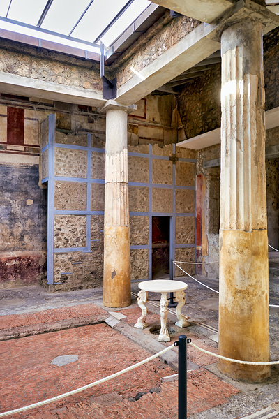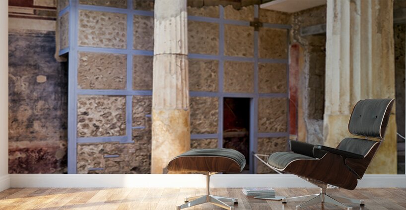 Visitors walk through the ruins of an ancient Roman building in Pompeii Italy. Remaining columns and walls show the citys past.