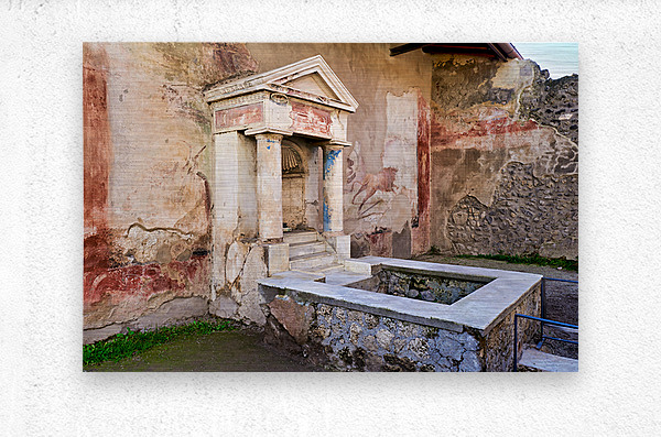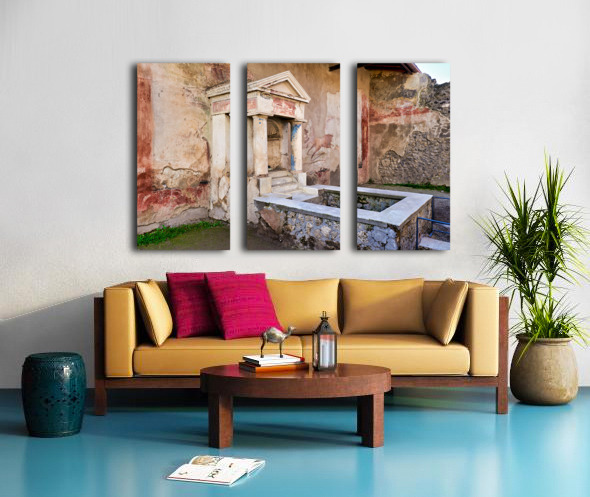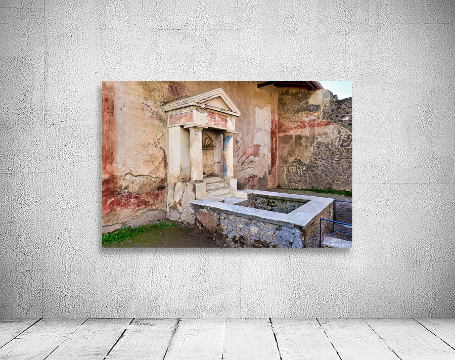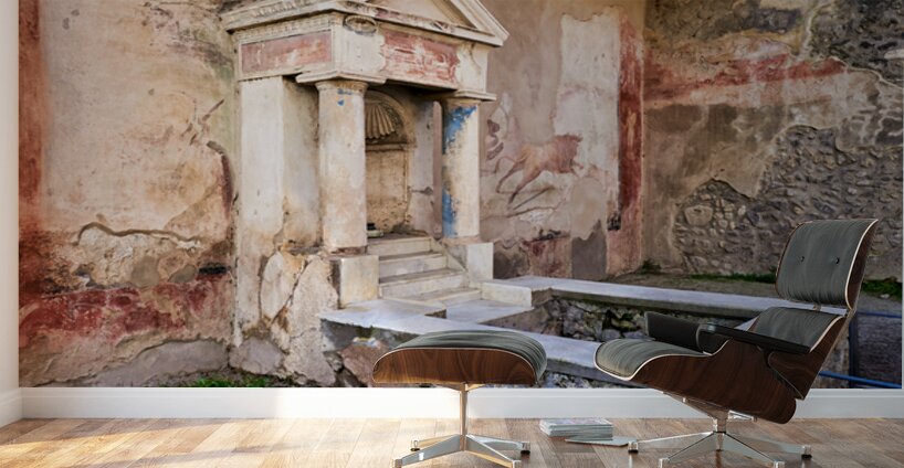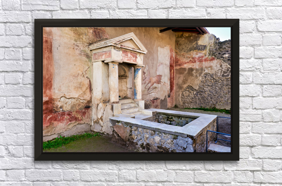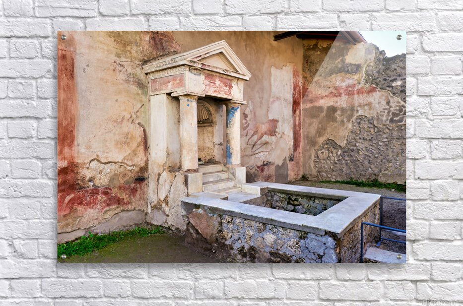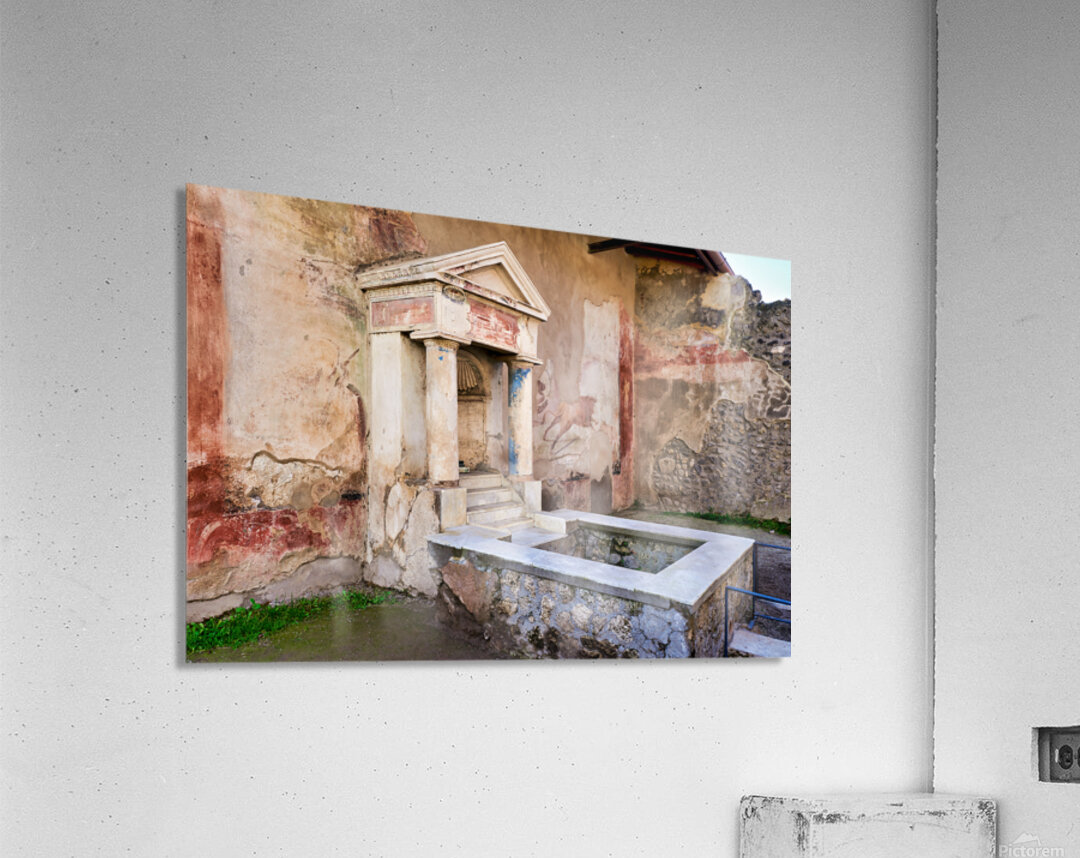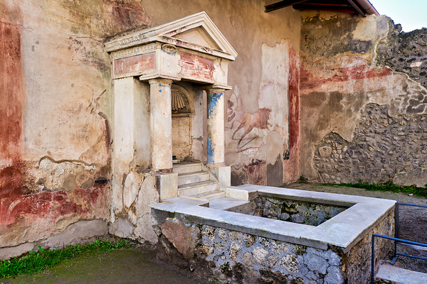 Visitors see the ancient water structure in Pompeii surrounded by old walls and colorful frescoes in Naples Italy during daytime.