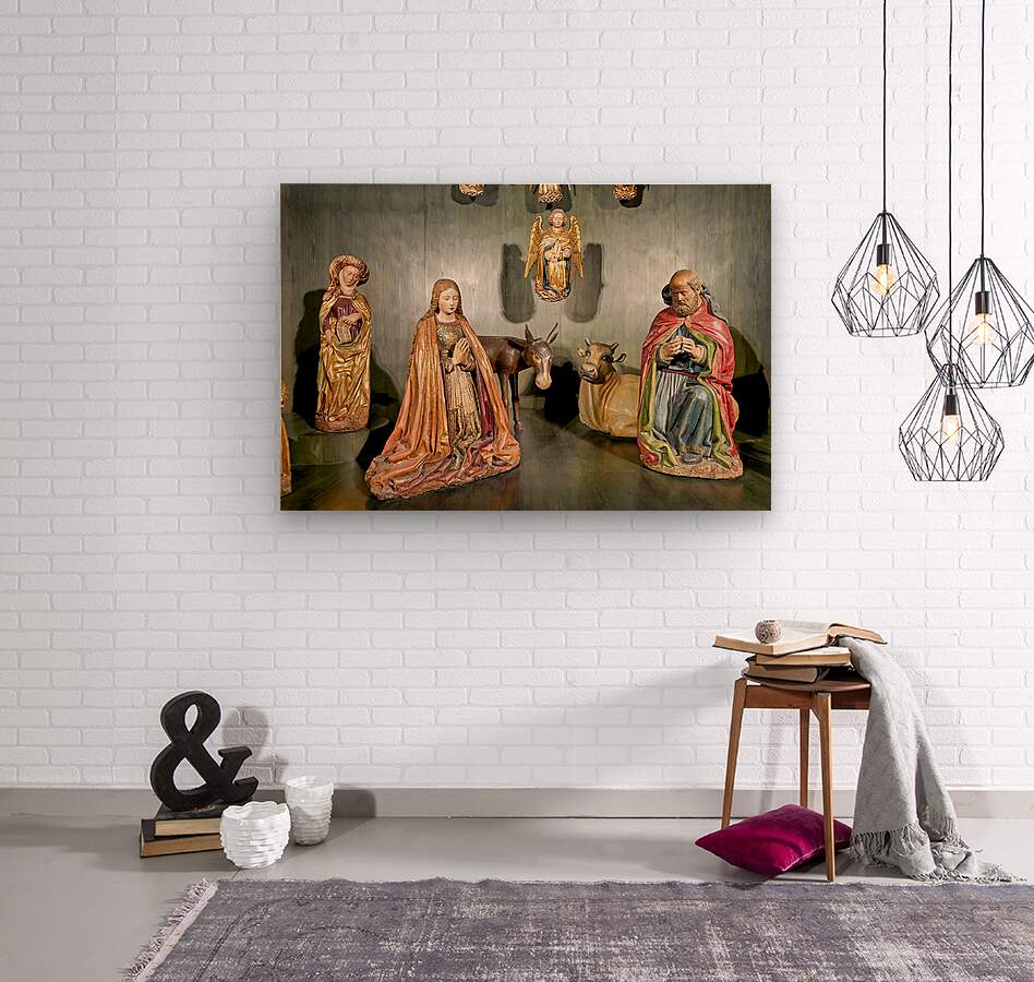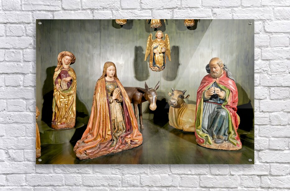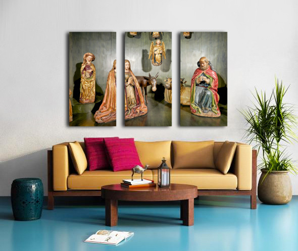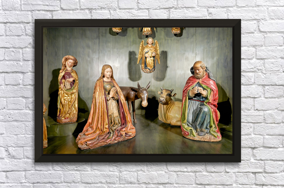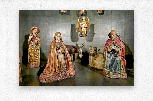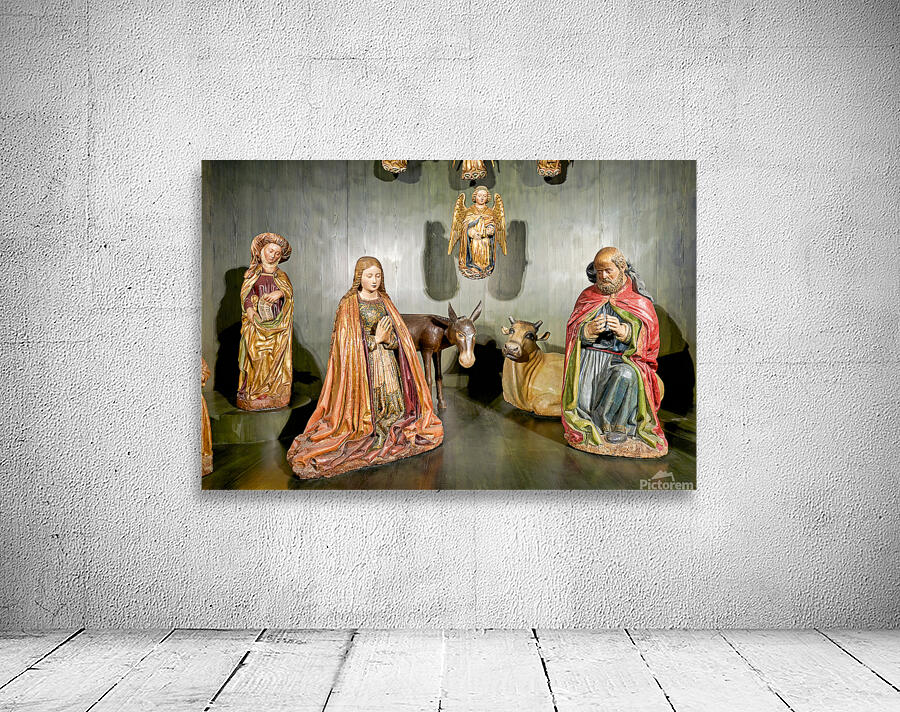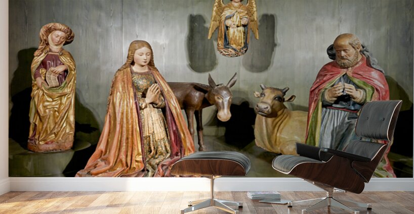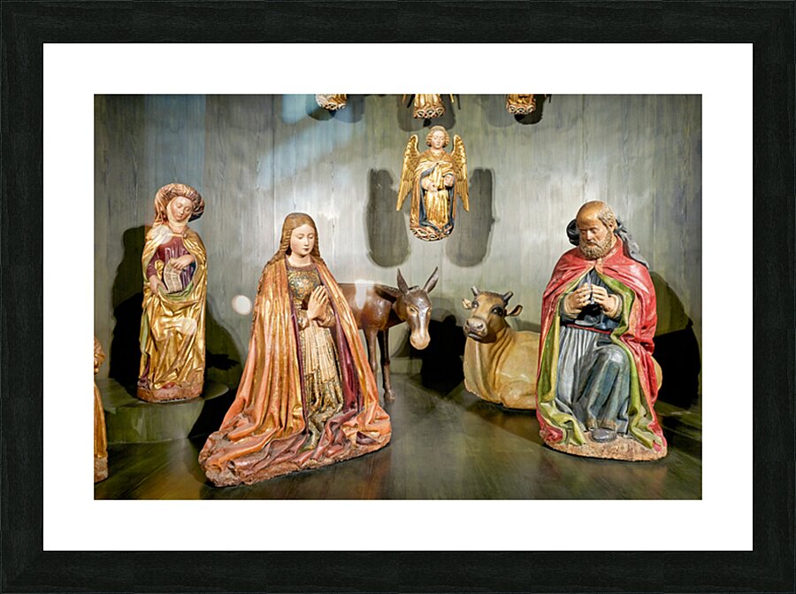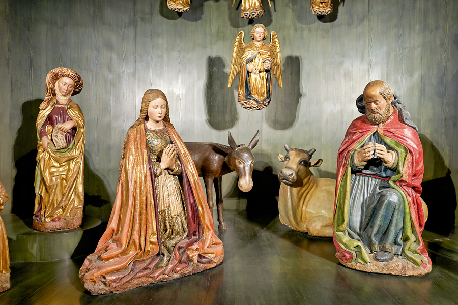 This nativity scene shows figures of Mary Joseph angels and animals set in Certosa di San Martino in Naples during the holiday season.