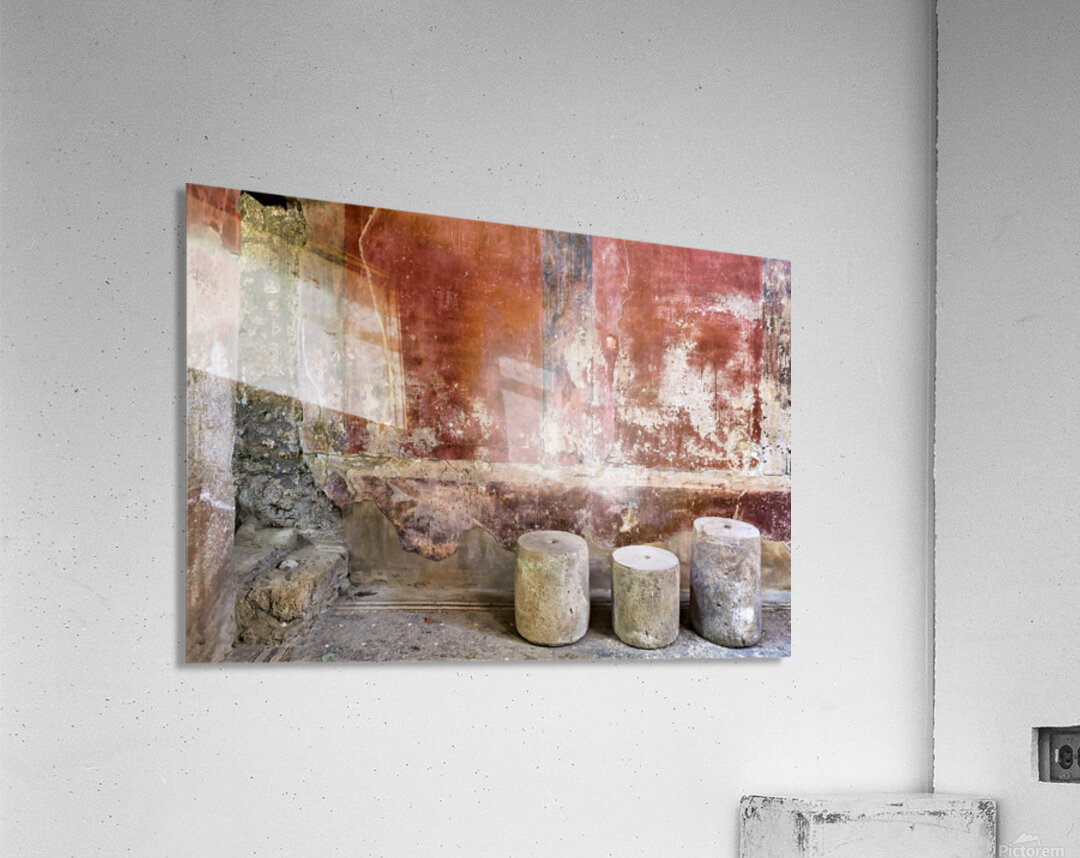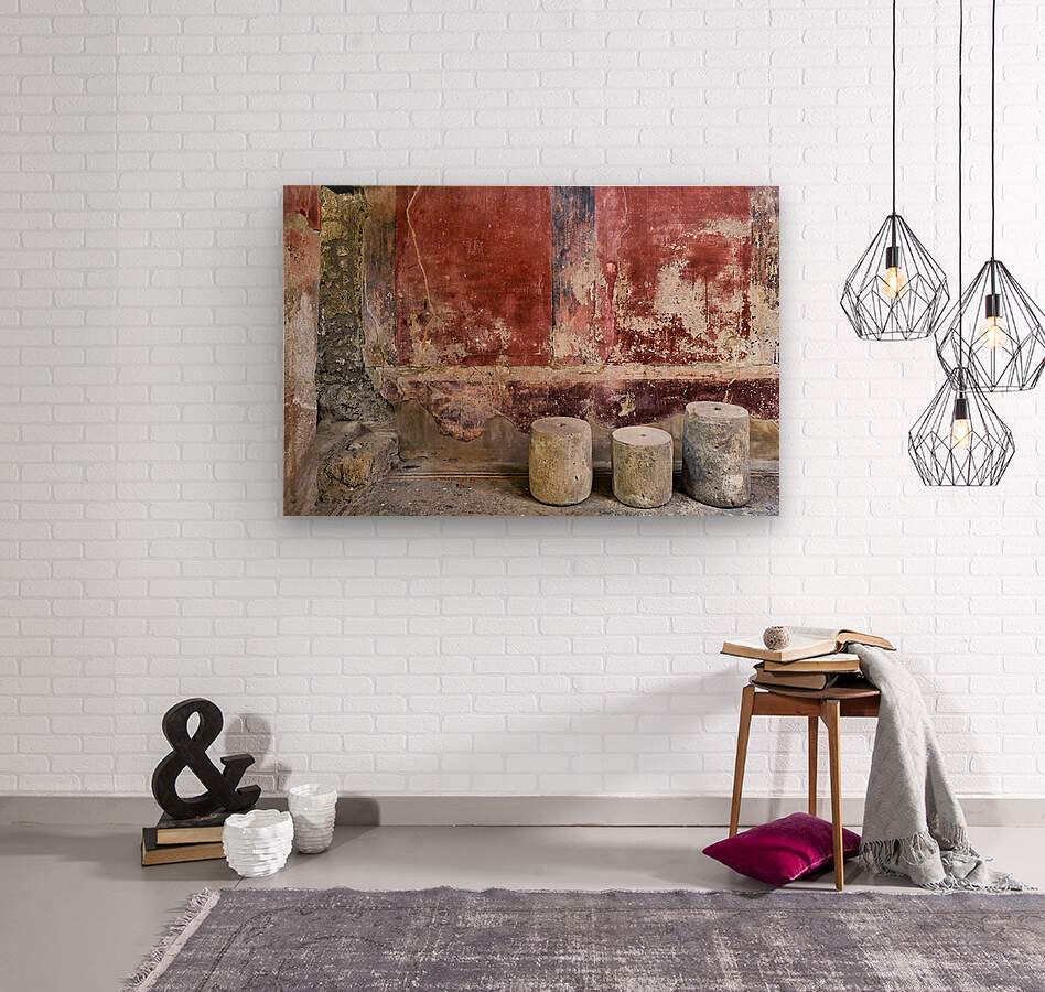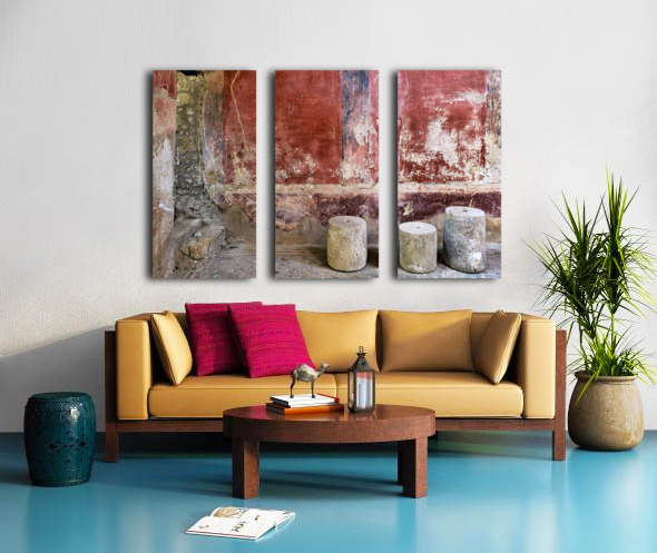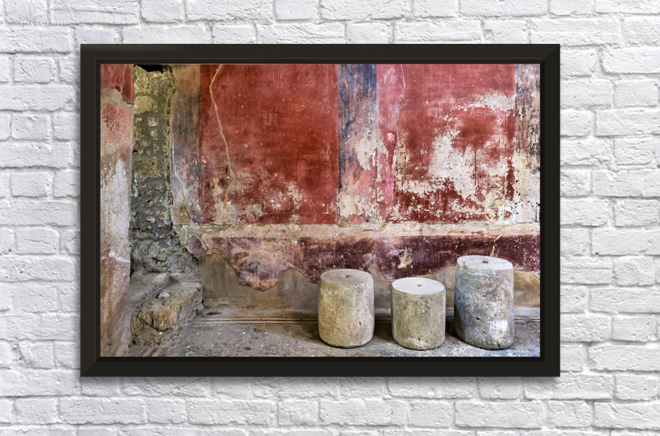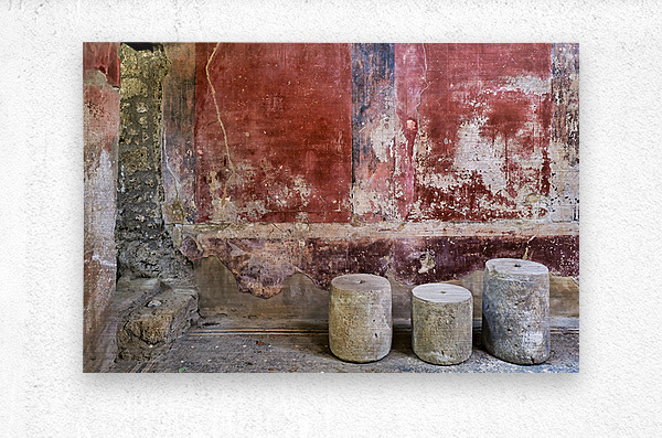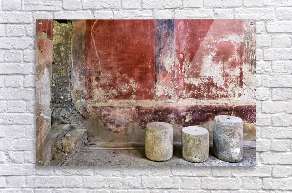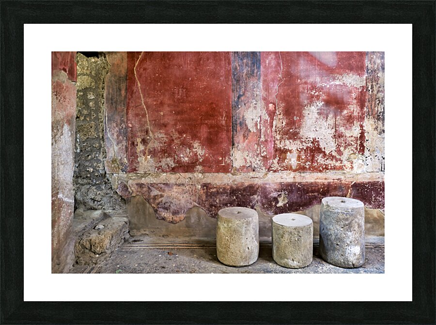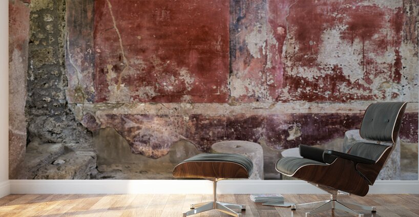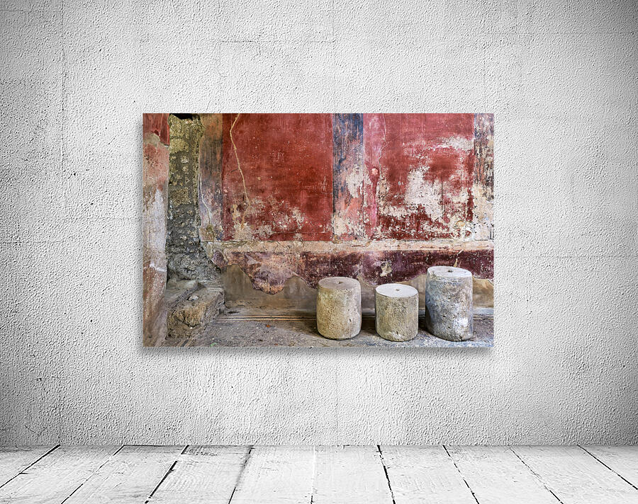 Visitors see three stone seats in an ancient space with a faded red wall in Pompeii an archaeological site in Naples Italy.