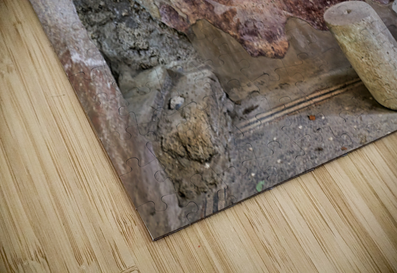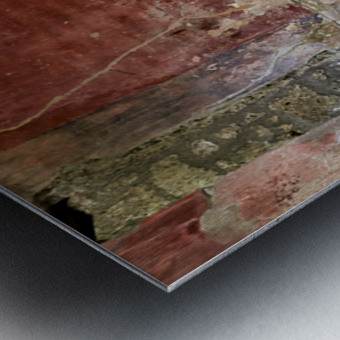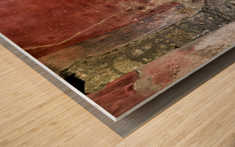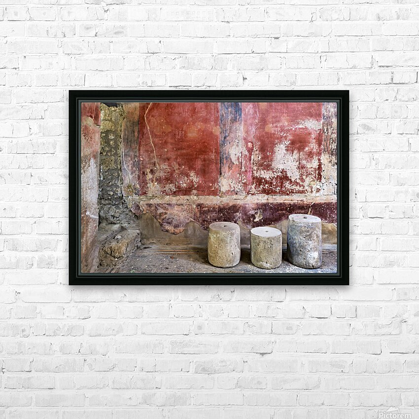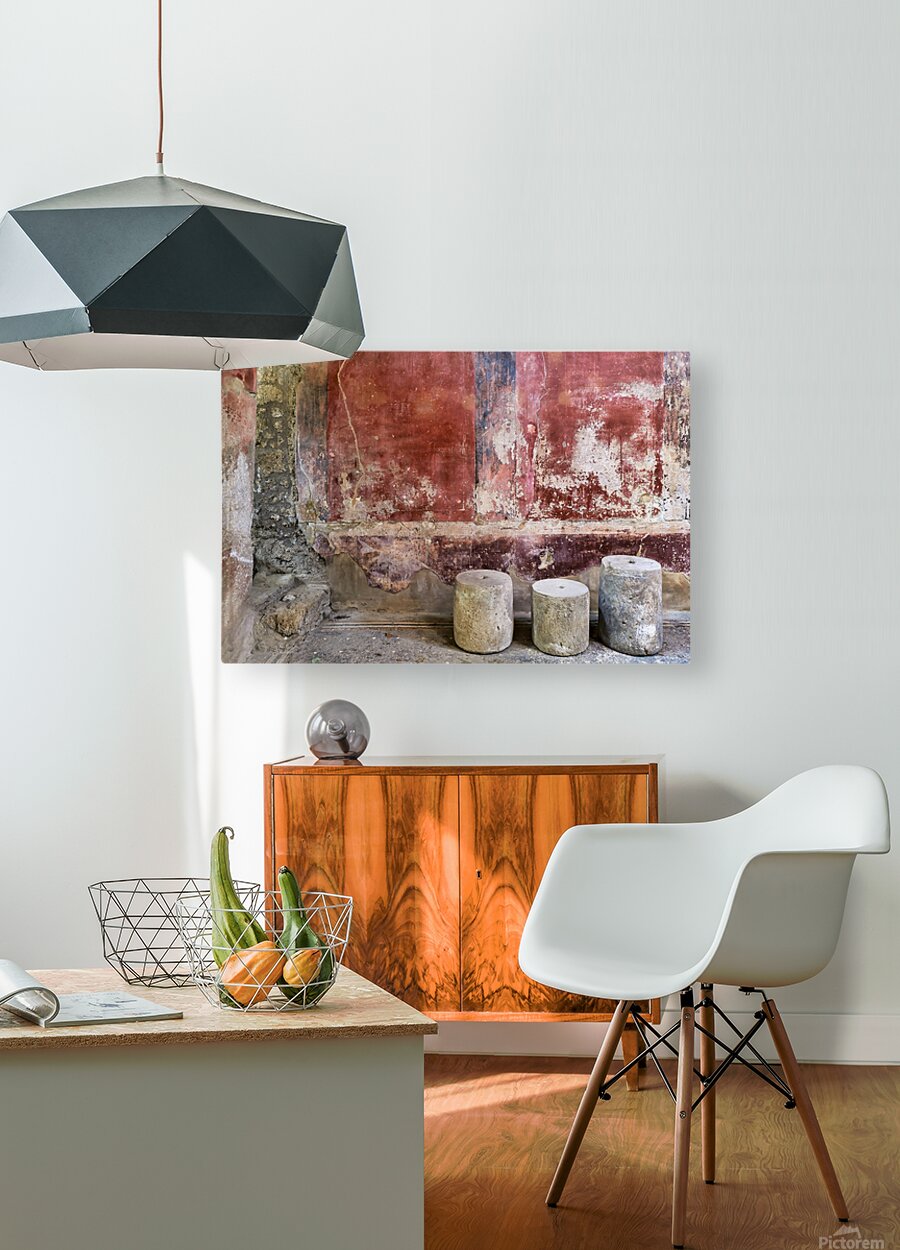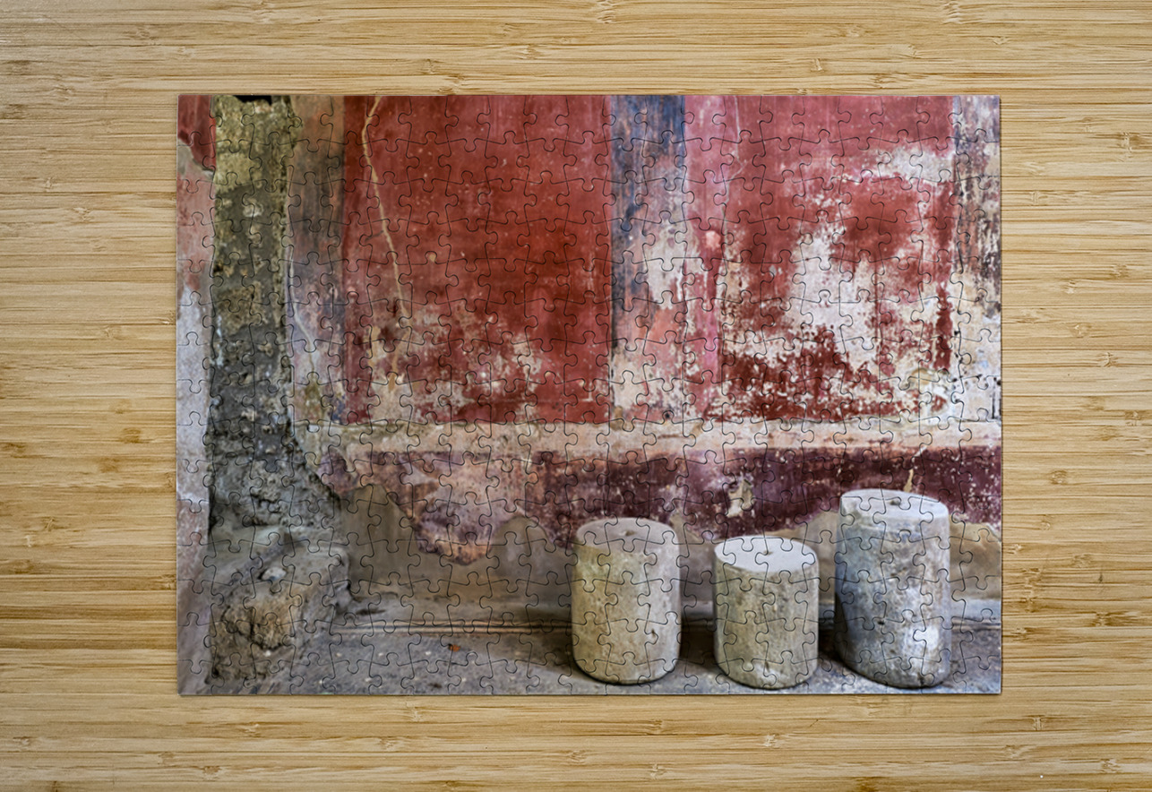 Visitors see three stone seats in an ancient space with a faded red wall in Pompeii an archaeological site in Naples Italy.