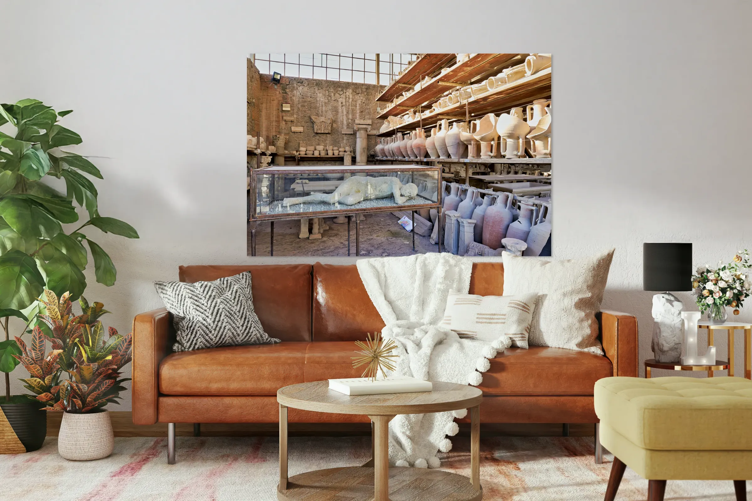 Pompeii site showing artifacts and a plaster cast of a victim Picture Frame Printing