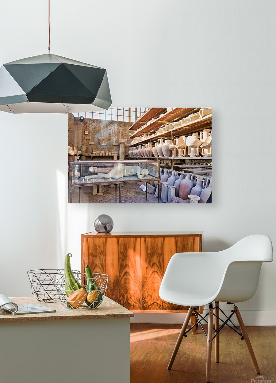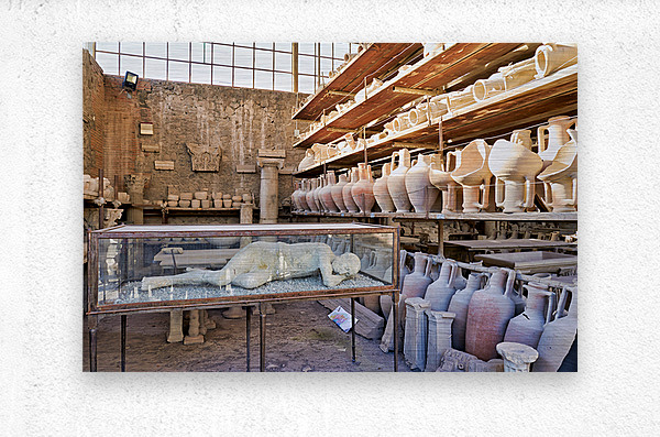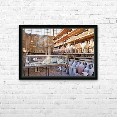 Get this artwork "Pompeii site showing artifacts and a plaster cast of a victim" in a framed print.
