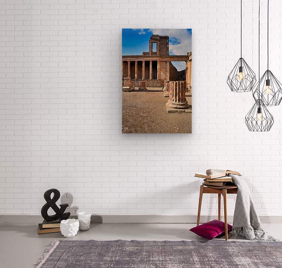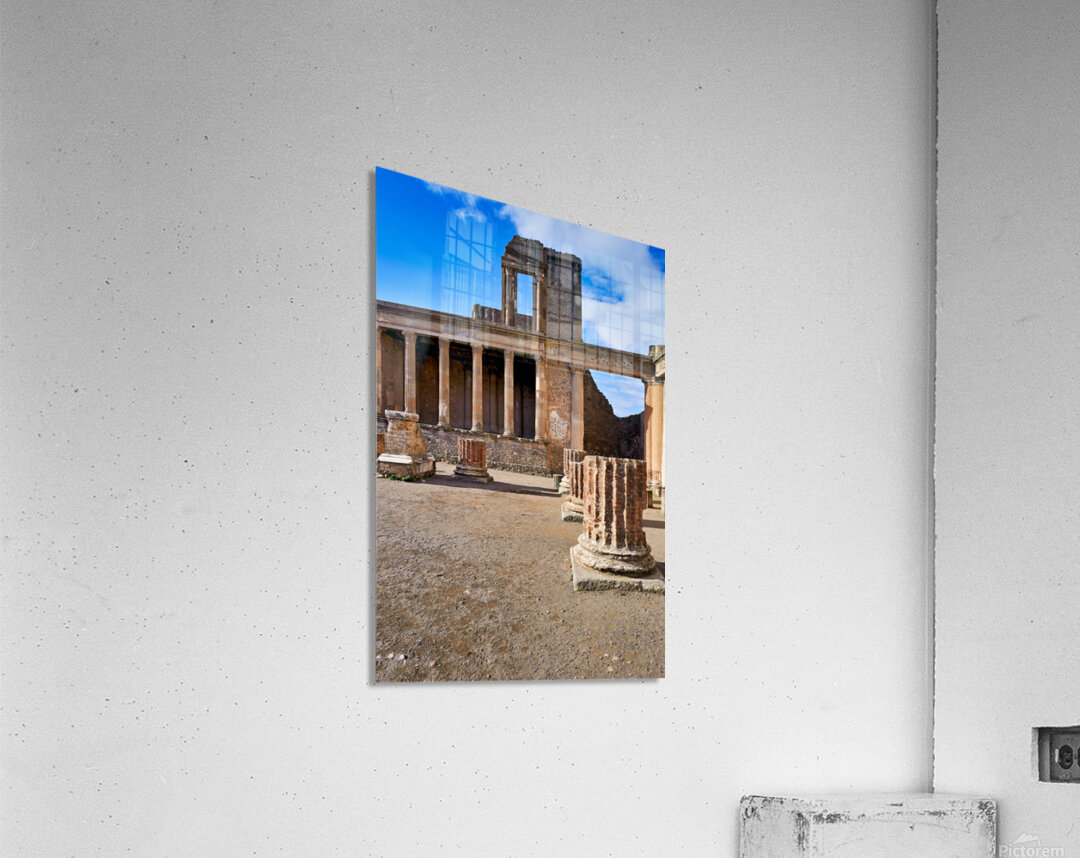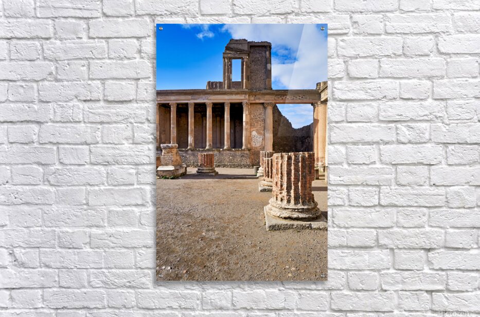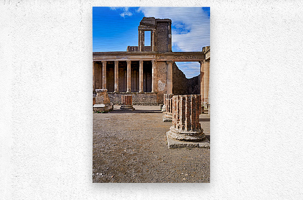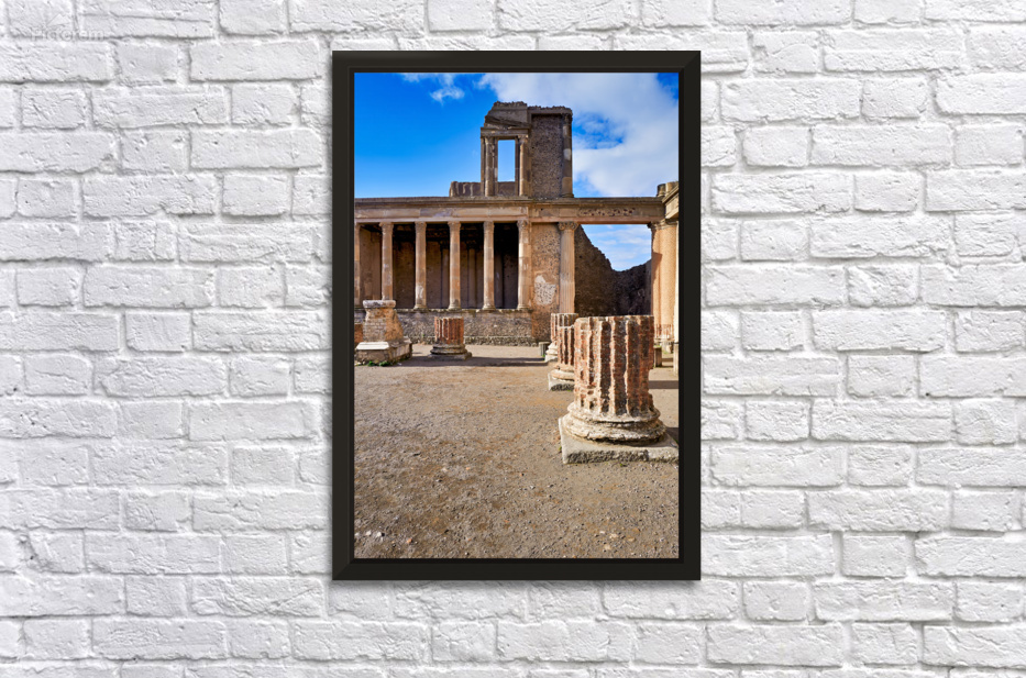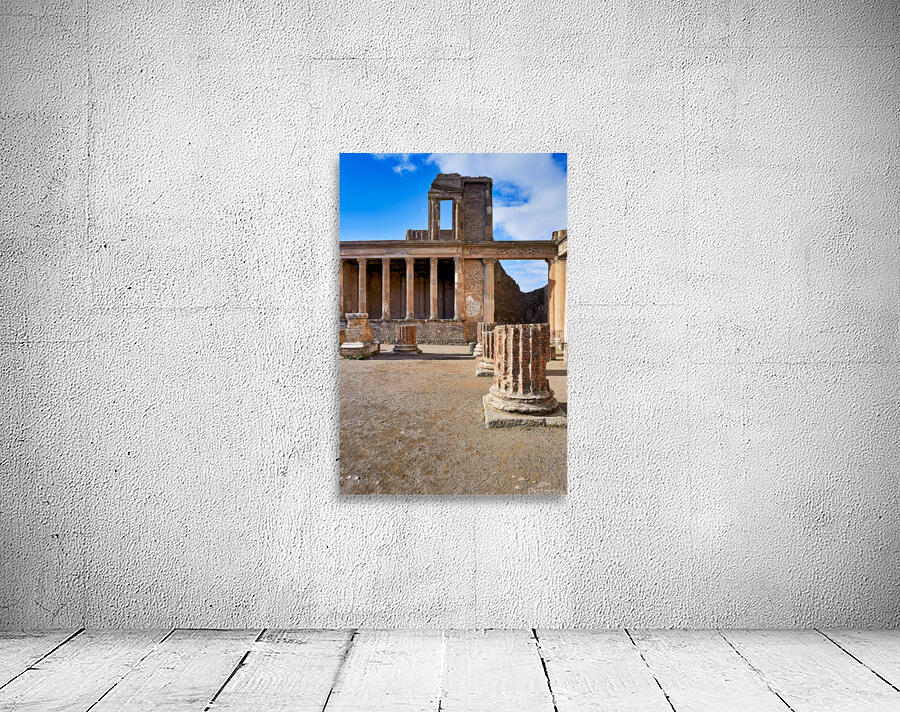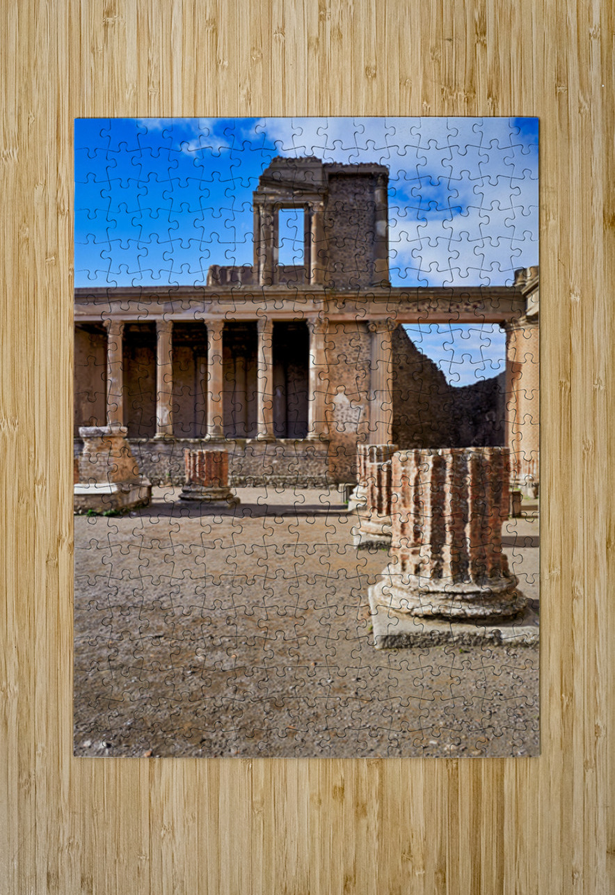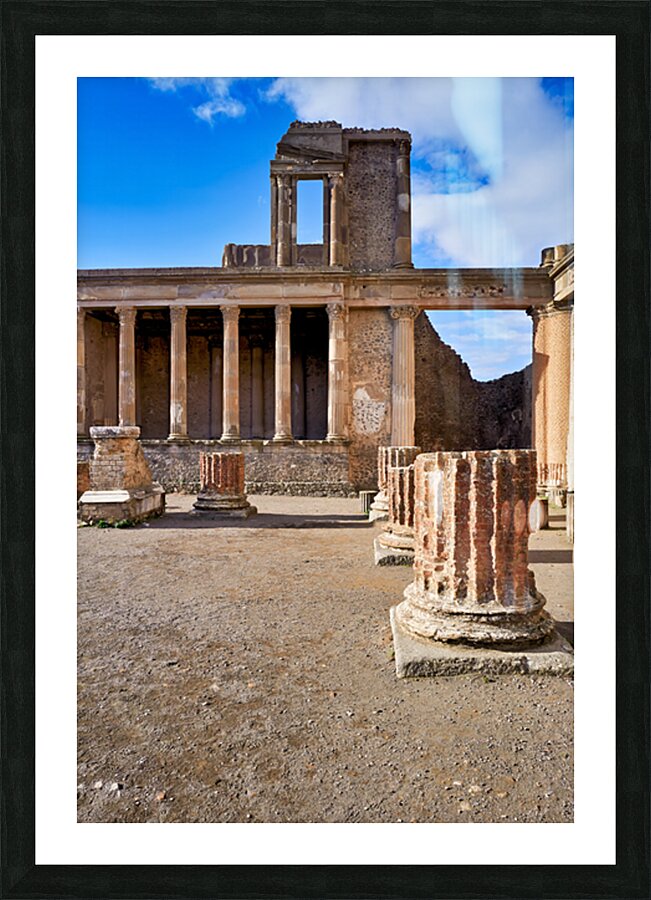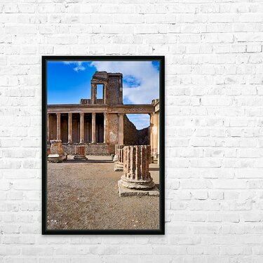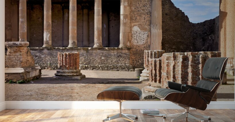 Visitors explore the ruins of ancient buildings in Pompeii. The site shows columns and stone structures. Sunlight illuminates the historical site.