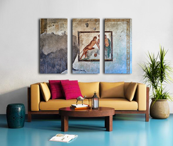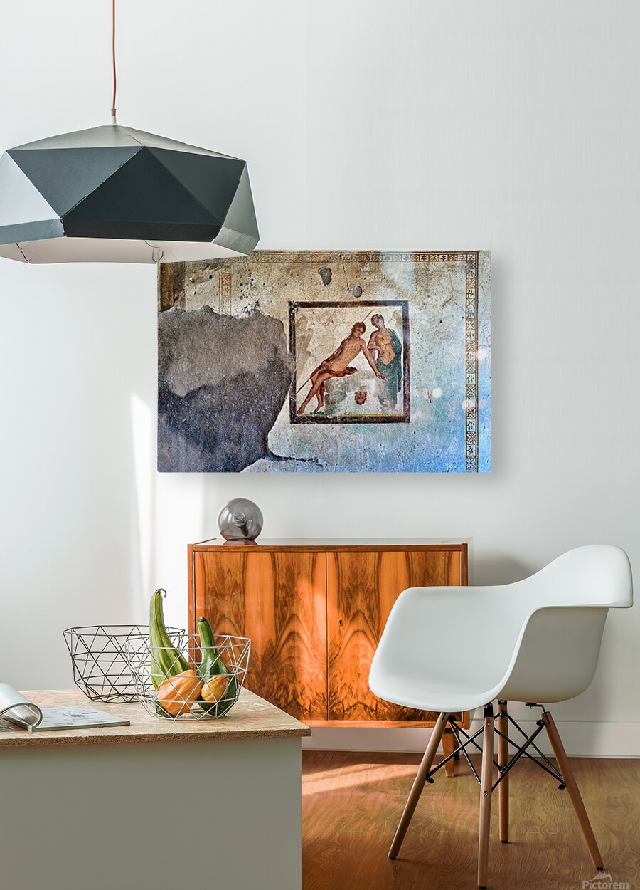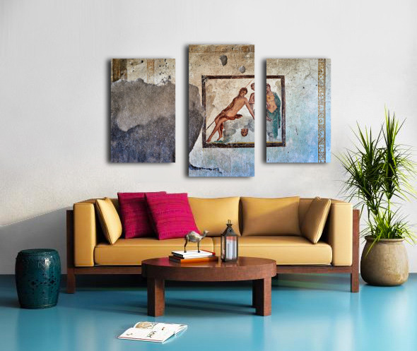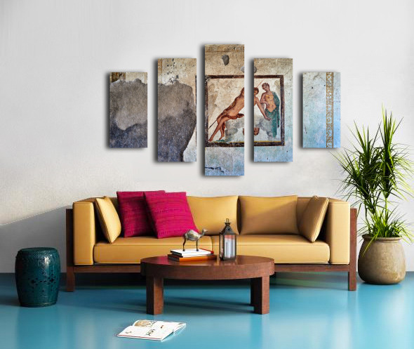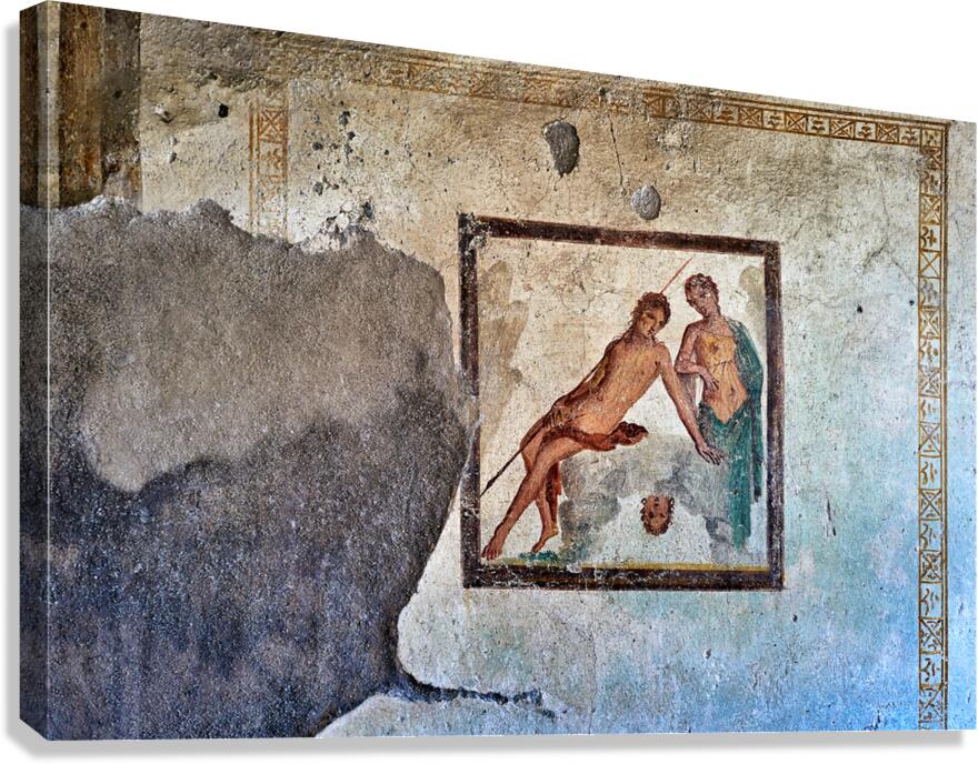 Get this artwork "Ancient mural from Pompeii shows figures in a dramatic scene" in a framed print.