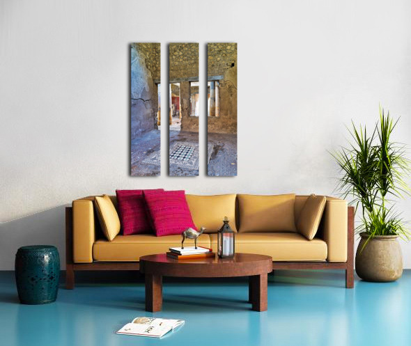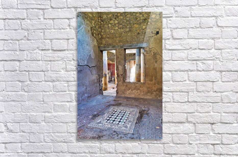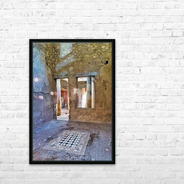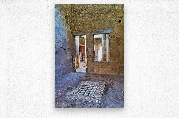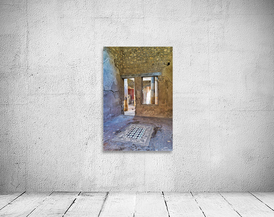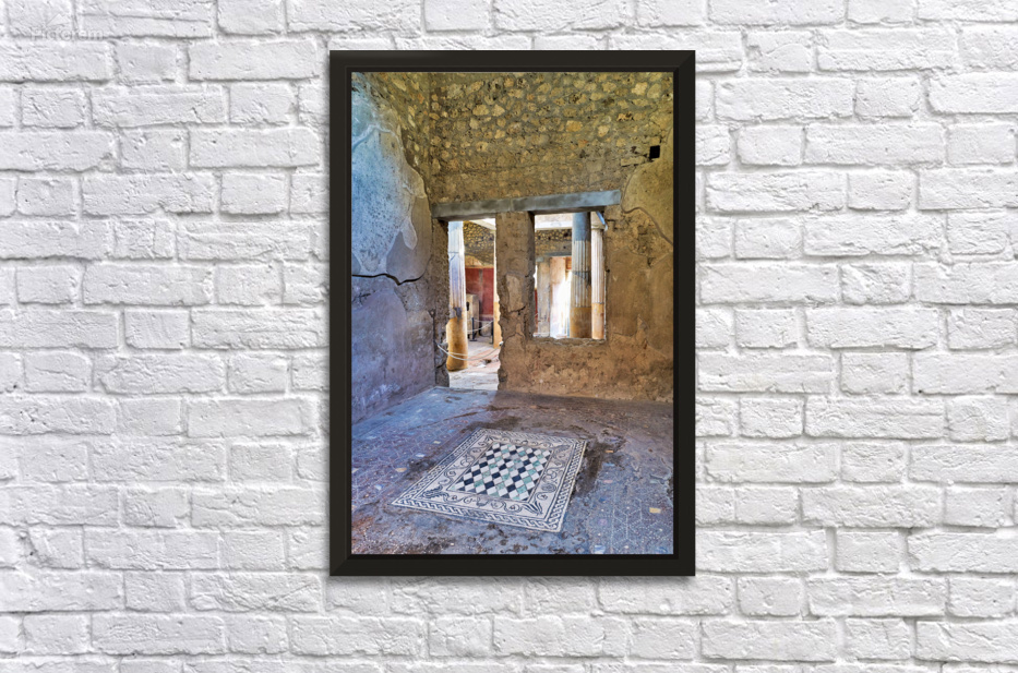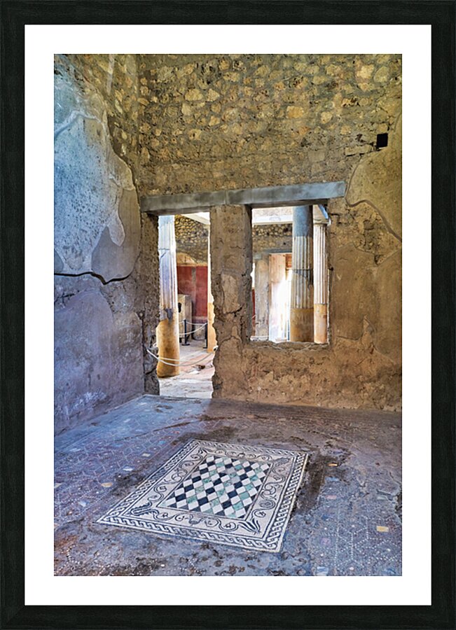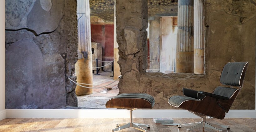 Visitors look at the ancient walls and mosaic floors in the Pompeii site. The ruins show remnants of Roman life in the past.