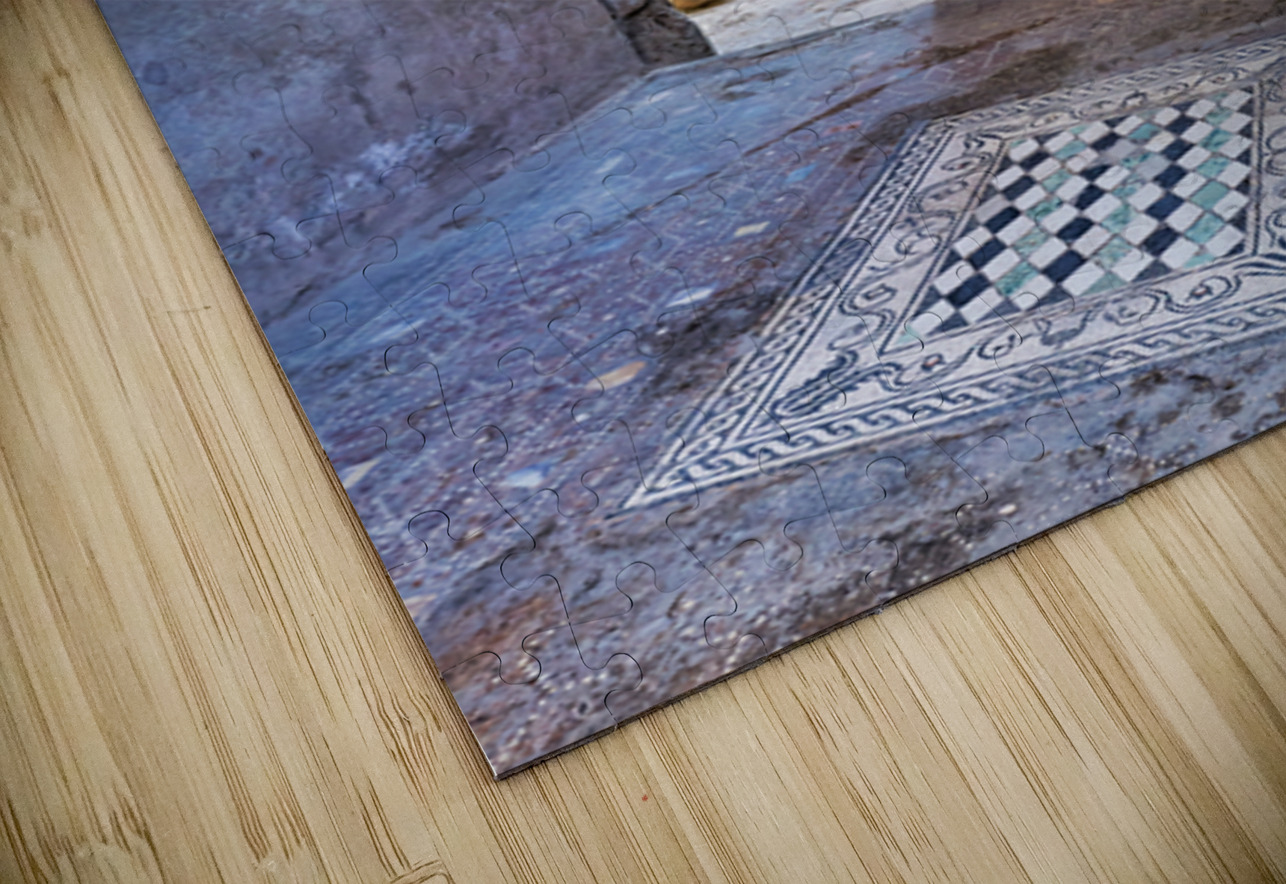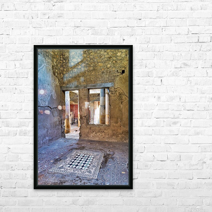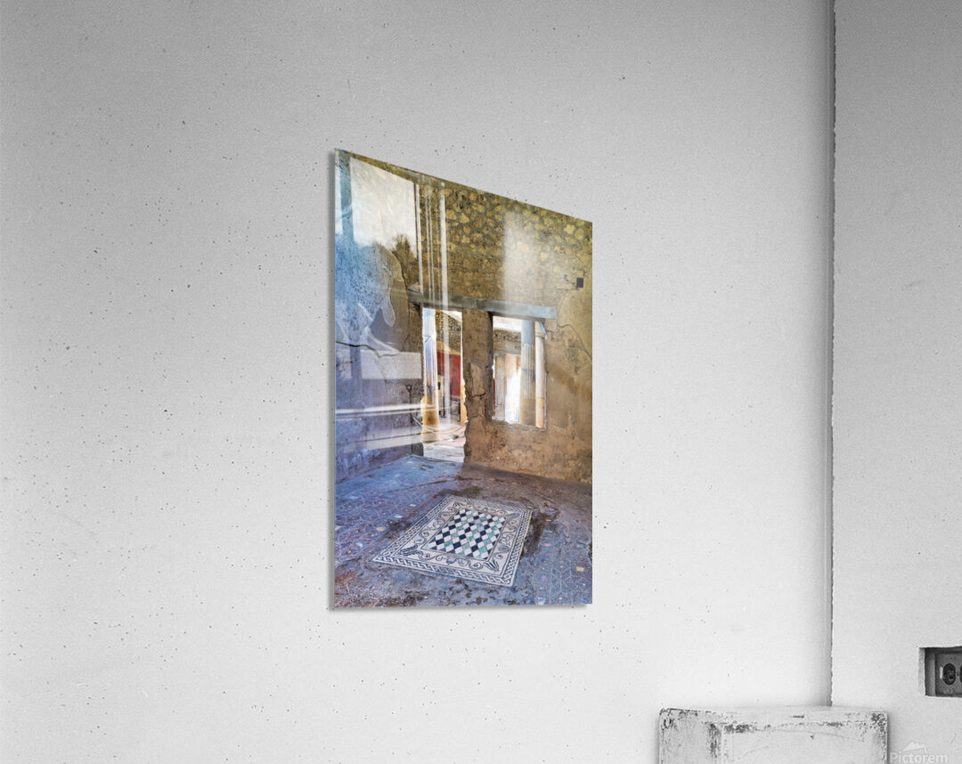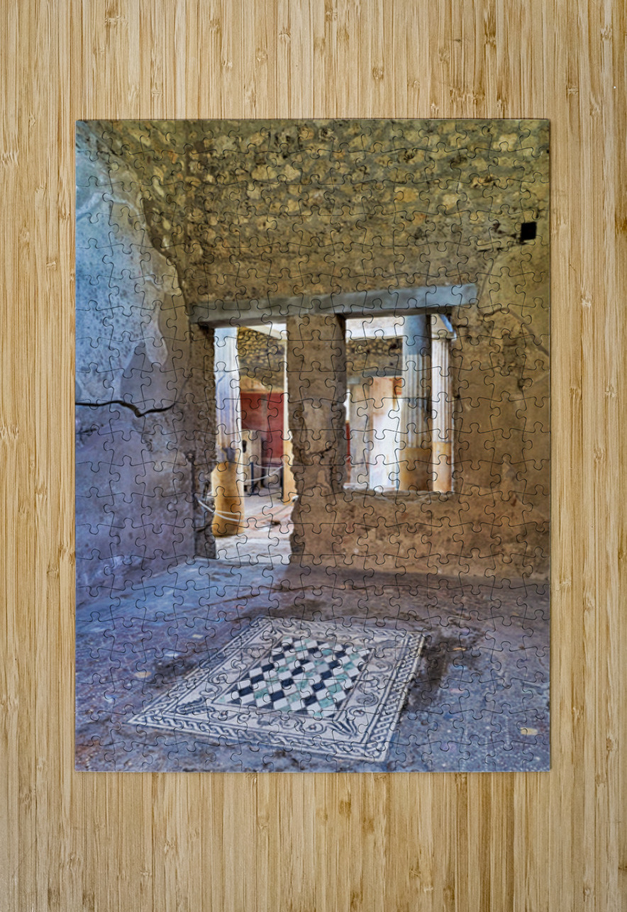 Visitors look at the ancient walls and mosaic floors in the Pompeii site. The ruins show remnants of Roman life in the past.
