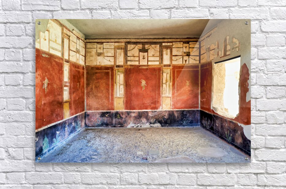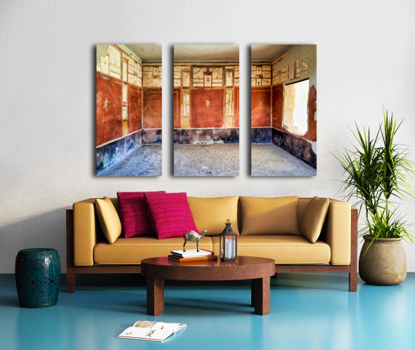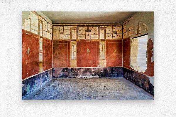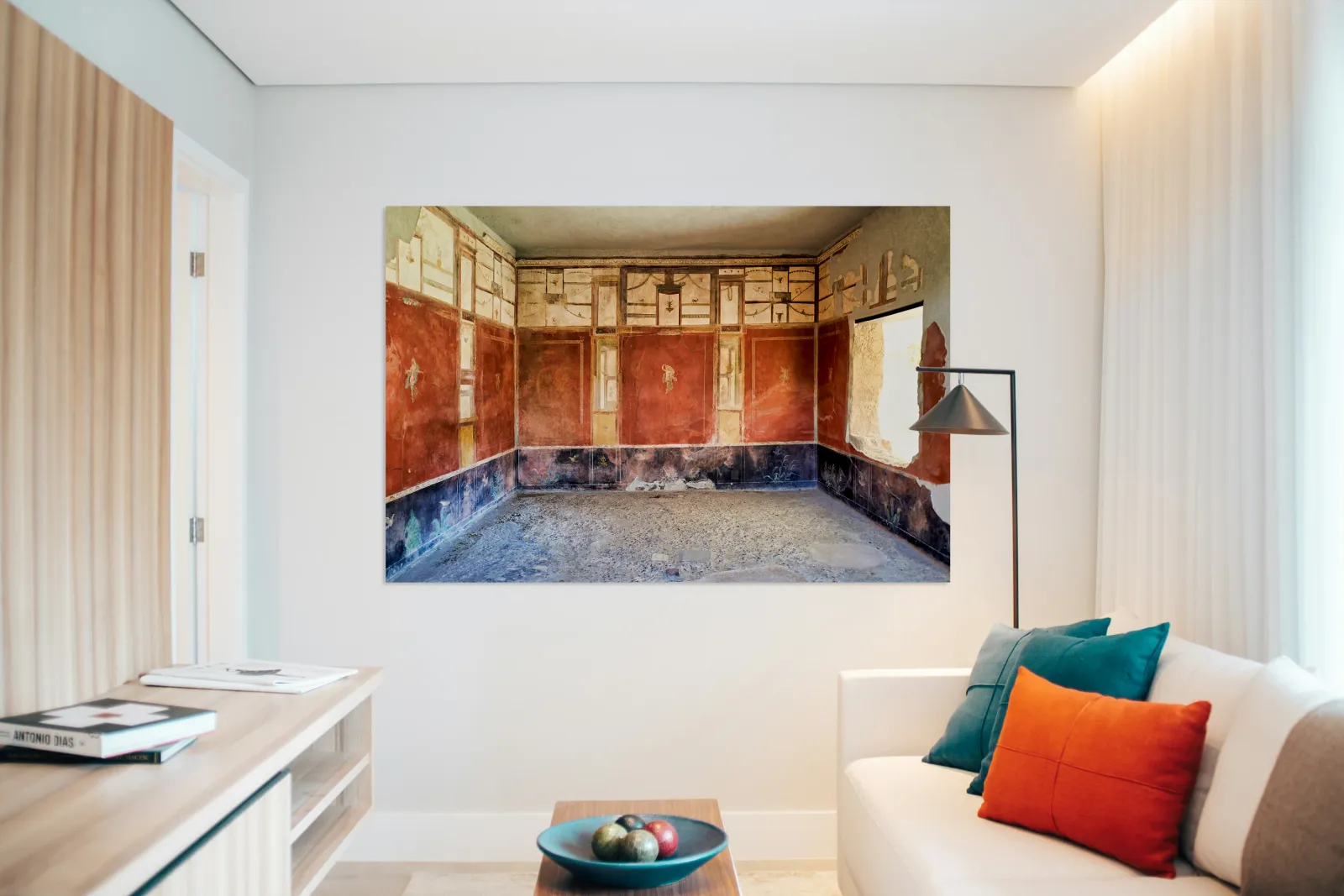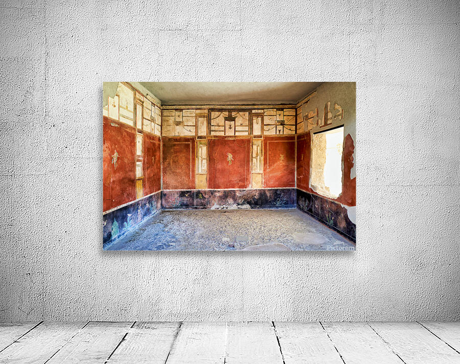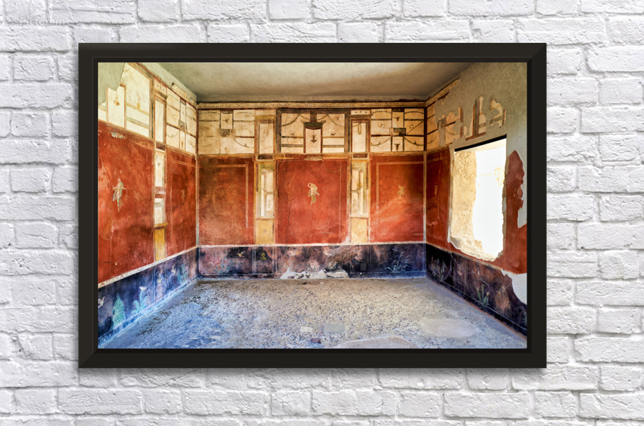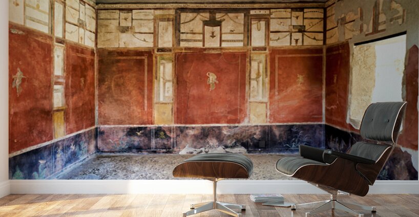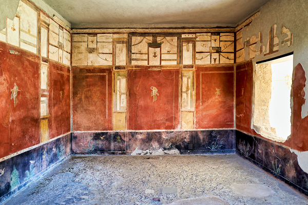 Visitors walk through a room in Pompeii viewing ancient paintings and wall designs that date back to Roman times in Italy.