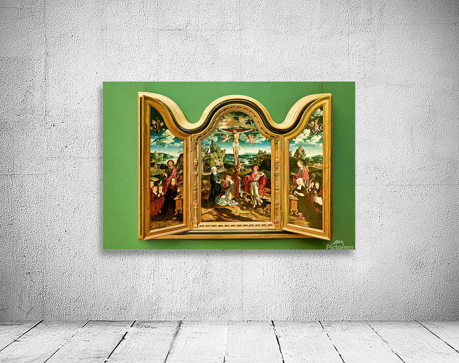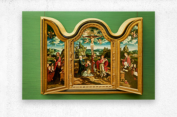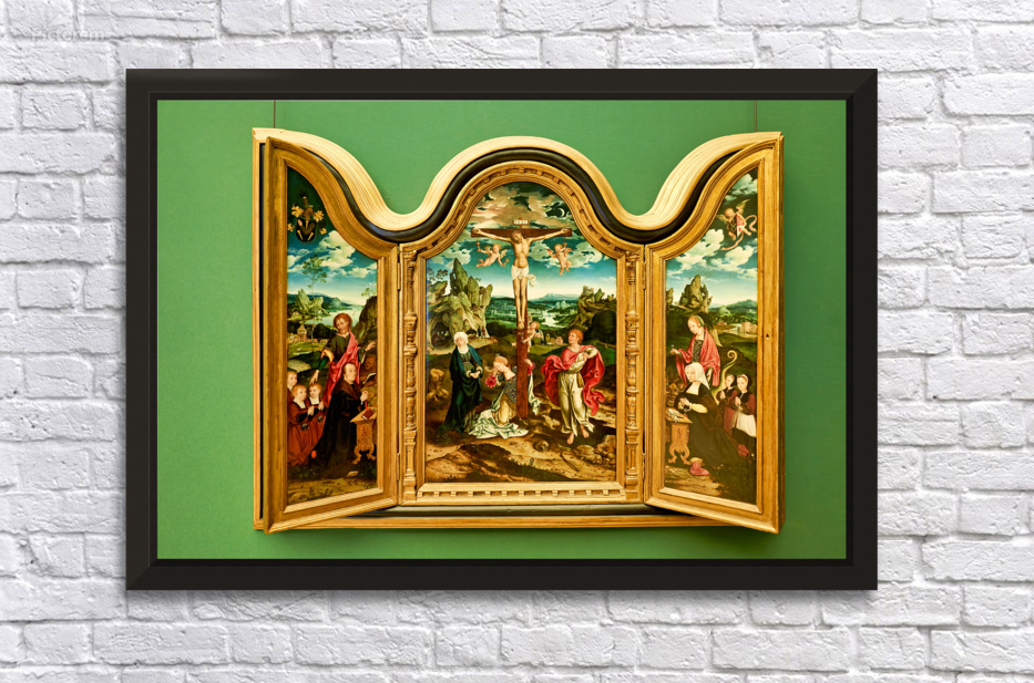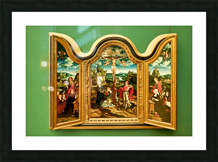 Mosaic panel shows a religious scene with figures and a cross in the Museo di Capodimonte Naples. Visitors admire the artwork in the gallery.
