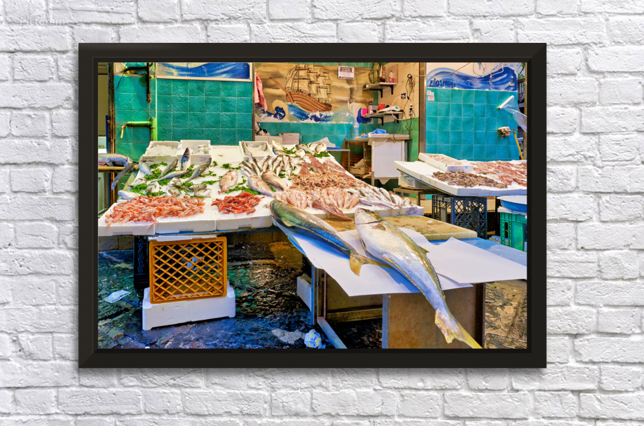 Fresh fish and seafood are displayed at a fishmongers in Pignasecca quarter. People are shopping for seafood in Naples.