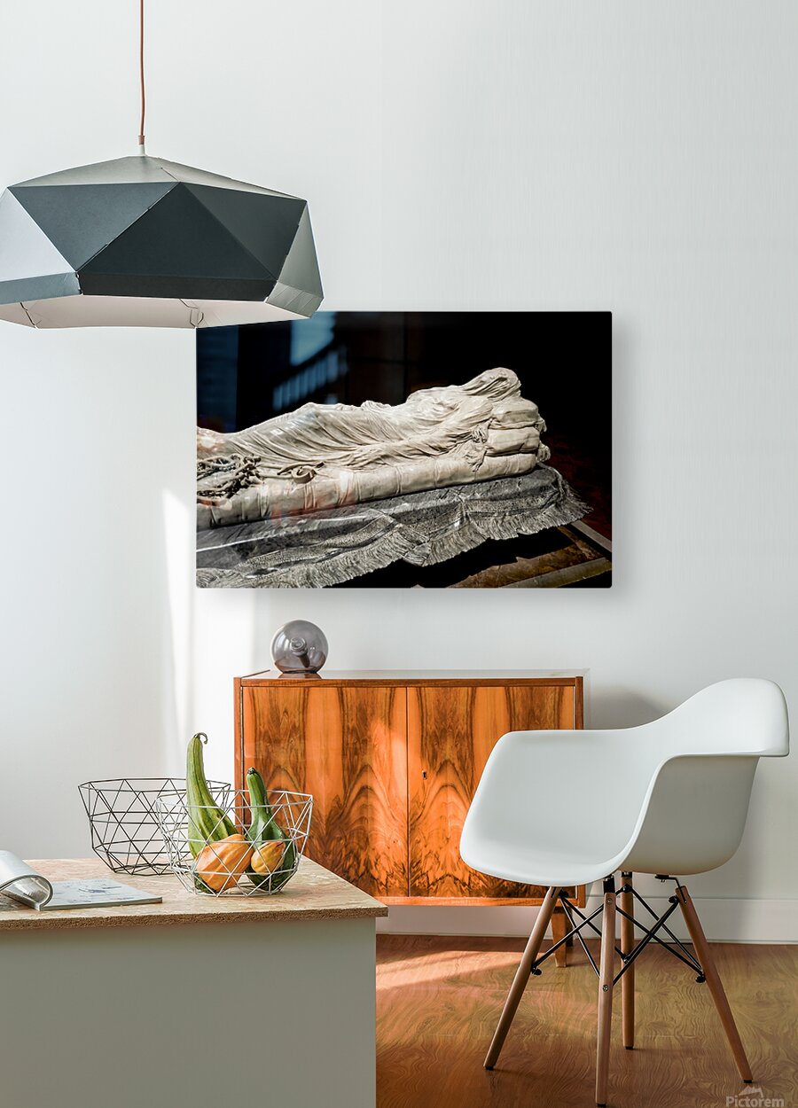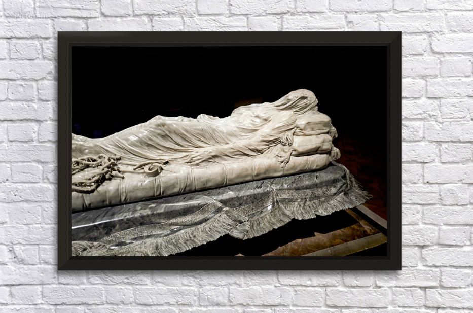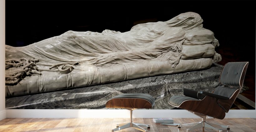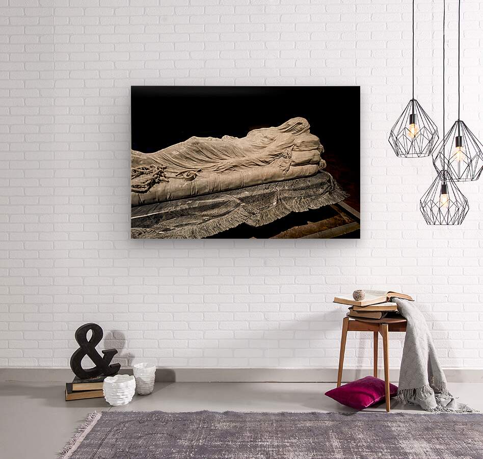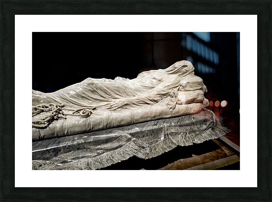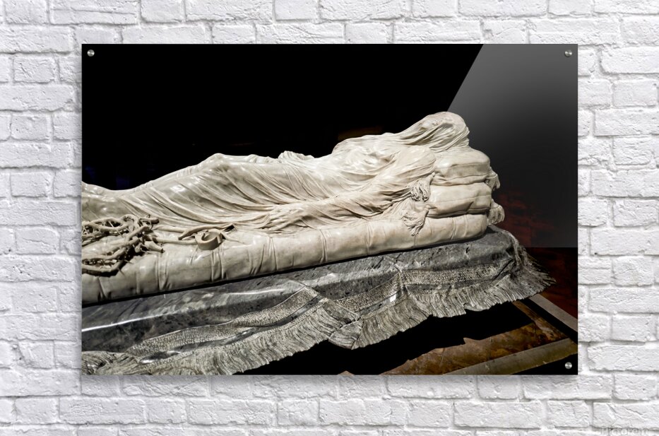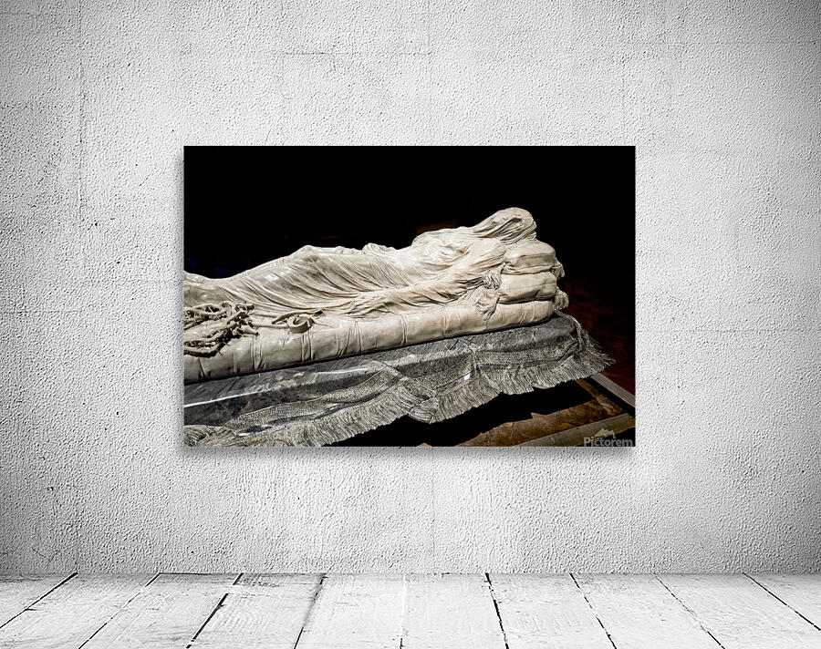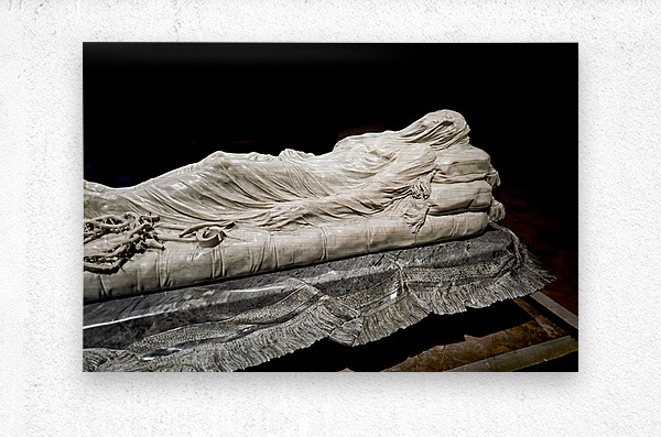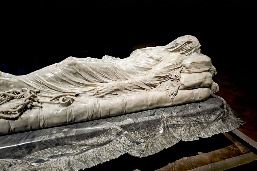This sculpture of the Veiled Christ shows the body of Christ covered by a veil. It is found in Sansevero Chapel in Naples during daytime.