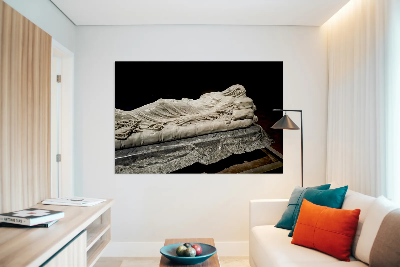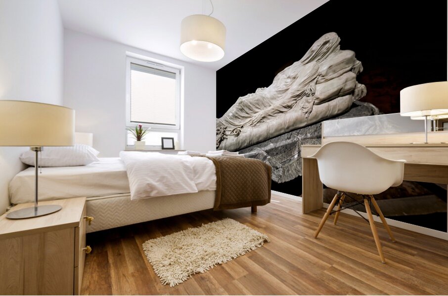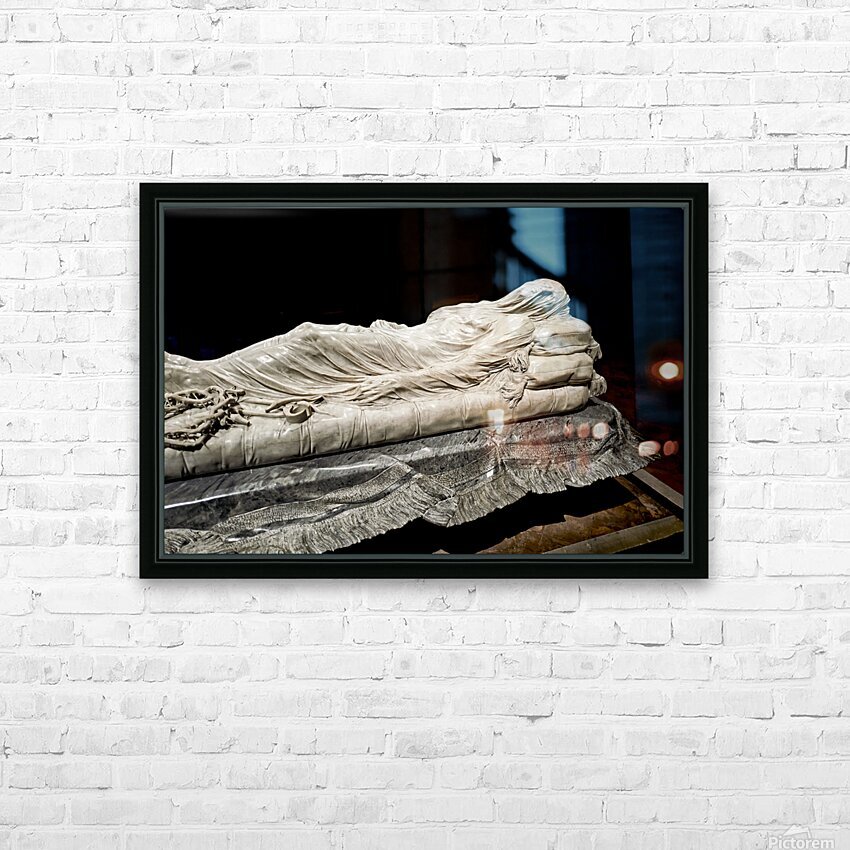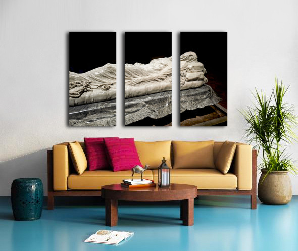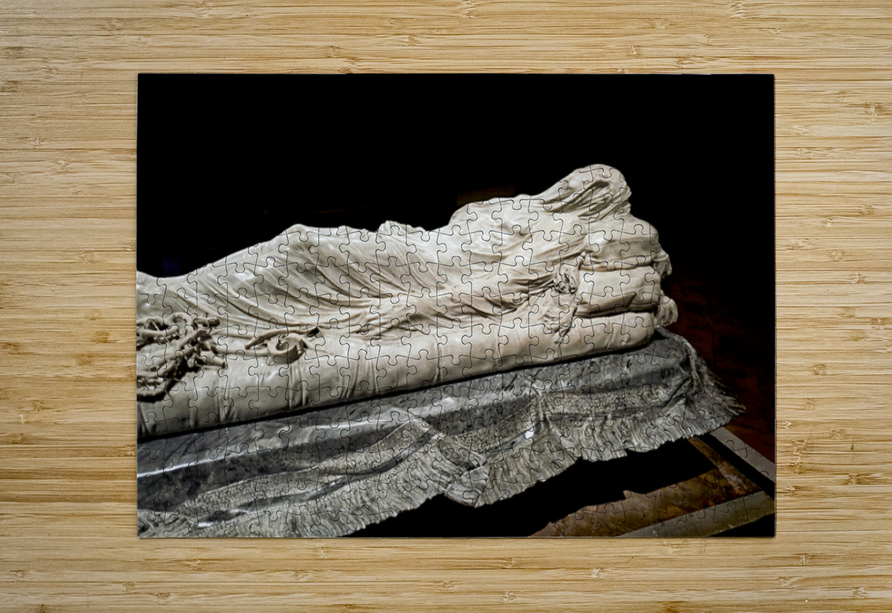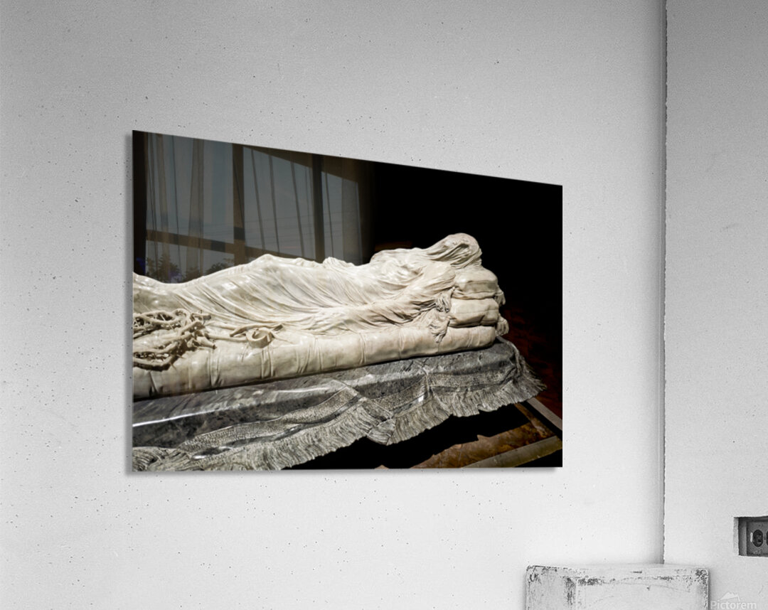 This sculpture of the Veiled Christ shows the body of Christ covered by a veil. It is found in Sansevero Chapel in Naples during daytime.