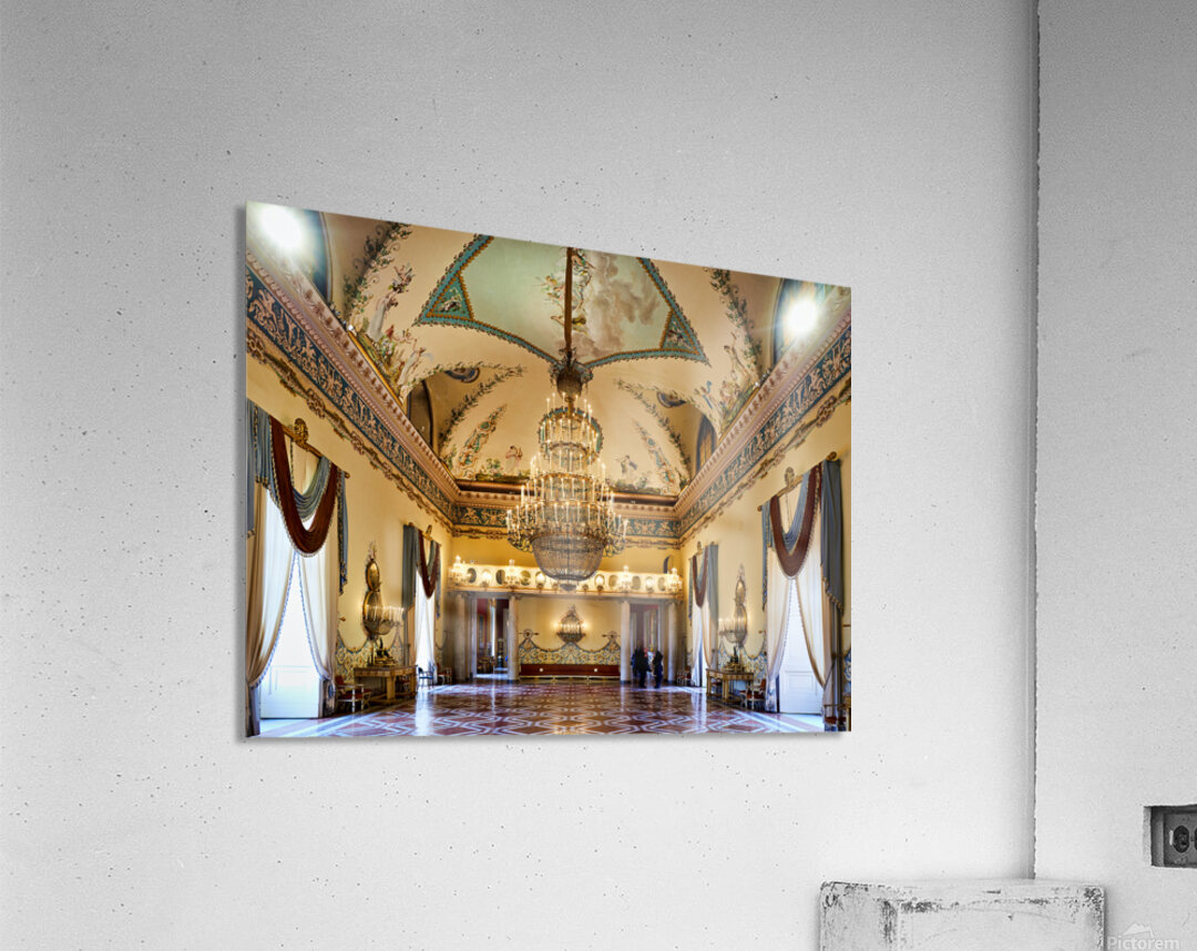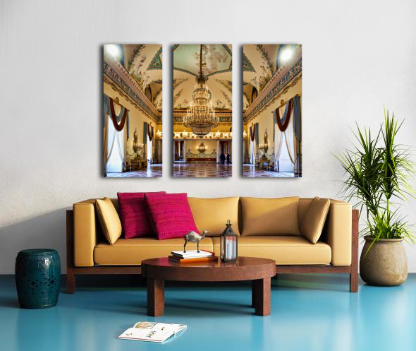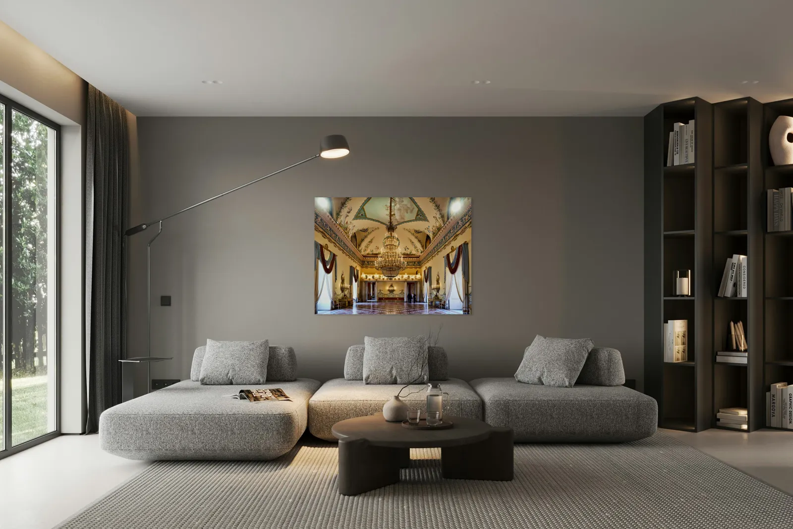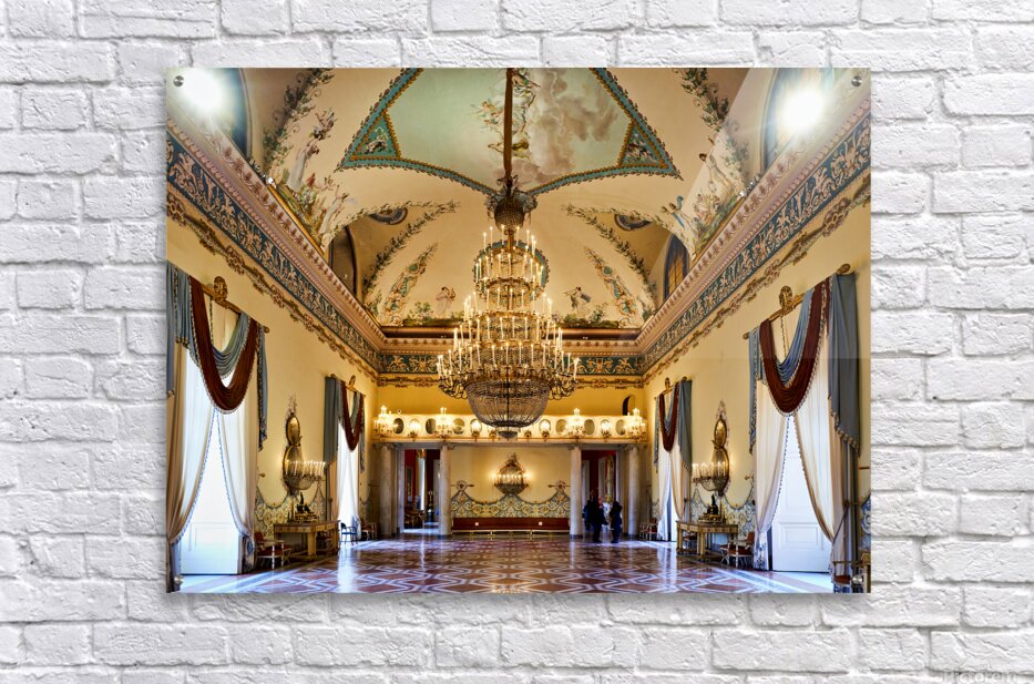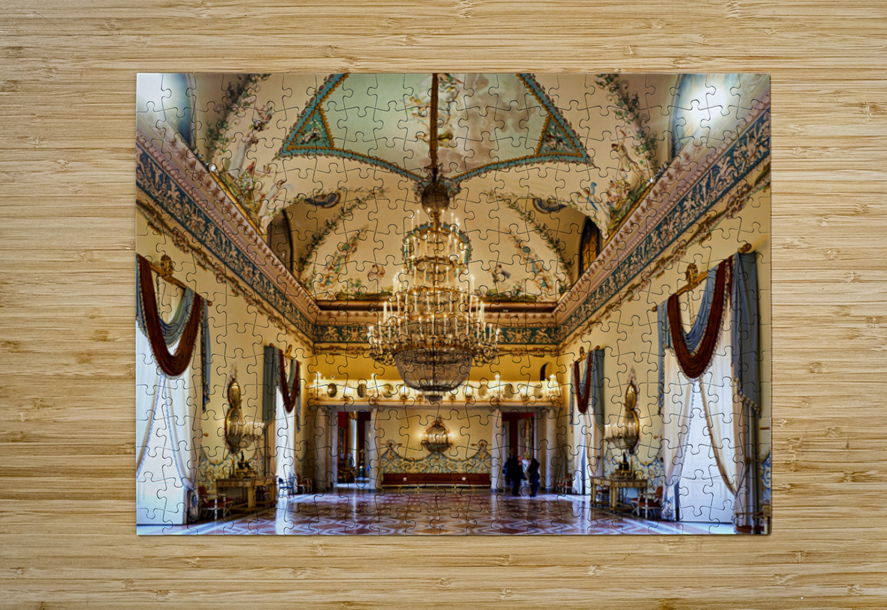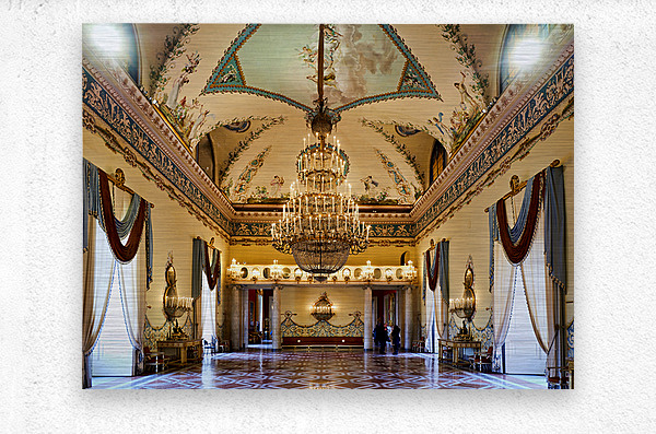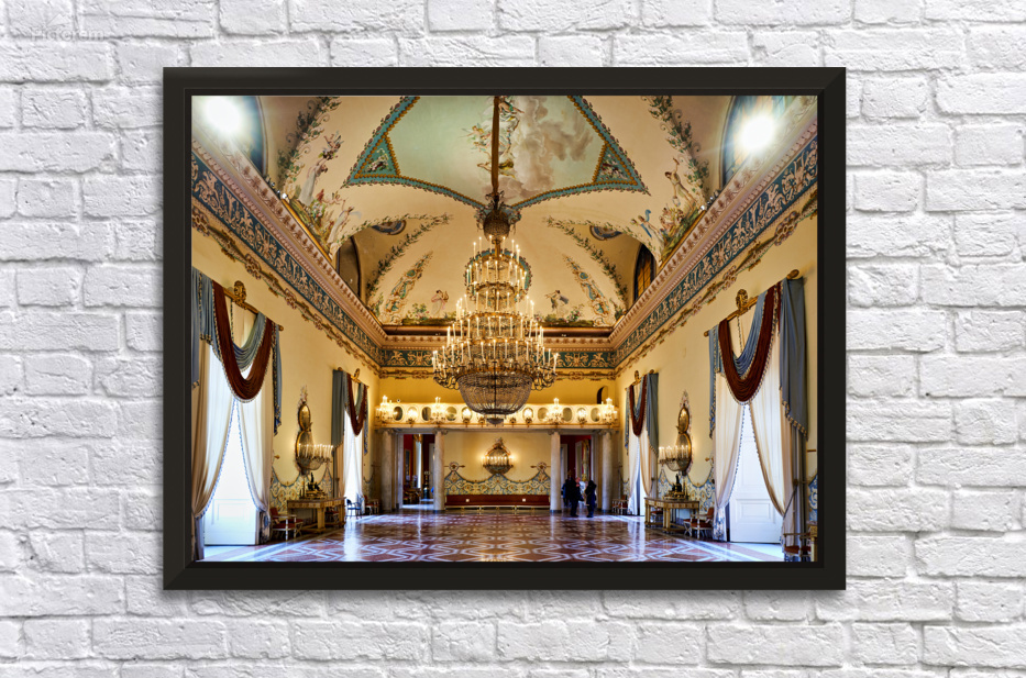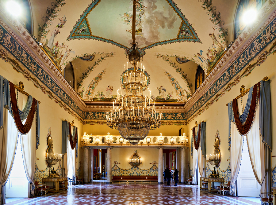 People walk inside Museo di Capodimonte in Naples. The room has a large chandelier and detailed ceiling art. The museum shows historical art.