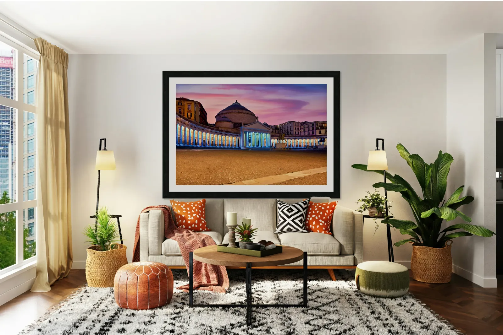 Visitors enjoy the view of Basilica di San Francesco di Paola in Piazza Plebiscito as the sun sets over Naples Italy.