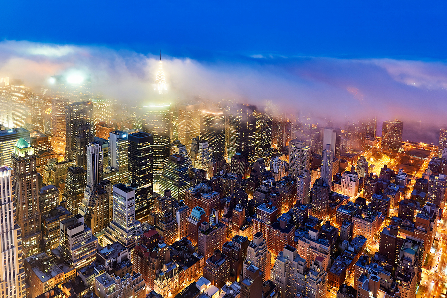 Dusk falls over Manhattan as city lights shine bright and clouds gather in the sky. The skyline showcases tall buildings and busy streets below.