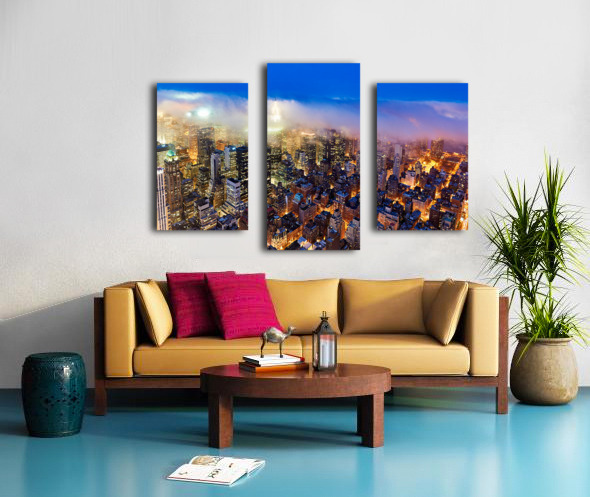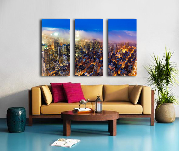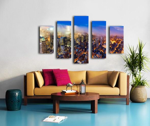 Aerial view shows Manhattan skyline at dusk with city lights Frame print