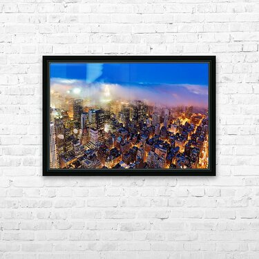 Aerial view shows Manhattan skyline at dusk with city lights Picture Frame Printing