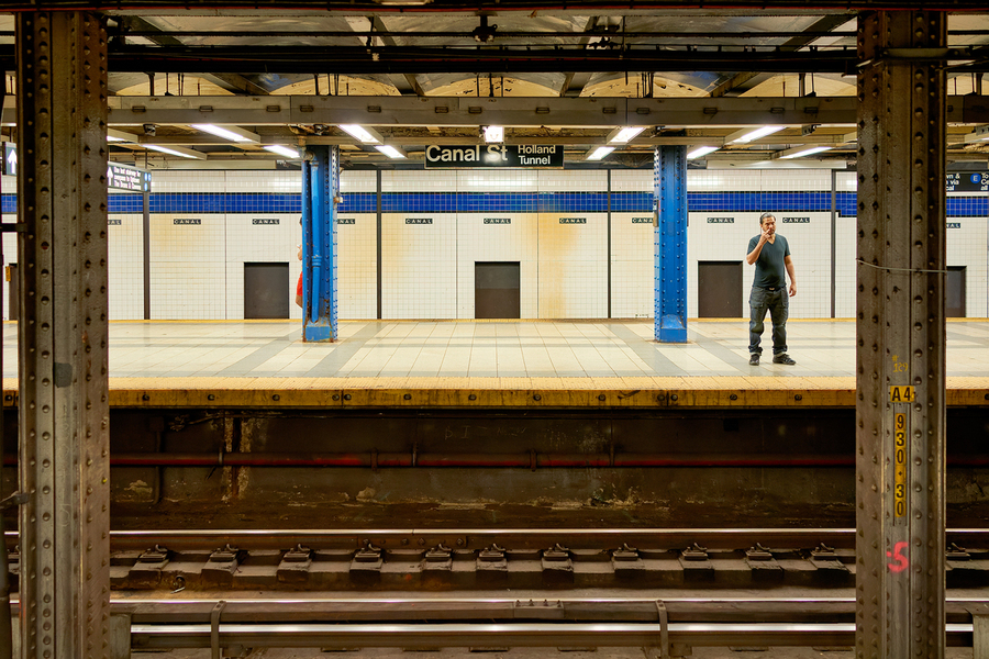 A man stands alone on the platform at Canal Street subway station in Manhattan New York. The station shows empty tracks and white tiles.