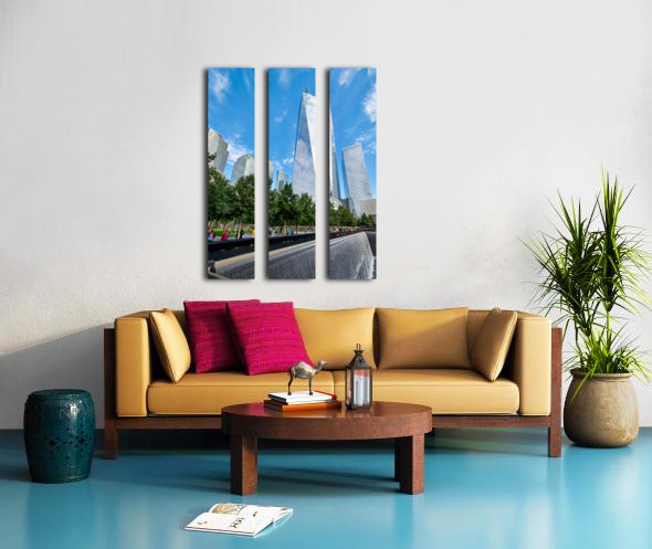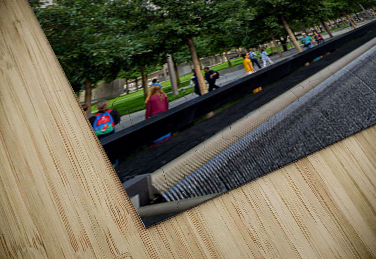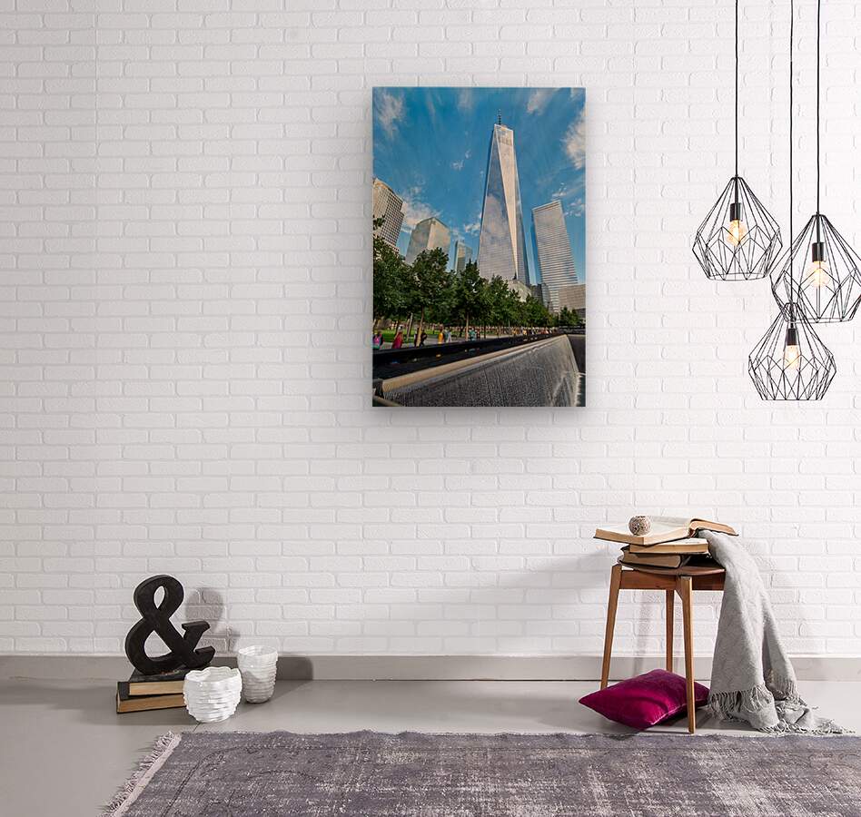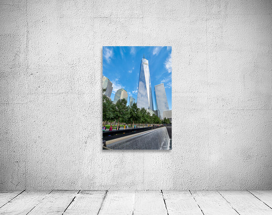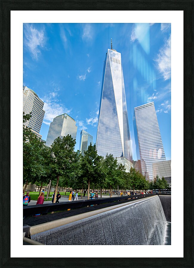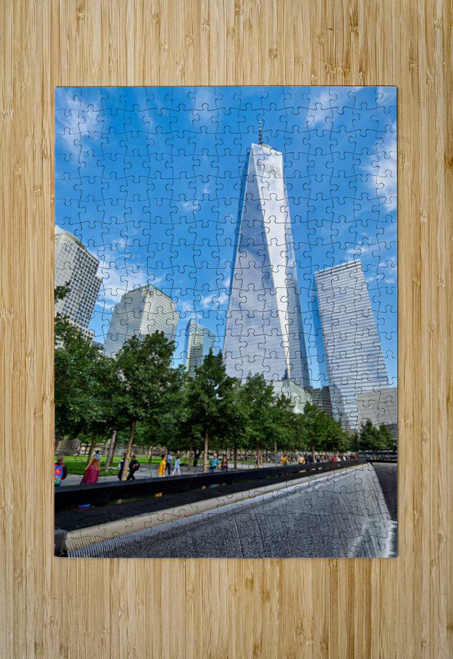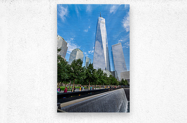 People visit the National September 11 Memorial Museum and One World Trade Center. They walk near the reflecting pools and tall buildings.