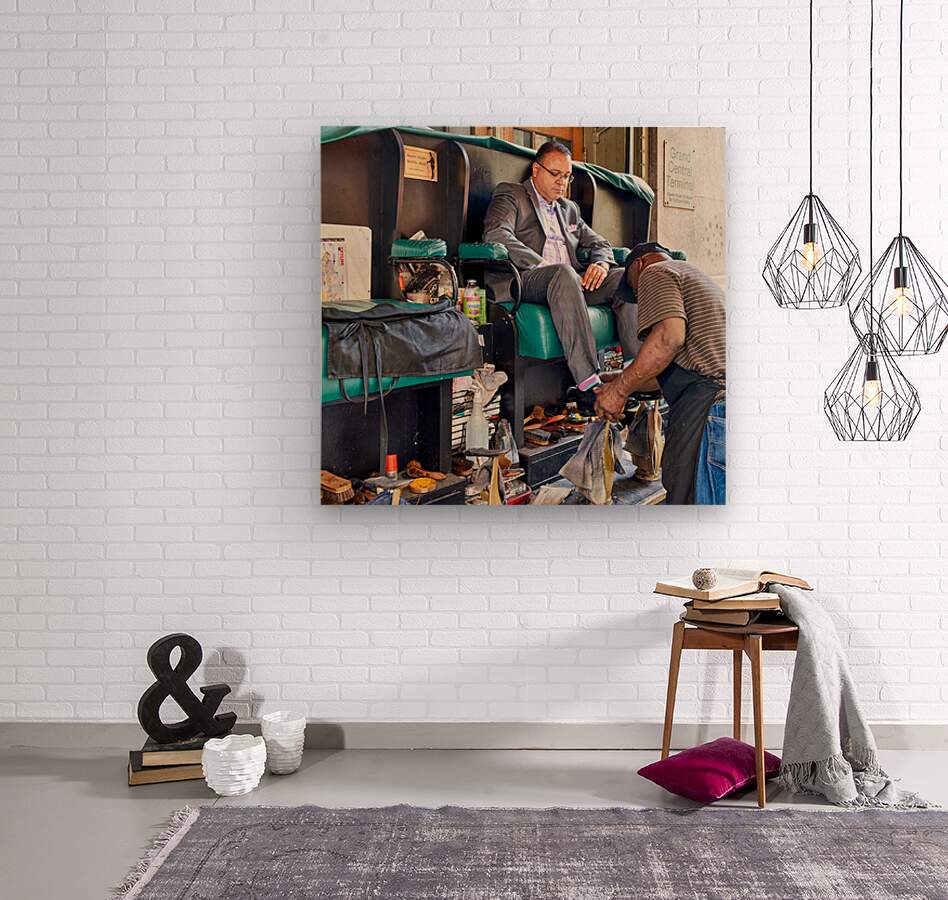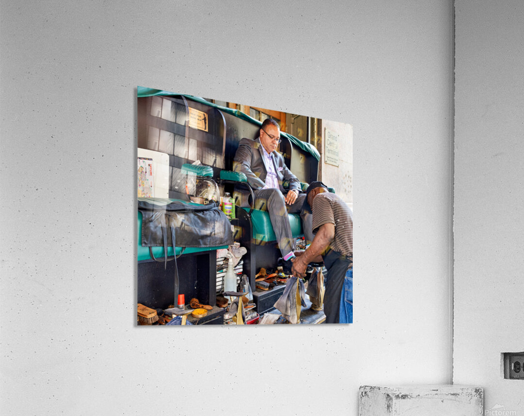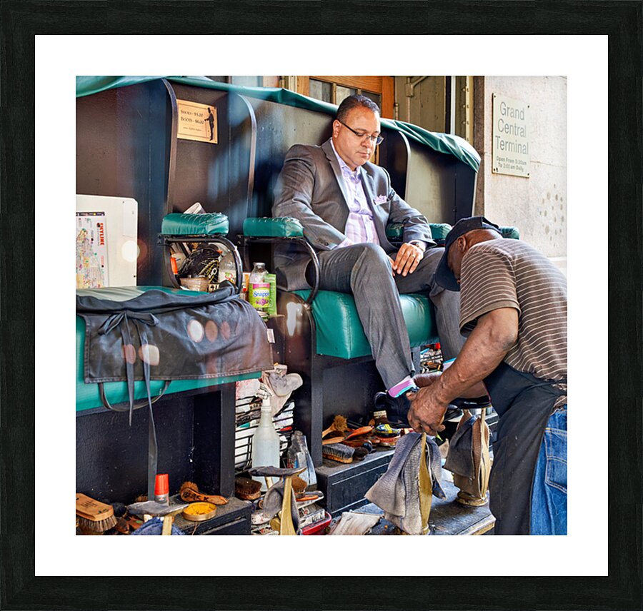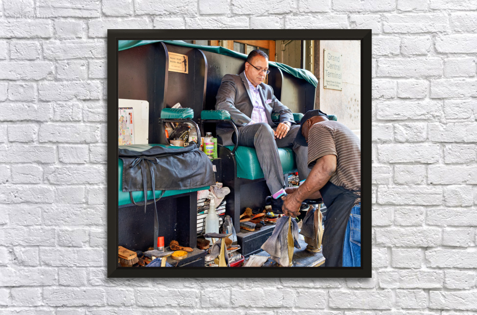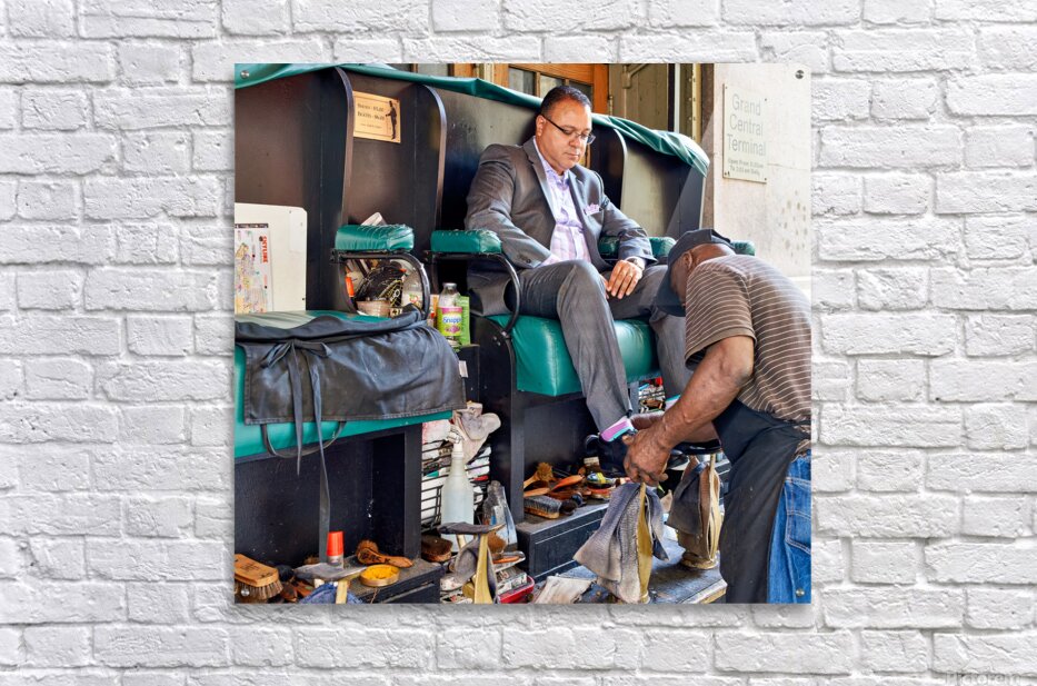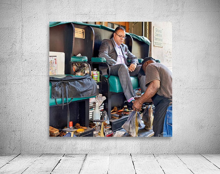 A man gets his shoes shined by a shoeshiner at Grand Central Terminal in Manhattan during the day. This is a common sight in the busy city.