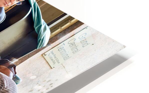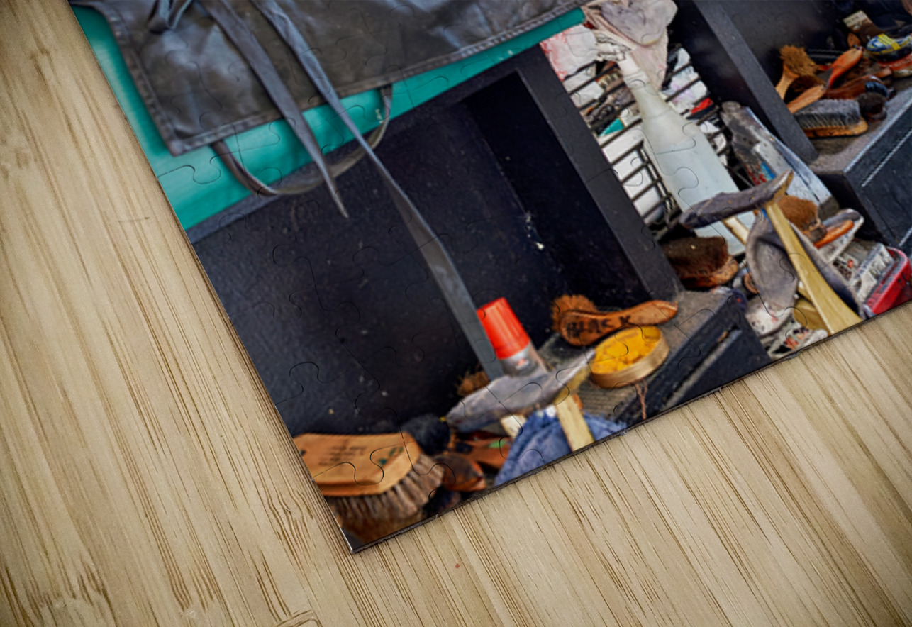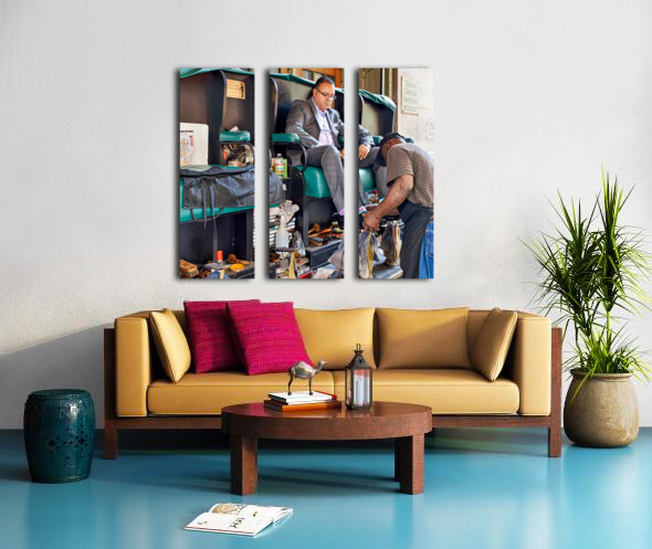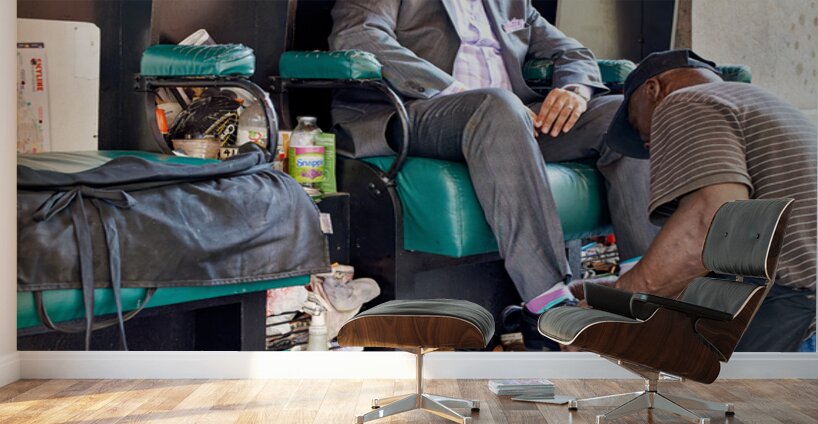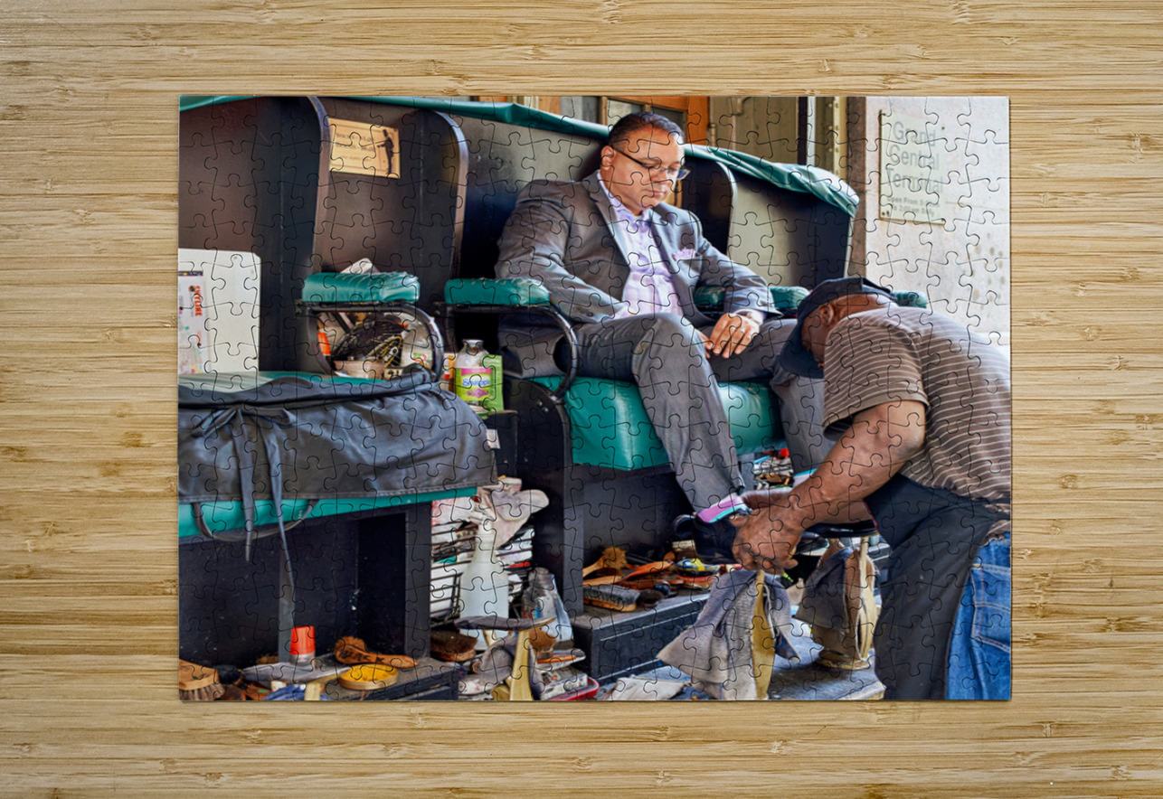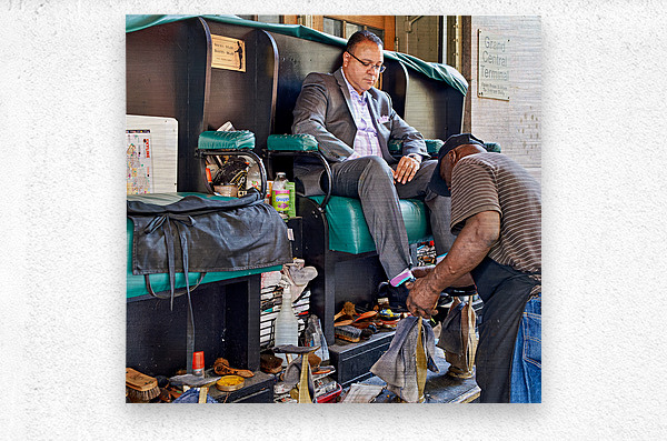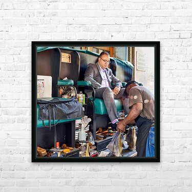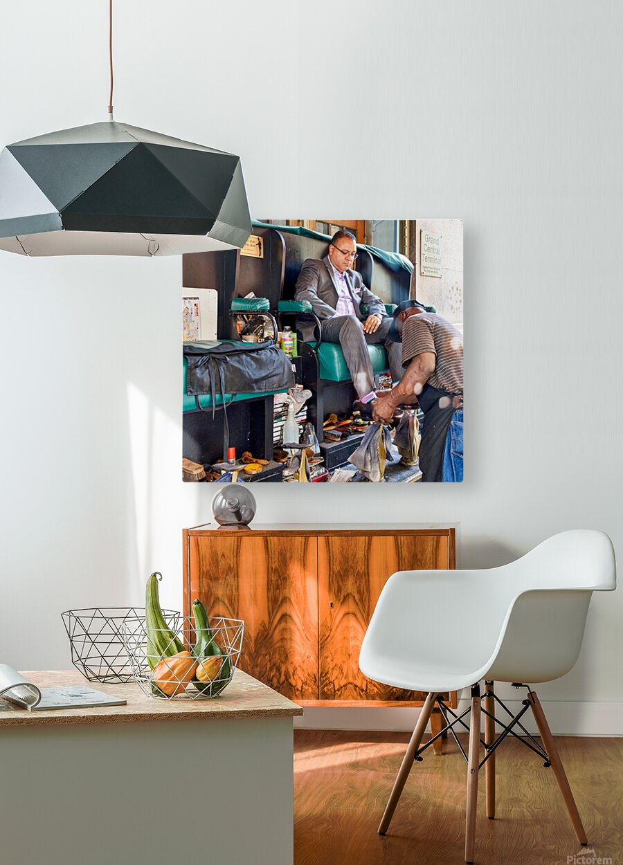 A man gets his shoes shined by a shoeshiner at Grand Central Terminal in Manhattan during the day. This is a common sight in the busy city.